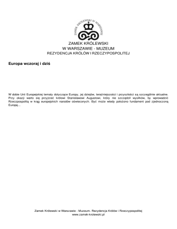 ZAMEK KRÓLEWSKI W WARSZAWIE - MUZEUM REZYDENCJA KRÓLÓW I RZECZYPOSPOLITEJ Europa wczoraj i dziś W dobie Unii Europejskiej tematy dotyczące Europy, jej dziejów, teraźniejszości i przyszłości są szczególnie aktualne. Przy okazji warto się przyjrzeć królowi Stanisławowi Augustowi, który nie szczędził wysiłków, by wprowadzić Rzeczpospolitą w krąg europejskich narodów oświeconych. Być może wtedy położono fundament pod zjednoczoną Europę... Zamek Królewski w Warszawie - Muzeum. Rezydencja Królów i Rzeczypospolitej www.zamek-krolewski.pl
