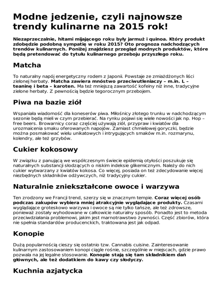 Modne jedzenie, czyli najnowsze trendy kulinarne na 2015 rok! Niezaprzeczalnie, hitami mijającego roku były jarmuż i quinoa. Który produkt zdobędzie podobną sympatię w roku 2015? Oto prognoza nadchodzących trendów kulinarnych. Poniżej znajdziesz przegląd modnych produktów, które będą pretendować do tytułu kulinarnego przeboju przyszłego roku. Matcha To naturalny napój energetyczny rodem z Japonii. Powstaje ze zmiażdżonych liści zielonej herbaty. Matcha zawiera mnóstwo przeciwutleniaczy – m.in. L – teaninę i beta – karoten. Ma też mniejszą zawartość kofeiny niż inne, tradycyjne zielone herbaty. Z pewnością będzie tegorocznym przebojem. Piwa na bazie ziół Wspaniała wiadomość dla koneserów piwa. Miłośnicy złotego trunku w nadchodzącym sezonie będą mieli w czym przebierać. Na rynku pojawi się wiele nowości jak np. Hop – free beers. Browarnicy coraz częściej używają ziół, przypraw i kwiatów dla urozmaicenia smaku oferowanych napojów. Zamiast chmielowej goryczki, będzie można posmakować wielu unikatowych i intrygujących smaków m.in. rozmarynu, kolendry, ale też grzybów. Cukier kokosowy W związku z panującą we współczesnym świecie epidemią otyłości poszukuje się naturalnych substancji słodzących o niskim indeksie glikemicznym. Należy do nich cukier wytwarzany z kwiatów kokosa. Co więcej, posiada on też zdecydowanie więcej niezbędnych składników odżywczych, niż tradycyjny cukier. Naturalnie zniekształcone owoce i warzywa Ten zrodzony we Francji trend, szerzy się w znacznym tempie. Coraz więcej osób podczas zakupów wybiera mniej atrakcyjnie wyglądające produkty. Czasami wyglądające groteskowo warzywa i owoce są nie tylko tańsze, ale też zdrowsze, ponieważ zostały wyhodowane w całkowicie naturalny sposób. Ponadto jest to metoda przeciwdziałania problemowi, jakim jest marnotrawstwo żywności. Część zbiorów, która nie spełnia standardów producenckich, traktowana jest jak odpad. Konopie Dużą popularnością cieszy się ostatnio tzw. Cannabis cuisine. Zainteresowanie kulinarnym zastosowaniem konopi ciągle rośnie, szczególnie w miejscach, gdzie prawo pozwala na jej legalne stosowanie. Konopie stają się tam składnikiem dań głównych, ale też dodatkiem do kawy czy słodyczy. Kuchnia azjatycka Można wnioskować, że absolutnym hitem w 2015 roku staną się azjatyckie specjały. W oparciu o profesjonalne badania konsumenckie można wnioskować, że absolutnym hitem staną się azjatyckie specjały. W nadchodzącym roku, według opinii specjalistów, powinny być one jednym z najbardziej popularnych wyborów żywieniowych. Jeść będziemy nie tylko sushi i ulubione dania od chińczyka z pobliskiej knajpki. Wzrostem zainteresowania cieszyć się będą tradycyjne dania takie, jak: Ramen -,,japoński rosół’’. Żądni kulinarnych przygód i nowych doświadczeń smakowych konsumenci chętniej sięgać będą po zupełnie egzotyczne dania takie, jak: potrawy z wodorostów, a osoby o mocniejszych nerwach – owady. Wędzona i fermentowana żywność Wzrost wiedzy na temat wpływu żywności na nasz stan zdrowia spowodował, że zwracamy większą uwagę na proces obróbki produktów i przygotowywania codziennych posiłków. Wędzenie i fermentowanie będą zdecydowanie najmodniejszymi technikami kulinarnymi. Dzięki nim można uzyskać niepowtarzalne smaki. Ponadto dzięki takim praktykom można zwiększyć wartość odżywczą poddawanego obróbce produktu. Teraz wędzeniu poddaje się już nie tylko mięso, sery, ale też warzywa, a nawet czekoladę. Co do naturalnie fermentowanych wyrobów spożywczych – są one nie tylko smaczne, ale też bardzo zdrowe, gdyż to naturalne probiotyki. Azjatyckie rarytasy, wymyślne napoje, a może jeszcze coś innego? Osobiście chętnie przetestuję wszelkie nowinki. A ty? Co sądzisz o tych kulinarnych przepowiedniach? Czy któryś z trendów szczególnie Cię zaintrygował? Author: Justyna Piekara Link do artykułu: http://bonavita.pl/modne-jedzenie-czyli-najnowsze-trendy-kulinarne-na2015-rok