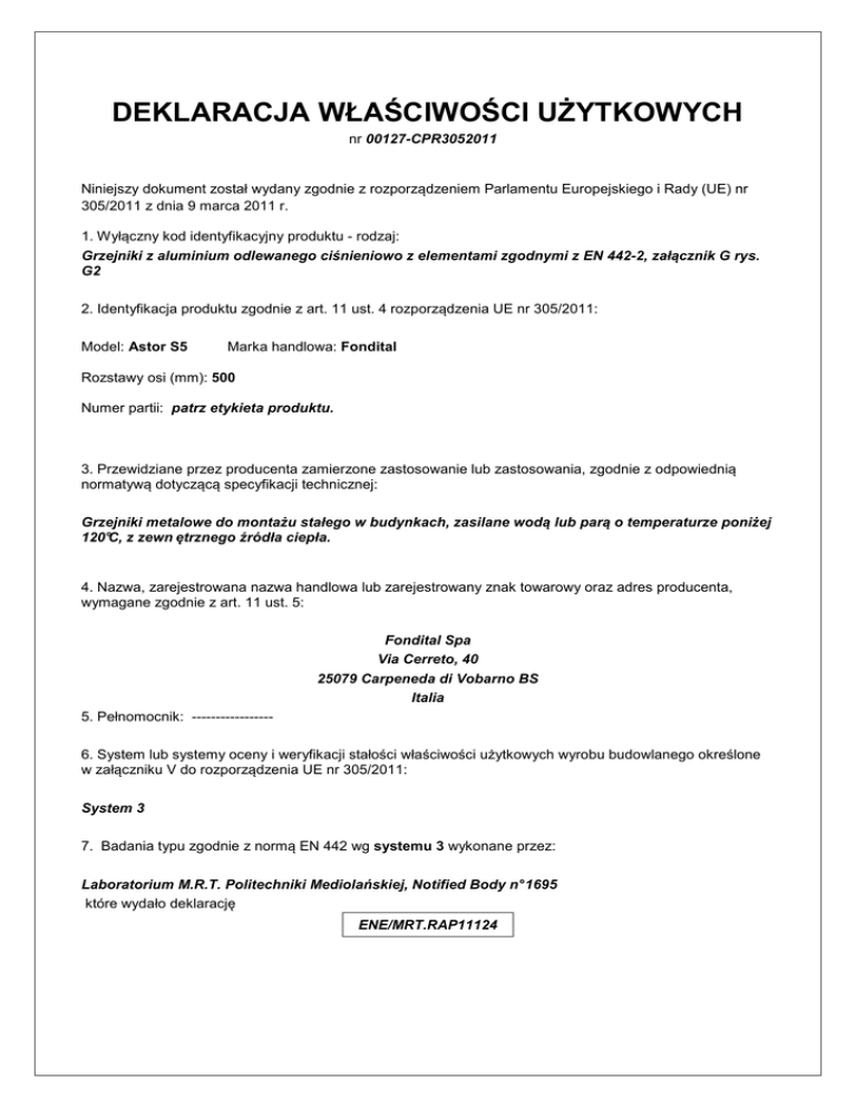 DEKLARACJA WŁAŚCIWOŚCI UŻYTKOWYCH nr 00127-CPR3052011 Niniejszy dokument został wydany zgodnie z rozporządzeniem Parlamentu Europejskiego i Rady (UE) nr 305/2011 z dnia 9 marca 2011 r. 1. Wyłączny kod identyfikacyjny produktu - rodzaj: Grzejniki z aluminium odlewanego ciśnieniowo z elementami zgodnymi z EN 442-2, załącznik G rys. G2 2. Identyfikacja produktu zgodnie z art. 11 ust. 4 rozporządzenia UE nr 305/2011: Model: Astor S5 Marka handlowa: Fondital Rozstawy osi (mm): 500 Numer partii: patrz etykieta produktu. 3. Przewidziane przez producenta zamierzone zastosowanie lub zastosowania, zgodnie z odpowiednią normatywą dotyczącą specyfikacji technicznej: Grzejniki metalowe do montażu stałego w budynkach, zasilane wodą lub parą o temperaturze poniżej 120°C, z zewn ętrznego źródła ciepła. 4. Nazwa, zarejestrowana nazwa handlowa lub zarejestrowany znak towarowy oraz adres producenta, wymagane zgodnie z art. 11 ust. 5: Fondital Spa Via Cerreto, 40 25079 Carpeneda di Vobarno BS Italia 5. Pełnomocnik: ----------------6. System lub systemy oceny i weryfikacji stałości właściwości użytkowych wyrobu budowlanego określone w załączniku V do rozporządzenia UE nr 305/2011: System 3 7. Badania typu zgodnie z normą EN 442 wg systemu 3 wykonane przez: Laboratorium M.R.T. Politechniki Mediolańskiej, Notified Body n° 1695 które wydało deklarację ENE/MRT.RAP11124 8. Nie dotyczy 9. Deklarowane właściwości użytkowe Podstawowe cechy Właściwość użytkowa Reakcja na ogień Wydzielanie niebezpiecznych substancji Próba szczelności pod ciśnieniem Temperatura powierzchniowa A1 Nie Wytrzymałość na ciśnienie ɸ 30 Znamionowa moc cieplna w W Wynik pozytywny (2400 kPa) 120°C Maks. i odpowiadaj ąca temperaturze zasilania wody Wynik pozytywny (3200 kPa) Rozstaw osi 500 60 ɸ 50 116,7 Km 0,7187 n 1,3011 Moc cieplna w różnych warunkach (krzywa charakterystyki) Zharmonizowana specyfikacja techniczna ɸ = Km x ∆T EN 442-1 n 10. Właściwości użytkowe produktu wskazanego w punktach 1 i 2 są zgodne z właściwościami użytkowymi określonymi w punkcie 9. Niniejsza deklaracja właściwości użytkowych została wydana na wyłączną odpowiedzialność producenta, wskazanego w punkcie 4. Podpisano w imieniu: Fondital Spa inż. Cavallini Roberto Kierownik Działu Technicznego Carpeneda di Vobarno, 13/06/13 . DOP Astor S5 – ed 1 del 13 giugno 2013