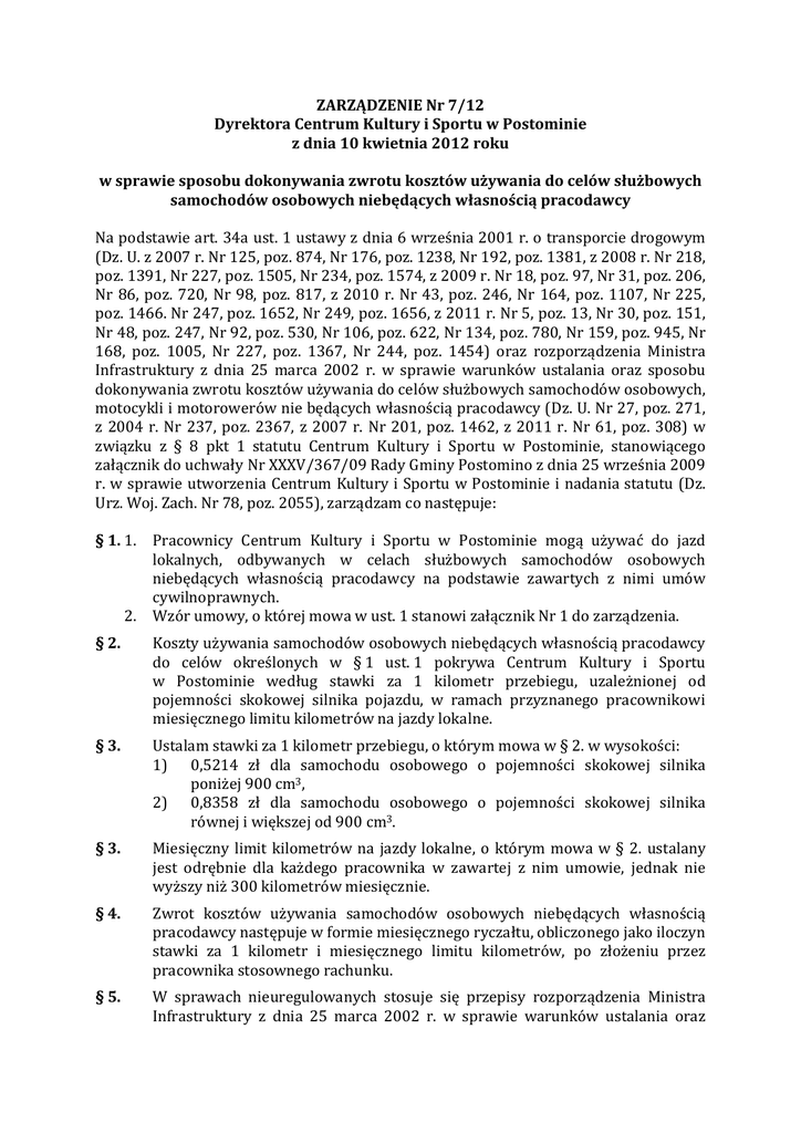 ZARZĄDZENIE Nr 7/12 Dyrektora Centrum Kultury i Sportu w Postominie z dnia 10 kwietnia 2012 roku w sprawie sposobu dokonywania zwrotu kosztów używania do celów służbowych samochodów osobowych niebędących własnością pracodawcy Na podstawie art. 34a ust. 1 ustawy z dnia 6 września 2001 r. o transporcie drogowym (Dz. U. z 2007 r. Nr 125, poz. 874, Nr 176, poz. 1238, Nr 192, poz. 1381, z 2008 r. Nr 218, poz. 1391, Nr 227, poz. 1505, Nr 234, poz. 1574, z 2009 r. Nr 18, poz. 97, Nr 31, poz. 206, Nr 86, poz. 720, Nr 98, poz. 817, z 2010 r. Nr 43, poz. 246, Nr 164, poz. 1107, Nr 225, poz. 1466. Nr 247, poz. 1652, Nr 249, poz. 1656, z 2011 r. Nr 5, poz. 13, Nr 30, poz. 151, Nr 48, poz. 247, Nr 92, poz. 530, Nr 106, poz. 622, Nr 134, poz. 780, Nr 159, poz. 945, Nr 168, poz. 1005, Nr 227, poz. 1367, Nr 244, poz. 1454) oraz rozporządzenia Ministra Infrastruktury z dnia 25 marca 2002 r. w sprawie warunków ustalania oraz sposobu dokonywania zwrotu kosztów używania do celów służbowych samochodów osobowych, motocykli i motorowerów nie będących własnością pracodawcy (Dz. U. Nr 27, poz. 271, z 2004 r. Nr 237, poz. 2367, z 2007 r. Nr 201, poz. 1462, z 2011 r. Nr 61, poz. 308) w związku z § 8 pkt 1 statutu Centrum Kultury i Sportu w Postominie, stanowiącego załącznik do uchwały Nr XXXV/367/09 Rady Gminy Postomino z dnia 25 września 2009 r. w sprawie utworzenia Centrum Kultury i Sportu w Postominie i nadania statutu (Dz. Urz. Woj. Zach. Nr 78, poz. 2055), zarządzam co następuje: § 1. 1. Pracownicy Centrum Kultury i Sportu w Postominie mogą używać do jazd lokalnych, odbywanych w celach służbowych samochodów osobowych niebędących własnością pracodawcy na podstawie zawartych z nimi umów cywilnoprawnych. 2. Wzór umowy, o której mowa w ust. 1 stanowi załącznik Nr 1 do zarządzenia. § 2. Koszty używania samochodów osobowych niebędących własnością pracodawcy do celów określonych w § 1 ust. 1 pokrywa Centrum Kultury i Sportu w Postominie według stawki za 1 kilometr przebiegu, uzależnionej od pojemności skokowej silnika pojazdu, w ramach przyznanego pracownikowi miesięcznego limitu kilometrów na jazdy lokalne. § 3. Ustalam stawki za 1 kilometr przebiegu, o którym mowa w § 2. w wysokości: 1) 0,5214 zł dla samochodu osobowego o pojemności skokowej silnika poniżej 900 cm3, 2) 0,8358 zł dla samochodu osobowego o pojemności skokowej silnika równej i większej od 900 cm3. § 3. Miesięczny limit kilometrów na jazdy lokalne, o którym mowa w § 2. ustalany jest odrębnie dla każdego pracownika w zawartej z nim umowie, jednak nie wyższy niż 300 kilometrów miesięcznie. § 4. Zwrot kosztów używania samochodów osobowych niebędących własnością pracodawcy następuje w formie miesięcznego ryczałtu, obliczonego jako iloczyn stawki za 1 kilometr i miesięcznego limitu kilometrów, po złożeniu przez pracownika stosownego rachunku. § 5. W sprawach nieuregulowanych stosuje się przepisy rozporządzenia Ministra Infrastruktury z dnia 25 marca 2002 r. w sprawie warunków ustalania oraz sposobu dokonywania zwrotu kosztów używania do celów służbowych samochodów osobowych, motocykli i motorowerów nie będących własnością pracodawcy (Dz. U. Nr 27, poz. 271 z późn. zm.). § 6. Zarządzenie podaje się do wiadomości zainteresowanym w sposób zwyczajowo przyjęty. § 7. Zarządzenie wchodzi w życie z dniem podjęcia. Załącznik Nr 1 do Zarządzenia Nr 7/12 Dyrektora Centrum Kultury i Sportu w Postominie z dnia 10 kwietnia 2012 roku -WZÓRUMOWA o używanie prywatnego samochodu do celów służbowych zawarta w dniu ....................................w Postominie pomiędzy: Centrum Kultury i Sportu w Postominie, 76-113 Postomino 97, reprezentowanym przez: Agnieszkę Czarnuch – dyrektora, zwanym dalej „Pracodawcą”, a Panem/Panią....................................................., zamieszkałym(łą) w ......................................................... ....................................................., zatrudnionym(ną) w Centrum Kultury i Sportu w Postominie, zwanym(ną) dalej „Pracownikiem”. § 1. Pracownik jako właściciel samochodu osobowego marki ………………………............., model ......................................, rok produkcji ……………….............., o numerze rejestracyjnym ..........................................., o pojemności skokowej silnika …………………..............., zwanego dalej samochodem prywatnym zobowiązuje się do jego używania do celów służbowych, związanych z działalnością Centrum Kultury i Sportu w Postominie w jazdach lokalnych, to jest w granicach administracyjnych gminy Postomino, a Pracodawca wyraża na to zgodę. § 2. Pracodawca wyznacza pracownikowi miesięczny limit przebiegu kilometrów samochodu prywatnego w jazdach lokalnych wynoszący ................. kilometrów. § 3. 1. Pracodawca zobowiązuje do zwrotu pracownikowi kosztów używania samochodu prywatnego w formie miesięcznego ryczałtu, obliczonego jako iloczyn stawki, o której mowa w § 3 zarządzenia Nr 7/12 Dyrektora Centrum Kultury i Sportu w Postominie z dnia 10 kwietnia 2012 roku w sprawie sposobu dokonywania zwrotu kosztów używania do celów służbowych samochodów osobowych niebędących własnością pracodawcy i miesięcznego limitu przebiegu kilometrów, określonego w § 2 niniejszej umowy, z zastrzeżeniem postanowień § 4 niniejszej umowy. 2. Zwrot kosztów, o których mowa w ust. 1, będzie następować w terminie 10 dni roboczych od daty złożenia przez pracownika rachunku dotyczącego używania przez niego w danym miesiącu samochodu prywatnego do celów służbowych. § 4. Miesięczny ryczałt, o którym mowa w § 3 ust. 1 niniejszej umowy, zmniejsza się o jedną dwudziestą drugą za każdy roboczy dzień nieobecności pracownika w miejscu pracy z powodu choroby, urlopu, podróży służbowej trwającej co najmniej 8 godzin lub innej nieobecnoś