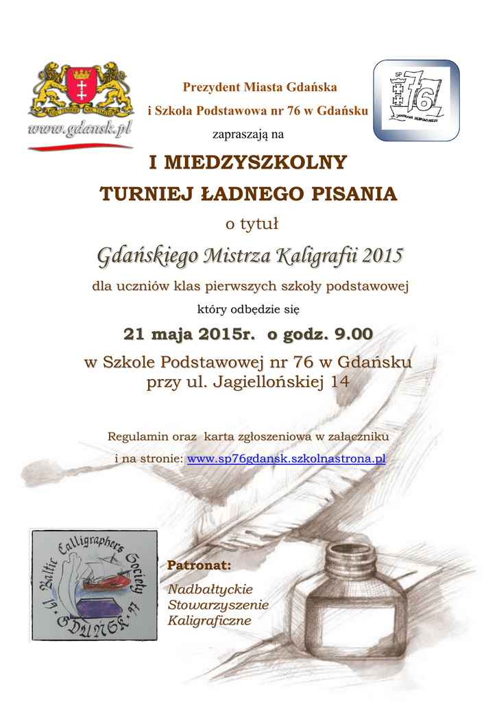 Prezydent Miasta Gdańska i Szkoła Podstawowa nr 76 w Gdańsku zapraszają na I MIEDZYSZKOLNY TURNIEJ ŁADNEGO PISANIA o tytuł Gdańskiego Mistrza Kaligrafii 2015 dla uczniów klas pierwszych szkoły podstawowej który odbędzie się 21 maja 2015r. o godz. 9.00 w Szkole Podstawowej nr 76 w Gdańsku przy ul. Jagiellońskiej 14 Regulamin oraz karta zgłoszeniowa w załączniku i na stronie: www.sp76gdansk.szkolnastrona.pl Patronat: Nadbałtyckie Stowarzyszenie Kaligraf iczne Regulamin I MIEDZYSZKOLNY TURNIEJ ŁADNEGO PISANIA dla uczniów klas pierwszych gdańskich szkół podstawowych o tytuł Gdańskiego Mistrza Kaligrafii 2015 Organizator: Prezydent Miasta Gdańska oraz Szkoła Podstawowa nr 76 w Gdańsku Patronat: Nadbałtyckie Stowarzyszenie Kaligraficzne Celem Turnieju jest: · · · · · rozpowszechnianie wśród uczniów sztuki kaligrafii, czyli sztuki pięknego pisania, rozbudzanie umiejętności kształtnego, starannego i estetycznego pisania, rozwijanie wrażliwości na piękno języka ojczystego, kształtowanie charakteru – wyrabianie cierpliwości, dokładności i spokoju, odkrywanie oraz rozwijanie zainteresowań i talentów uczniów. Warunki uczestnictwa w Turnieju: · · · · Konkurs kierowany jest do uczniów klas I gdańskich szkół podstawowych. Każda szkoła podstawowa, po wcześniejszym przeprowadzeniu eliminacji w klasach, wyznacza po jednym reprezentancie z klasy. Eliminacje szkolne odbywają się w szkołach do 15 kwietnia 2015 r. Wypełnione karty zgłoszeń (Załącznik nr 1) należy do 30 kwietnia 2015 r. przesłać do Szkoły Podstawowej nr 76 w Gdańsku faksem – 58 553 2021 lub na adres mailowy - [email protected] Organizacja i przebieg Turnieju: · Turniej odbędzie się w Szkole Podstawowej nr 76 w Gdańsku przy ul. Jagiellońskiej 14 21 maja 2015r. o godzinie 9.00. · Czas trwania konkursu: 45 minut. · Zadanie konkursowe polegać będzie na przepisaniu długopisem lub piórem tekstu przygotowanego przez organizatorów. Każdy uczestnik przepisuje ten sam tekst. Uczestnicy zgłaszają się do konkursu ze swoim długopisem lub piórem, organizator zapewnia papier w trzy linie. Kryteria oceny prac: · · · · · · · ogólne wrażenie estetyczne, umieszczenie tekstu w liniaturze, prawidłowe rozmieszczenie tekstu, czytelność, estetyka, ład, poprawność ortograficzna i interpunkcyjna, właściwe łączenie liter, równomierne położenie liter. Obowiązuje zakaz korzystania z korektorów. Komisja konkursowa i nagrody: · · · · · Rozstrzygnięcie Turnieju i wyłonienie Mistrza Kaligrafii, Wicemistrza i I Wicemistrza dokona komisja powołana przez organizatora. Rozstrzygnięcie konkursu i wręczenie nagród nastąpi w dniu konkursu. Nagrodami zostaną uhonorowani Laureaci konkursu, którzy zajmą odpowiednio miejsca I, II i III. Możliwe są również wyróżnienia. Wszyscy uczestnicy otrzymają dyplomy za udział w Turnieju. Lista nagrodzonych zostanie umieszczona na szkolnej stronie internetowej: Przepisy końcowe: · Nie przewiduje się zmiany powyższego regulaminu przez organizatorów. · Decyzje Komisji Konkursowej są ostateczne. Komisja Konkursowa sporządza protokół z konkursu, który wraz z pracami konkursowymi stanowi dokument szkolny. · Sprawy nie ujęte w regulaminie rozstrzyga Komisja Konkursowa. Dziękujemy dyrektorom szkół, nauczycielom i szkolnym komisjom za przeprowadzenie konkursu na etapie szkolnym, a uczniom życzymy powodzenia. Zapraszamy do udziału w konkursie! Organizatorzy konkursu: Beata Przekop i Anna Falana Kalendarium Turnieju: do 15 kwietnia 2015 r. – eliminacje wewnątrzszkolne, do 30 kwietnia 2015 r. – przesłanie zgłoszeń do SP 76 w Gdańsku 21 maja 2014 godz. 9.00 – I Międzyszkolny Turniej Ładnego Pisania w SP 76 w Gdańsku Szkoła Podstawowa nr 76 80-146 Gdańsk, ul. Jagiellońska 14 tel/fax 058 553 2021 e-mail: [email protected], www.sp76gda.strona.pl I MIEDZYSZKOLNY TURNIEJ ŁADNEGO PISANIA o tytuł Gdańskiego Mistrza Kaligrafii 2015 KARTA ZGŁOSZENIOWA Imię i nazwisko ucznia, klasa * (imię i nazwisko ucznia należy wpisać drukowanymi literami) 1. .................................................................................... 2. .................................................................................... 3. .................................................................................... 4. .................................................................................... 5. ..................................................................................... Nazwa i adres zgłaszającej szkoły ………………………………………………………………………………………………… ……………………………………………………………..………………………………….. nauczyciel przygotowujący ucznia............................................................................................. * po jednym uczniu z klasy wyłonionym w szkolnych eliminacjach Szkoła Podstawowa nr 76 80-146 Gdańsk, ul. Jagiellońska 14 tel/fax 058 553 2021 e-mail: [email protected], www.sp76gda.strona.pl ZGODA NA WYKORZYSTANIE WIZERYNKU DZIECKA UCZESTNIKA I MIEDZYSZKOLNEGO TURNIEJU ŁADNEGO PISANIA o tytuł Gdańskiego Mistrza Kaligrafii 2015 Wyrażam zgodę na rejestrowanie wizerunku mojego dziecka: ………………………………………………………………………………………………………………………………………….. podczas I Międzyszkolnego Turnieju Ładnego Pisania organizowanego przez Prezydenta Miasta Gdańska oraz Szkołę Podstawową Nr 76 w Gdańsku oraz wykorzystanie tego wizerunku poprzez umieszczenie zdjęć na stronie internetowej szkoły w celach informacyjnych i promocyjnych. ……………………………………………………………………………………………………………………………………………….. czytelny podpis rodzica/opiekuna prawnego Podstawa 