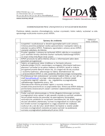 KPDA POLSKA sp. z o.o. ul. Chorzowska 108, 40-101 Katowice tel. 32 757-38-10, fax 32 757-38-14, [email protected] www.rezerwy.net.pl HARMONOGRAM PRAC ZWIĄZANYCH Z WYLICZENIEM REZERW Poniższa tabela zawiera chronologiczny wykaz czynności, które należy wykonać w celu sprawnego wyliczenia rezerw przez KPDA. Sprawy do zrobienia 1 2 3 4 5 6 Odhaczyć kiedy zrobione Uzupełnić i wydrukować w dwóch egzemplarzach wzór umowy. Umowę powinna podpisać osoba upoważniona i następnie należy ją odesłać na adres KPDA. Podpisany egzemplarz umowy przez KPDA zostanie odesłany do klienta. Przelać zgodnie z umową na rachunek KPDA zaliczkę w wysokości 50% wartości brutto zlecenia (numer rachunku bankowego KPDA: 27 1030 0019 0109 8530 0041 3730). KPDA przesyła na adres klienta arkusz z informacjami jakie dane powinien przygotować. Należy przygotować dane źródłowe w formacie arkusza kalkulacyjnego EXCEL zawierające wymagane informacje kadrowo płacowe i przesłać je na adres mailowy do KPDA. Jeżeli w trakcie przygotowywania danych okaże się, że czegoś nie da się uzyskać z systemu kadrowo -płacowego to należy skontaktować się z pracownikiem KPDA w celu ustalenia alternatywnego rozwiązania. Przefaksować lub zeskanować i przesłać mailem (faks 32 757-38-14; mail [email protected]) wyciąg z obowiązujących u klienta zasad wypłacania nagród i odpraw – np.: regulaminu wynagradzania, zakładowego regulaminu pracy, itd. Alternatywnie można przesłać raport z wyceny rezerw na świadczenia pracownicze za poprzednie lata. Wówczas KPDA dokona porównania stosowanych zasad i zamieści odpowiednią informację w raporcie. Podać wartość planowanego w firmie długoterminowego wzrostu wynagrodzeń oraz opisać w jaki sposób została ta wartość ustalona. Na przykład można się powołać na sporządzony biznesplan, wewnętrzne ustalenia ze związkami zawodowymi, itd. Jeżeli nigdzie nie jest określony planowany wzrost wynagrodzeń to wyliczyć jaki był średni wzrost wynagrodzeń w ciągu ostatnich lat (najlepiej wyliczyć do 3 lat do tyłu). Jeżeli klient nie będzie w stanie ustalić wzrostu wynagrodzeń zostanie przyjęta wartość na podstawie wzrostu wynagrodzeń podawanych przez GUS. Citi Bank Handlowy 27 1030 0019 0109 8530 0041 3730 NIP 676-23-08-188 REGON 120147813 Sąd Rejonowy w Katowicach Wydział VIII Gospodarczy KRS 246912 Kapitał zakładowy 50 000 PLN