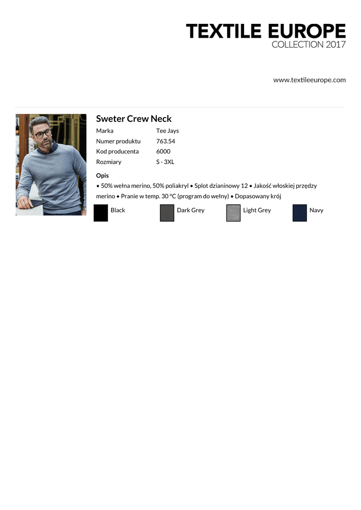 Sweter Crew Neck Marka Tee Jays Numer produktu 763.54 Kod producenta 6000 Rozmiary S - 3XL Opis • 50% wełna merino, 50% poliakryl • Splot dzianinowy 12 • Jakość włoskiej przędzy merino • Pranie w temp. 30 °C (program do wełny) • Dopasowany krój Black Dark Grey Light Grey Navy
