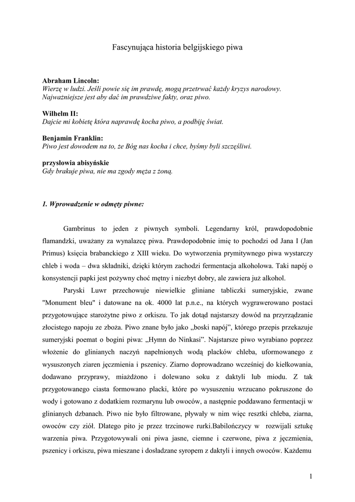 Fascynująca historia belgijskiego piwa Abraham Lincoln: Wierzę w ludzi. Jeśli powie się im prawdę, mogą przetrwać każdy kryzys narodowy. Najważniejsze jest aby dać im prawdziwe fakty, oraz piwo. Wilhelm II: Dajcie mi kobietę która naprawdę kocha piwo, a podbiję świat. Benjamin Franklin: Piwo jest dowodem na to, że Bóg nas kocha i chce, byśmy byli szczęśliwi. przysłowia abisyńskie Gdy brakuje piwa, nie ma zgody męża z żoną. 1. Wprowadzenie w odmęty piwne: Gambrinus to jeden z piwnych symboli. Legendarny król, prawdopodobnie flamandzki, uważany za wynalazcę piwa. Prawdopodobnie imię to pochodzi od Jana I (Jan Primus) księcia brabanckiego z XIII wieku. Do wytworzenia prymitywnego piwa wystarczy chleb i woda – dwa składniki, dzięki którym zachodzi fermentacja alkoholowa. Taki napój o konsystencji papki jest pożywny choć mętny i niezbyt dobry, ale zawiera już alkohol. Paryski Luwr przechowuje niewielkie gliniane tabliczki sumeryjskie, zwane "Monument bleu" i datowane na ok. 4000 lat p.n.e., na których wygrawerowano postaci przygotowujące starożytne piwo z orkiszu. To jak dotąd najstarszy dowód na przyrządzanie złocistego napoju ze zboża. Piwo znane było jako „boski napój”, którego przepis przekazuje sumeryjski poemat o bogini piwa: „Hymn do Ninkasi”. Najstarsze piwo wyrabiano poprzez włożenie do glinianych naczyń napełnionych wodą placków chleba, uformowanego z wysuszonych ziaren jęczmienia i pszenicy. Ziarno doprowadzano wcześniej do kiełkowania, dodawano przyprawy, miażdżono i dolewano soku z daktyli lub miodu. Z tak przygotowanego ciasta formowano placki, które po wysuszeniu wrzucano pokruszone do wody i gotowano z dodatkiem rozmarynu lub owoców, a następnie poddawano fermentacji w glinianych dzbanach. Piwo nie było filtrowane, pływały w nim więc resztki chleba, ziarna, owoców czy ziół. Dlatego pito je przez trzcinowe rurki.Babilończycy w rozwijali sztukę warzenia piwa. Przygotowywali oni piwa jasne, ciemne i czerwone, piwa z jęczmienia, pszenicy i orkiszu, piwa mieszane i dosładzane syropem z daktyli i innych owoców. Każdemu 1 obywatelowi Babilonii przysługiwały dziennie trzy litry piwa, a osobom wysoko postawionym nawet pięć litrów 2 3 4 3. Belgia piwem stoi! Choć pierwsze wzmianki o pojawieniu się piwa w Brabancji pochodzą z 1200 roku, wiemy, że historia piwa w tym regionie jest dużo starsza. Warzyli je w końcu już średniowieczni mnisi, dla których piwo -w przeciwieństwie do wina- stanowiło element codziennych posiłków: pito je według potrzeby (ad necessitam), ale bez przesady (ad voluptatem). W przyklasztornych browarach od samego początku sporządzano piwo wysokiej jakości, a od czasów św. Bernarda z Clairvaux i rozwoju cystersów, także w zakładanych przez nich gospodach. O sile tradycji klasztornego piwa w Brabancji świadczy fakt, że spośród sześciu istniejących do dziś klasztorów trapistów (Zakonu Cystersów Reformowanych, czyli Ściślejszej Obserwancji) aż pięć z nich zajmuje się piwowarstwem. Do klasztornych piw górnej fermentacji należą gatunki: „Chimay”, „Orval”, „Rochefort”, „Westmalle”, „Westvleteren”. Na XIV i XV wiek przypada gwałtowny rozwój flandryjskich i walońskich miast, a co za tym idzie, także świeckich browarów. Brugia, Antwerpia, Bruksela, Tournai i Legie były w tych stuleciach nie tylko centrami kultury i polityki, ale także handlu: dzięki licznym, krzyżującym się szlakom handlowym, brabanckie miasta miały zapewniony dostęp do nowych technologii w browarnictwie, które gwarantowały im trwałe piwne prosperity. Powstałe w tym czasie browary w Den Horen, czy w Artois, są tego żywym potwierdzeniem. W czasach renesansu założone jeszcze w XIII wieku cechy piwowarskie, wzbogaciły się tak bardzo, że stulecie, w którym powstało “Maison des Brasseurs”, nazywa się złotą erą piwowarstwa. Dobra passa belgijskiego browarnictwa trwała aż do czasów Wielkiej Rewolucji Francuskiej, kiedy to w imię „Wolności, Równości i Braterstwa” zniesiono cechy piwowarskie i przystąpiono równania z ziemią klasztorów i opactw, kończąc tym samym długi rozdział dominacji klasztornego piwa. Po ekscesach Francuskiej Rewolucji belgijski przemysł piwny został reaktywowany przez Napoleona na początku XIX wieku. Około 1900 roku w Belgii istniało 3223 browarów, spośród których warto wymienić browar Wielemana w Brukseli, który był największym i najbardziej nowoczesnym browarem w Europie. Niestety, obie wojny światowe spowodowały poważne spustoszenia w brabanckim browarnictwie. Po zakończeniu II wojny światowej, w 1946 roku na terenie Belgii działało już tylko 775 browarów. Od tamtej pory wiele mniejszych zakładów upadało albo zostało przejętych przez wielkie koncerny, tak że już w 1983 roku liczba browarów spadła do 134. Współcześnie browary te oferują około 500 produktów. 5 Kolejne strony nie są dostępne. 6