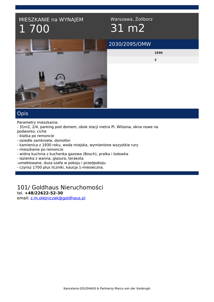 MIESZKANIE na WYNAJEM 1 700 Warszawa, Żoliborz 31 m2 2030/2095/OMW 1930 2 Opis Parametry mieszkania: - 31m2, 2/4, parking pod domem, obok stacji metra Pl. Wilsona, okna nowe na podworko, ciche - klatka po remoncie - osiedle zamkniete, domofon - kamienica z 1930 roku, woda miejska, wymienione wszystkie rury - mieszkanie po remoncie - widna kuchnia z kuchenka gazowa (Bosch), pralka i lodowka - lazienka z wanna, glazura, terakota -umeblowane, duza szafa w pokoju i przedpokoju - czynsz 1700 plus liczniki, kaucja 1-miesieczna. 101/ Goldhaus Nieruchomości tel. +48/22622-52-30 email: [email protected] Kancelaria GOLDHAUS & Partnerzy Marco von der Vanbrugh Powered by TCPDF (www.tcpdf.org)
