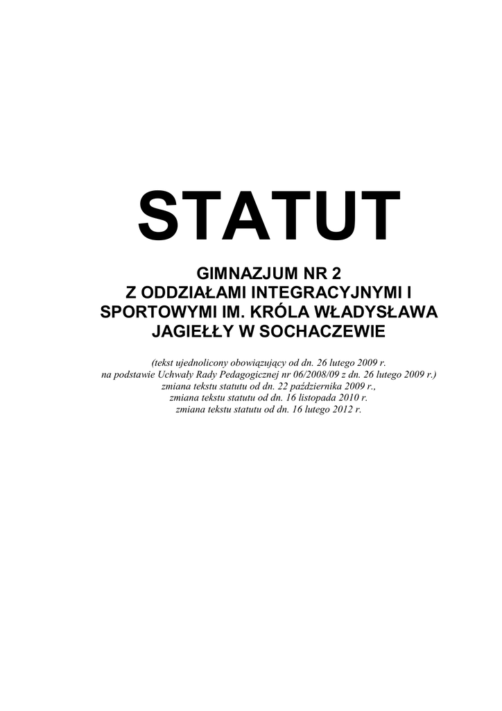 STATUT GIMNAZJUM NR 2 Z ODDZIAŁAMI INTEGRACYJNYMI I SPORTOWYMI IM. KRÓLA WŁADYSŁAWA JAGIEŁŁY W SOCHACZEWIE (tekst ujednolicony obowiązujący od dn. 26 lutego 2009 r. na podstawie Uchwały Rady Pedagogicznej nr 06/2008/09 z dn. 26 lutego 2009 r.) zmiana tekstu statutu od dn. 22 października 2009 r., zmiana tekstu statutu od dn. 16 listopada 2010 r. zmiana tekstu statutu od dn. 16 lutego 2012 r. SPIS TREŚCI Dział I POSTANOWIENIA OGÓLNE............................................................................................................. 4 Rozdział 1 Prawne podstawy działalności...................................................................................... 4 Rozdział 2 Przepisy definiujące..................................................................................................... 4 Rozdział 3 Nazwa Szkoły i inne informacje o Szkole..................................................................... 5 Rozdział 4 Cele i zadania Szkoły.................................................................................................. 6 Dział II ZARZĄDZANIE SZKOŁĄ.................................................................................................................. 8 Rozdział 1 Zagadnienia podstawowe ............................................................................................. 8 Rozdział 2 Dyrektor Szkoły........................................................................................................... 9 Rozdział 3 Inne stanowiska kierownicze...................................................................................... 11 Rozdział 4 Rada Pedagogiczna.................................................................................................... 11 Rozdział 5 Rada Szkoły .............................................................................................................. 12 Rozdział 6 Rada Rodziców.......................................................................................................... 15 Rozdział 7 Samorząd Uczniowski ............................................................................................... 16 Dział III ORGANIZACJA SZKOŁY .............................................................................................................. 17 Rozdział 1 Planowanie działalności Szkoły ................................................................................. 17 Rozdział 2 Formy prowadzenia działalności dydaktyczno - wychowawczej ................................. 18 Rozdział 3 Świetlica szkolna ....................................................................................................... 19 Rozdział 4 Biblioteka szkolna ..................................................................................................... 20 Dział IV NAUCZYCIELE I INNI PRACOWNICY SZKOŁY......................................................................... 21 Rozdział 1 Zagadnienia podstawowe ........................................................................................... 21 Rozdział 2 Zakres zadań nauczycieli - przepisy ogólne. ............................................................... 21 Rozdział 3 Zakres zadań wychowawcy........................................................................................ 23 Rozdział 4 Udzielanie i organizacja pomocy psychologiczno-pedagogicznej................................ 24 Dział V WSPÓŁDZIAŁANIE ORGANÓW SZKOŁY .................................................................................... 26 Rozdział 1 Kompetencje organów szkoły .................................................................................... 26 Rozdział 2 Zasady rozwiązywania spraw spornych i konfliktów .................................................. 27 Dział VI UCZNIOWIE ................................................................................................................................... 28 Rozdział 1 Zasady rekrutacji uczniów ......................................................................................... 28 Rozdział 2 Prawa i obowiązki ucznia........................................................................................... 30 Rozdział 3 Ocenianie, klasyfikowanie i promowanie uczniów...................................................... 31 Dział VII Gospodarka mieniem i finansami ..................................................................................................... 32 Rozdział 1 Mienie i rachunkowość .............................................................................................. 32 Rozdział 2 System kontroli wewnętrznej ..................................................................................... 32 Dział VIII PRZEPISY PORZĄDKOWE ......................................................................................................... 33 Dział IX POSTANOWIENIA KOŃCOWE..................................................................................................... 34 2 Niniejszy Statut oparty jest na zasadach zawartych w Konstytucji Rzeczypospolitej Polskiej, a także zgodny ze wskazaniami zawartymi w Powszechnej Deklaracji Praw Człowieka, Międzynarodowym Pakcie Praw Obywatelskich i Politycznych oraz Konwencji o Prawach Dziecka. Nauczanie i wychowanie - respektując chrześcijański system wartości - za podstawę przyjmuje uniwersalne zasady etyki. 3 Dział I POSTANOWIENIA OGÓLNE Rozdział 1 Prawne podstawy działalności Gimnazjum nr 2 z Oddziałami Integracyjnymi i Sportowymi im. Króla Władysława Jagiełły w Sochaczewie działa na podstawie: 1. Ustawy z dnia 8 marca 1990 roku o samorządzie gminnym (Dz. U. z 1996 roku Nr 13, poz. 74 z późn. zm.) 2. Ustawy z dnia 7 września 1991 roku o systemie oświaty (Dz. U. z 1996 roku Nr 67, poz. 329 z późn. zm.). 3. Ustawy z dnia 30 czerwca 2005 roku o finansach publicznych (Dz. U. Nr 249, poz. 2104) 4. Uchwały Nr VI/55/99 Rady Miasta Sochaczew