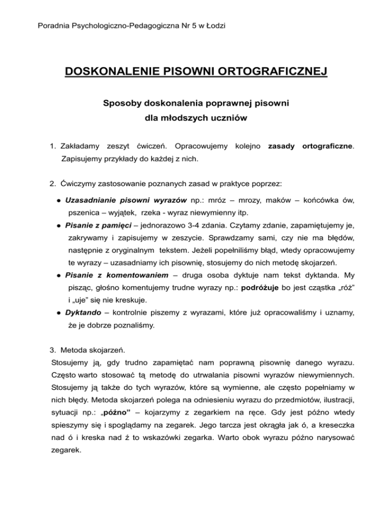 Poradnia Psychologiczno-Pedagogiczna Nr 5 w Łodzi DOSKONALENIE PISOWNI ORTOGRAFICZNEJ Sposoby doskonalenia poprawnej pisowni dla młodszych uczniów 1. Zakładamy zeszyt ćwiczeń. Opracowujemy kolejno zasady ortograficzne. Zapisujemy przykłady do każdej z nich. 2. Ćwiczymy zastosowanie poznanych zasad w praktyce poprzez: Uzasadnianie pisowni wyrazów np.: mróz – mrozy, maków – końcówka ów, pszenica – wyjątek, rzeka - wyraz niewymienny itp. Pisanie z pamięci – jednorazowo 3-4 zdania. Czytamy zdanie, zapamiętujemy je, zakrywamy i zapisujemy w zeszycie. Sprawdzamy sami, czy nie ma błędów, następnie z oryginalnym tekstem. Jeżeli popełniliśmy błąd, wtedy opracowujemy te wyrazy – uzasadniamy ich pisownię, stosujemy do nich metodę skojarzeń. Pisanie z komentowaniem – druga osoba dyktuje nam tekst dyktanda. My pisząc, głośno komentujemy trudne wyrazy np.: podróżuje bo jest cząstka „róż” i „uje” się nie kreskuje. Dyktando – kontrolnie piszemy z wyrazami, które już opracowaliśmy i uznamy, że je dobrze poznaliśmy. 3. Metoda skojarzeń. Stosujemy ją, gdy trudno zapamiętać nam poprawną pisownię danego wyrazu. Często warto stosować tą metodę do utrwalania pisowni wyrazów niewymiennych. Stosujemy ją także do tych wyrazów, które są wymienne, ale często popełniamy w nich błędy. Metoda skojarzeń polega na odniesieniu wyrazu do przedmiotów, ilustracji, sytuacji np.: „późno” – kojarzymy z zegarkiem na ręce. Gdy jest późno wtedy spieszymy się i spoglądamy na zegarek. Jego tarcza jest okrągła jak ó, a kreseczka nad ó i kreska nad ź to wskazówki zegarka. Warto obok wyrazu późno narysować zegarek. Poradnia Psychologiczno-Pedagogiczna Nr 5 w Łodzi UWAGA! Ćwiczymy codziennie. Tylko systematyczna praca może przynieść oczekiwane efekty. Zalecamy poświęcić ortografii około pół godziny dziennie. Po dojściu do wprawy w przeprowadzaniu ćwiczeń czas pracy z pewnością ulegnie skróceniu. Sposoby doskonalenia poprawnej pisowni dla starszych uczniów Tygodniowe ćwiczenie poprawnej pisowni – praca samodzielna I. Przygotowanie: 1. Załóż zeszyt do ćwiczeń ortograficznych. 2. Powtórz i utrwal zasady pisowni. 3. Na końcu zeszytu załóż „ Słowniczek Trudnych Wyrazów”. II Pisanie z pamięci - co dzień: 1. Przeczytaj uważnie wybrany przez siebie lub wskazany przez nauczyciela, fragment tekstu / ok. 5 wyrazów w zdaniu /. 2. Przeczytaj pierwsze zdanie zapamiętując tekst i pisownię wyrazów, uzasadnij pisownię trudnych wyrazów. 3. Powiedz tekst z pamięci. 4. Przeczytaj powtórnie zdanie sprawdzając, czy dobrze zapamiętałeś. 5. Napisz tekst z pamięci. 6. Sprawdź zapis i nanieś poprawki. 7. Porównaj zapis ze zdaniem wzorcowym i nanieś poprawki. 8. Zakryj zdanie wzorcowe i napisane. 9. Napisz powtórnie to samo zdanie. 10. Sprawdź zapis. III Poprawa błędów: 1. Wypisz wyrazy, w których popełniłeś błąd i uzasadnij poprawną pisownię. 2. Wyrazy te zastosuj w krzyżówce, ułóż z nimi zdania, utwórz rodzinę wyrazów pokrewnych, wykonaj ćwiczenia utrwalające pisownię. 3. Wpisz je do „Słownika Trudnych Wyrazów”. IV Sprawdzian – co tydzień: 1. Pracuj codziennie, zapisując datę przy wykonywanych ćwiczeniach. 2. Po tygodniu ćwiczeń poproś kogoś, aby podyktował ci zdanie, które codziennie pisałeś. Poradnia Psychologiczno-Pedagogiczna Nr 5 w Łodzi 3. Sprawdź, o ile błędów mniej zrobiłeś niż poprzednio i popraw je /wg wzoru/. V Po każdym tygodniu ćwiczeń pokaż zeszyt nauczycielowi. PRZYKŁADOWE ĆWICZENIA DLA DZIECI, KTÓRE PISZĄ Z BŁĘDAMI ORTOGRAFICZNYMI: 1. Zapoznanie się z zasadami ortografii (znajdują się w słowniku ortograficznym, podręcznikach w wydzielonych ramkach). 2. Przerabianie ćwiczeń utrwalających (zeszyty ćwiczeń, podręczniki do ortografii). Ćwiczenia te powinny być wykonywane pod kontrolą rodziców. 3. Przepisywanie tekstów z lukami (uzupełnianie odpowiednimi literami ó, u, ż, rz, ch, h i inne), np.: Chodzą je_e koło wie_y. Spotkał je tam pewien Je_yk. Je_e kolce naje_yły. Je_yk zmyka z całej siły. 4. Podkreślanie w tekstach wyrazów ze wskazana literą, np. ó: Góral ci ja góral, w górach wychowany. Mam skórzane kierpce, serdak wyszywany. 5. Wypisywanie z tekstu wyrazów z wybraną trudnością, np. rz, ch, si, itp. 6. Przekształcanie przepisywanego tekstu (ze zmianą np. rodzaju gramatycznego, liczby pojedynczej na mnogą, przypadku, czasu lub osoby). 7. Pisanie z pamięci (autodyktando) - dziecko obserwuje wyraz, zapamiętuje go, a następnie zakrywa tekst i pisze go z pamięci. Po przepisaniu sprawdza, czy poprawnie zapisało wyraz. Poradnia Psychologiczno-Pedagogiczna Nr 5 w Łodzi 8. Pisanie z komentowaniem - dziecko pisze dyktowane przez rodziców wyrazy z równoczesną analizą ich pisowni. 9. Pisanie ze słuchu (dyktando) - pisanie sylab, wyrazów i zdań czytanych powoli i wyraźnie przez rodziców, ale wcześniej utrwalonych w trakcie ćwiczeń. 10. Rozwiązywanie rebusów, krzyżówek, zagadek znajdujących się w „ćwiczeniówkach” do ortografii. UWAGA! Należy uczyć dziecko, żeby nie przepisywało mechanicznie. Wyrazy powinno przepisywać w całości, a nie cząstkami. Konieczne jest kształtowanie autokontroli i korekty pracy poprzez sprawdzanie poprawności przepisywanego tekstu i ewentualne samodzielne poprawianie błędów. Wyrazy z błędami powinny być analizowane i uzasadniane regułami ortograficznymi, np.: naród – narody, mrówka – ówka, zasuwka – wyjątek, król – wyraz niewymienny, wierzyć – wiara, brzoza – rz po b, krzesło – rz po k, trzeba – rz po t, lekarz – zakończenie arz w zawodach, rzeka – wyraz niewymienny, mucha – muszka, schronisko – ch po s, strach – ch na końcu, druh – wyjątek. Opracowała Marta Grąbkowska
