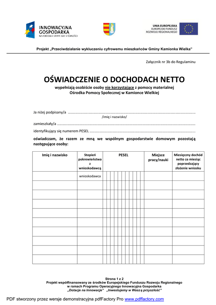 Projekt „Przeciwdziałanie wykluczeniu cyfrowemu mieszkańców Gminy Kamionka Wielka” Załącznik nr 3b do Regulaminu OŚWIADCZENIE O DOCHODACH NETTO wypełniają osobiście osoby nie korzystające z pomocy materialnej Ośrodka Pomocy Społecznej w Kamionce Wielkiej Ja niżej podpisany/a …………………………………………………………………..………………………………………………………………… /imię i nazwisko/ zamieszkały/a ………………………………………………………………………………………………………………………………………………… identyfikujący się numerem PESEL ……………………………………………………………………………………………………………... oświadczam, że razem ze mną we wspólnym gospodarstwie domowym pozostają następujące osoby: Imię i nazwisko Stopień pokrewieństwa z wnioskodawcą PESEL Miejsce pracy/nauki Miesięczny dochód netto za miesiąc poprzedzający złożenie wniosku wnioskodawca Strona 1 z 2 Projekt współfinansowany ze środków Europejskiego Funduszu Rozwoju Regionalnego w ramach Programu Operacyjnego Innowacyjna Gospodarka „Dotacje na Innowacje” „Inwestujemy w Wasz ą przyszłość” PDF stworzony przez wersje demonstracyjna pdfFactory Pro www.pdffactory.com Projekt „Przeciwdziałanie wykluczeniu cyfrowemu mieszkańców Gminy Kamionka Wielka” Oświadczam, że wysokość miesięcznego dochodu netto w przeliczeniu na jedną osobę pozostającą ze mną we wspólnym gospodarstwie domowym – wyliczona za ostatni miesiąc ………………..……….. rok …………………, poprzedzający miesiąc złożenia formularza zgłoszeniowego – wynosi ......................................zł (słownie złotych:…………………......................................................................). Świadomy/a odpowiedzialności karnej przewidzianej w art. 233 ustawy z dnia 6 czerwca 1997 r. Kodeks karny (Dz.U. Nr 88, poz. 553 z poźn. zm.) potwierdzam własnoręcznym podpisem prawdziwość danych zamieszczonych w niniejszym oświadczeniu . ……………………………………………..…………………… /miejscowość, data/ …………………………………………………………..……………… /czytelny podpis Wnioskodawcy/ INFORMACJA Sposób wyliczenia przeciętnego dochodu netto: przeciętny miesięczny dochód netto na jedną osobę = łączny dochód netto liczba osób w gospodarstwie domowym 1. Za dochód uważa się sumę miesięcznych przychodów z miesiąca poprzedzającego złożenie wniosku lub w przypadku utraty dochodu z miesiąca, w którym wniosek został złożony, bez względu na tytuł i źródło ich uzyskania, jeżeli ustawa nie stanowi inaczej, pomniejszoną o: a) miesięczne obciążenie podatkiem dochodowym od osób fizycznych, b) składki na ubezpieczenie zdrowotne określone w przepisach o powszechnym ubezpieczeniu w Narodowym Funduszu Zdrowia oraz ubezpieczenia społeczne określone w odrębnych przepisach, c) kwotę bieżących alimentów świadczonych na rzecz innych osób. Do dochodu nie wlicza się jednorazowego pieniężnego świadczenia socjalnego oraz wartości świadczeń w naturze. 2. Wnioskodawca zobowiązany jest dostarczyć dowody potwierdzające wysokość uzyskiwanych dochodów np.: − zaświadczenie z zakładu pracy o zarobkach netto uzyskanych przez cz łonków gospodarstwa domowego za miesiąc poprzedzający złożenie wniosku, − odcinek od renty lub emerytury za miesiąc poprzedzający złożenie wniosku (wydruk elektroniczny z banku), − zaświadczenie o wielkości gospodarstwa rolnego lub nakaz płatniczy podatku rolnego (1 ha przeliczeniowy odpowiada 250,00 zł miesięcznie), − w przypadku osób bezrobotnych zaświadczenie z urzędu pracy (o zarejestrowaniu bądź o wysokości zasiłku netto), − zaświadczenie z pracy dorywczej, − oświadczenie o wysokości otrzymanych alimentów (potwierdzone przekazem pocztowym, wyciągiem bankowym itp.), − zaświadczenie z urzędu skarbowego o osiągniętym dochodzie z innych źródeł (działalność gospodarcza). Strona 2 z 2 Projekt współfinansowany ze środków Europejskiego Funduszu Rozwoju Regionalnego w ramach Programu Operacyjnego Innowacyjna Gospodarka „Dotacje na Innowacje” „Inwestujemy w Wasz ą przyszłość” PDF stworzony przez wersje demonstracyjna pdfFactory Pro www.pdffactory.com