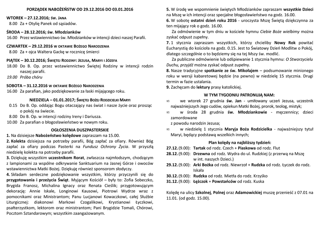 PORZĄDEK NABOŻEŃSTW OD 29.12.2016 DO 03.01.2016 WTOREK – 27.12.2016; ŚW. JANA 8.00 Za + Otylię Panek od sąsiadów. ŚRODA – 28.12.2016; św. Młodzianków 16.00 Przez wstawiennictwo św. Młodzianków w intencji dzieci naszej Parafii. CZWARTEK – 29.12.2016 W OKTAWIE BOŻEGO NARODZENIA 8.00 Za + ojca Waltera Gackę w rocznicę śmierci PIĄTEK – 30.12.2016; ŚWIĘTEJ RODZINY: JEZUSA, MARYI I JÓZEFA 18.00 Do B. Op. przez wstawiennictwo Świętej Rodziny w intencji rodzin naszej parafii. 19.00 Próba chóru SOBOTA – 31.12.2016 W OKTAWIE BOŻEGO NARODZENIA 16.00 Za parafian, jako podziękowanie za łaski mijającego roku. NIEDZIELA – 01.01.2017; ŚWIĘTEJ BOŻEJ RODZICIELKI MARYI 0.15 Do B. Op. oddając Bogu otaczający nas świat i nasze życie oraz prosząc o pokój na świecie. 8.00 Do B. Op. w intencji rodziny Ireny i Dariusza. 10.00 Za parafian o błogosławieństwo w nowym roku. OGŁOSZENIA DUSZPASTERSKIE 1. Na dzisiejsze Nabożeństwo kolędowe zapraszam na 15.00. 2. Kolekta dzisiejsza na potrzeby parafii, Bóg zapłać za ofiary. Również Bóg zapłać za ofiary podczas Pasterki na Fundusz Ochrony Życia. W przyszłą niedzielę kolekta na potrzeby parafii. 3. Dziękuję wszystkim uczestnikom Rorat, zwłaszcza najmłodszym, chodzącym z lampionami za wspólne odkrywanie Sanktuarium na Jasnej Górze i owoców wstawiennictwa Matki Bożej. Dziękuję również sponsorom słodyczy. 4. Składam serdeczne podziękowanie wszystkim, którzy przyczynili się do przygotowania i przeżycia Świąt. Myjącym Kościół – były to: Zofia Sobeczko, Brygida Franosz, Michalina Ignacy oraz Renata Cieślik; przygotowującym dekorację: Annie Iskale, Longinowi Kausowi, Piotrowi Wydrze wraz z pomocnikami oraz Ministrantom; Panu Lucjanowi Kowaczkowi, całej Służbie Liturgicznej: diakonowi Markowi Czogalikowi, Krystianowi Łyczkowi, psałterzystkom, lektorom oraz ministrantom; Pani Brygidzie Tomali, Chórowi, Pocztom Sztandarowym; wszystkim zaangażowanym. 5. W środę we wspomnienie świętych Młodzianków zapraszam wszystkie Dzieci na Mszę w ich intencji oraz specjalne błogosławieństwo na godz. 16.00. 6. W sobotę ostatni dzień roku 2016 - uroczysta Mszę Świętą dziękczynna za ten mijający rok o godz. 16.00. Za odmówienie w tym dniu w kościele hymnu Ciebie Boże wielbimy można zyskać odpust zupełny. 7. 1 stycznia zapraszam wszystkich, którzy chcieliby Nowy Rok powitać Eucharystią do kościoła na godz. 0.15. Jest to Światowy Dzień Modlitw o Pokój, dlatego szczególnie o to będziemy się na tej Mszy św. modlić. Za publiczne odmówienie lub odśpiewanie 1 stycznia hymnu: O Stworzycielu Duchu, przyjdź można zyskać odpust zupełny. 8. Nasze tradycyjne spotkanie ze św. Mikołajem – podsumowanie minionego roku w wersji kabaretowej będzie (na pewno) w niedzielę 15 stycznia. Drugi termin w fazie ustalania. 9. Zachęcam do lektury prasy katolickiej. W TYM TYGODNIU PATRONUJĄ NAM: • we wtorek 27 grudnia św. Jan - umiłowany uczeń Jezusa, uczestnik najważniejszych Jego cudów, opiekun Matki Bożej, prorok, teolog, mistyk; • w środa 28 grudnia św. Młodziankowie - męczennicy; dzieci zamordowane z powodu narodzin Jezusa; • w niedzielę 1 stycznia Maryja Boża Rodzicielka - najważniejszy tytuł Maryi, będący podstawą wszelkich innych; 27.12. (9.00): 28.12. (9.00): 29.12. (9.00): 30.12. (9.00): 31.12. (9.00): Plan kolędy na najbliższy tydzień: Tartak od rodz. Czech + Piaskowa od rodz. Flut Drzewna od rodz. Wydra do ul. Rudzkiej (z przerwą na Mszę w int. naszych Dzieci.) Arki Bożka od rodz. Niewrzoł + Rudzka od rodz. Łyczek do rodz. Iskała Rudzka od rodz. Mietła do rodz. Krzyśko Łężczok + Powstańców od rodz. Kuska Kolędę na ulicy Szkolnej, Polnej oraz Adamowickiej muszę przenieść z 07.01 na 11.01. (od godz. 15.00).