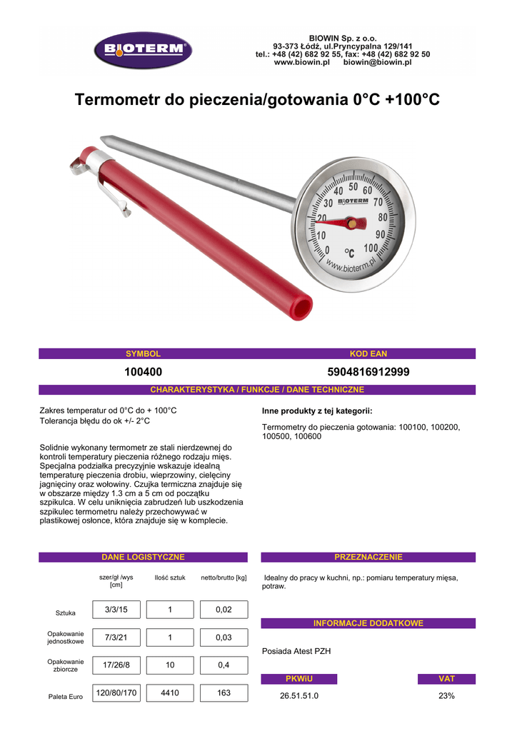 Termometr do pieczenia/gotowania 0°C +100°C SYMBOL KOD EAN 100400 5904816912999 CHARAKTERYSTYKA / FUNKCJE / DANE TECHNICZNE Zakres temperatur od 0°C do + 100°C Tolerancja błędu do ok +/- 2°C Inne produkty z tej kategorii: Termometry do pieczenia gotowania: 100100, 100200, 100500, 100600 Solidnie wykonany termometr ze stali nierdzewnej do kontroli temperatury pieczenia różnego rodzaju mięs. Specjalna podziałka precyzyjnie wskazuje idealną temperaturę pieczenia drobiu, wieprzowiny, cielęciny jagnięciny oraz wołowiny. Czujka termiczna znajduje się w obszarze między 1.3 cm a 5 cm od początku szpikulca. W celu uniknięcia zabrudzeń lub uszkodzenia szpikulec termometru należy przechowywać w plastikowej osłonce, która znajduje się w komplecie. DANE LOGISTYCZNE Sztuka PRZEZNACZENIE szer/gł /wys [cm] Ilość sztuk netto/brutto [kg] 3/3/15 1 0,02 Idealny do pracy w kuchni, np.: pomiaru temperatury mięsa, potraw. INFORMACJE DODATKOWE Opakowanie jednostkowe 7/3/21 1 0,03 Posiada Atest PZH Opakowanie zbiorcze Paleta Euro 17/26/8 120/80/170 10 4410 0,4 163 PKWiU VAT 26.51.51.0 23%
