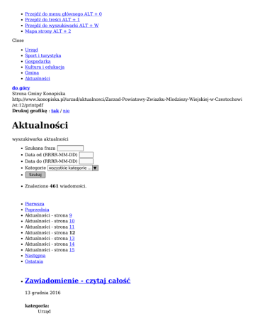 Przejdź do menu głównego ALT + 0 Przejdź do treści ALT + 1 Przejdź do wyszukiwarki ALT + W Mapa strony ALT + 2 Close Urząd Sport i turystyka Gospodarka Kultura i edukacja Gmina Aktualności do góry Strona Gminy Konopiska http://www.konopiska.pl/urzad/aktualnosci/Zarzad-Powiatowy-Zwiazku-Mlodziezy-Wiejskiej-w-Czestochowi /st:12/printpdf Drukuj grafikę : tak / nie Aktualności wyszukiwarka aktualności Szukana fraza Data od (RRRR-MM-DD) Data do (RRRR-MM-DD) Kategorie wszystkie kategorie ... ▼ Szukaj Znaleziono 461 wiadomości. Pierwsza Poprzednia Aktualności - strona 9 Aktualności - strona 10 Aktualności - strona 11 Aktualności - strona 12 Aktualności - strona 13 Aktualności - strona 14 Aktualności - strona 15 Następna Ostatnia Zawiadomienie - czytaj całość 13 grudnia 2016 kategoria: Urząd Na podstawie art. 20 ust. 1 ustawy o samorządzie gminnym z dnia 8 marca 1990 r. (Dz. U. z 2016 poz. 446) zawiadamiam, że dnia 20 grudnia 2016 r. (wtorek) o godz. 13.00 w sali konferencyjnej Urzędu Gminy w Konopiskach odbędzie się XXVII sesja Rady Gminy Konopiska Zawiadomienie Zawiadomienie - czytaj całość Niezwykłe spotkanie z Marcinem Prusem – czterokrotnym mistrzem Polski w siatkówce! - czytaj całość 12 grudnia 2016 kategoria: Sport i Turystyka W piątek, drugiego grudnia br. do ZS w Konopiskach został zaproszony przez trenera SOS, nauczyciela wychowania fizycznego, p. Tomasza Kupczyka niezwykły gość – czterokrotny mistrz Polski w siatkówce – pan Marcin Prus, który w reprezentacji Polski grał w latach 1997-2001. Rozegrał 97 spotkań. Było to niewątpliwie niepowtarzalne spotkanie. Niezwykłe spotkanie z Marcinem Prusem – czterok Niezwykłe spotkanie z Marcinem Prusem – czterokrotnym mistrzem Polski w siatkówce! - czytaj całość Czarodziej Morgan, święty Mikołaj i Stary Młyn - czytaj całość 12 grudnia 2016 kategoria: Pomoc społeczna W Promyku od pewnego czasu mamy bogaty repertuar wydarzeń. Oprócz zajęć tematycznych, mieliśmy okazję uczestniczyć w wielu ciekawych wydarzeniach. W andrzejki spotkaliśmy się z czarodziejem Morganem, który przeniósł nas do świata magii i czarów. Kapelusz czarodzieja mieścił w sobie różnorodne wróżby. Nasz tajemniczy gość przepowiadał dzieciom interesującą i pełną pozytywnych emocji przyszłość. Czarodziej Morgan, święty Mikołaj i Stary Młyn Czarodziej Morgan, święty Mikołaj i Stary Młyn - czytaj całość Święty Mikołaj w Hutkach - czytaj całość 07 grudnia 2016 kategoria: Pomoc społeczna Z dalekiej Laponii, zmagając się ze śnieżycami, lodowymi górami oraz watahami wilków do 70 dzieci z gminy Konopiska zawitał św. Mikołaj. Przyjechał wraz z aniołkiem w dniu 6 grudnia 2016 r. do Zespołu Szkolno – Przedszkolnego im. M. Kopernika w Hutkach, gdzie niecierpliwie wyczekiwały go dzieci zaproszone wraz z rodzicami przez pracowników Gminnego Ośrodka Pomocy Społecznej w Konopiskach. Święty Mikołaj w Hutkach Święty Mikołaj w Hutkach - czytaj całość Ks. Sebastian Ciastek został Proboszczem w Rększowicach czytaj całość 06 grudnia 2016 kategoria: Kultura i Edukacja Uroczyste wprowadzenie ks. Sebastiana Ciastek w Urząd Proboszcza Parafii Najświętszego Serca Pana Jezusa odbyło się w niedzielę, 4 grudnia 2016 roku w kościele parafialnym w Rększowicach. W uroczystej Mszy Świętej uczestniczył Wójt Gminy Konopiska Jerzy Żurek, Edward Bałdyga Przewodniczący Rady Gminy Konopiska, strażacy dyrektorzy szkół, delegacje KGW, przedstawiciele Rady Parafialnej, służba liturgiczna i mieszkańcy. Ks. Sebastian Ciastek został Proboszczem w Rększ Ks. Sebastian Ciastek został Proboszczem w Rększowicach - czytaj całość Aktywni z PZU - czytaj całość 06 grudnia 2016 kategoria: Pomoc społeczna W dniu 29 listopada 2016r. w Biurze Edukacji i Aktywizacji w Konopiskach odbyły się dwa spotkania zorganizowane dla osób niepełnosprawnych i ich opiekunów w ramach projektu pn. „Aktywni z PZU”. Aktywni z PZU Aktywni z PZU - czytaj całość Dane adresowe, dobro wspólne - czytaj całość 05 grudnia 2016 kategoria: Kultura i Edukacja Przyzwyczailiśmy się, że nasze dane znajdują się w bazach i systemach prowadzonych przez administrację i różne instytucje. Wszystko można znaleźć w sieci lub sprawdzić w wygodnej aplikacji. Po co więc umieszczać tabliczkę z adresem na budynku skoro nawigacja doprowadzi nas do celu? To bardzo ważne, a nieprawidłowe umieszczenie numeru porządkowego lub jego brak to wykroczenie za które możemy odpowiadać. Dane adresowe, dobro wspólne Dane adresowe, dobro wspólne - czytaj całość Święty Mikołaj z Polakami na Wileńszczyźnie - czytaj całość 05 grudnia 2016 kategoria: Kultura i Edukacja W listopadzie br. w Gminie Konopiska po raz pierwszy organizowana była akcja zbierania słodyczy, maskotek, zabawek oraz artykułów spożywczych dla Polaków mieszkających na Wileńszczyźnie. W akcję włączyły się Zespoły Szkół i Zespoły Szkolno –Przedszkolne, Parafia pw.św. Maksymiliana Marii Kolbego w Aleksandrii, Parafia pw.św. Walentego w Konopiskach, Parafia Najświętszego Serca Pana Jezusa w Rększowicach. Święty Mikołaj z Polakami na Wileńszczyźnie Święty Mikołaj z Polakami na Wileńszczyźnie - czytaj całość Górnicze Święto w Konopiskach - czytaj całość 05 grudnia 2016 kategoria: Kultura i Edukacja Uroczysta msza święta w kościele pw. św. Walentego rozpoczęła 4 grudnia tradycyjne obchody święta górników. W nabożeństwie uczestniczyli Zofia Kośmierska Zastępca Wójta Gminy Konopiska, Iwona Lisek Dyrektor GCKiR w Konopiskach, Prezesi firm górniczych: Krzysztof Miciński, Edward Turski, Wojciech Pączko, dh Grzegorz Dyner Prezes Zarządu Oddziału Gminnego ZOSP RP w Konopiskach. Górnicze Święto w Konopiskach Górnicze Święto w Konopiskach - czytaj całość Bezpłatna kolonoskopia profilaktyczna - czytaj całość 03 grudnia 2016 kategoria: Urząd Mie