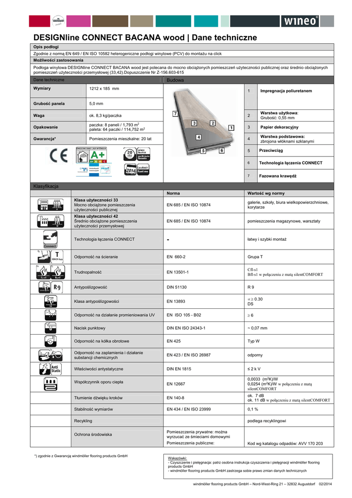 DESIGNline CONNECT BACANA wood | Dane techniczne Opis podłogi Zgodnie z normą EN 649 / EN ISO 10582 heterogeniczne podłogi winylowe (PCV) do montażu na click Możliwości zastosowania Podłoga winylowa DESIGNline CONNECT BACANA wood jest polecana do mocno obciążonych pomieszczeń użyteczności publicznej oraz średnio obciążonych pomieszczeń użyteczności przemysłowej (33,42).Dopuszczenie Nr Z-156.603-615 Budowa Dane techniczne Wymiary 1212 x 185 mm Grubość panela 5,0 mm Waga 1 Impregnacja poliuretanem ok. 8,3 kg/paczka 2 Warstwa użytkowa: Grubość: 0,55 mm Opakowanie paczka: 8 paneli / 1,793 m2 paleta: 64 paczki / 114,752 m2 3 Papier dekoracyjny Gwarancja* Pomieszczenia mieszkalne: 20 lat 4 Warstwa podstawowa: zbrojona włóknami szklanymi 5 Przeciwciąg 6 Technologia łączenia CONNECT 7 Fazowana krawędź Klasyfikacja Norma Wartość wg normy Klasa użyteczności 33 Mocno obciążone pomieszczenia użyteczności publicznej EN 685 / EN ISO 10874 galerie, szkoły, biura wielkopowierzchniowe, korytarze Klasa użyteczności 42 Średnio obciążone pomieszczenia użyteczności przemysłowej EN 685 / EN ISO 10874 pomieszczenia magazynowe, warsztaty Technologia łączenia CONNECT - łatwy i szybki montaż Odporność na ścieranie EN 660-2 Grupa T Trudnopalność EN 13501-1 Cfl-s1 Bfl-s1 w połączeniu z matą silentCOMFORT Antypoślizgowość DIN 51130 R9 Klasa antypoślizgowości EN 13893 µ ≥ 0.30 DS Odporność na działanie promieniowania UV EN ISO 105 - B02 ≥6 Nacisk punktowy DIN EN ISO 24343-1 ~ 0,07 mm Odporność na kółka obrotowe EN 425 Typ W Odporność na zaplamienia i działanie substancji chemicznych EN 423 / EN ISO 26987 odporny Właściwości antystatyczne DIN EN 1815 ≤2kV EN 12667 0,0033 (m2K)/W 0,0254 (m2K)/W w połączeniu z matą silentCOMFORT Tłumienie dźwięku kroków EN 140-8 ok. 7 dB ok. 11 dB w połączeniu z matą silentCOMFORT Stabilność wymiarów EN 434 / EN ISO 23999 0,1 % Współczynnik oporu ciepła Recykling Ochrona środowiska *) zgodnie z Gwarancją windmöller flooring products GmbH podlega recyklingowi Pomieszczenia prywatne: można wyrzucać ze śmieciami domowymi Pomieszczenia publiczne: Kod wg katalogu odpadów: AVV 170 203 Wskazówki: - Czyszczenie i pielęgnacja: patrz osobna instrukcja czyszczenia i pielęgnacji windmöller flooring products GmbH - windmöller flooring products GmbH zastrzega sobie prawo zmian danych technicznych windmöller flooring products GmbH – Nord-West-Ring 21 – 32832 Augustdorf 02/2014