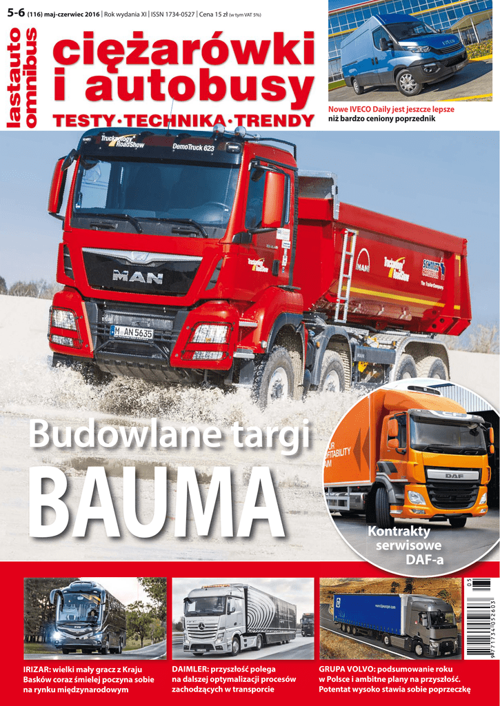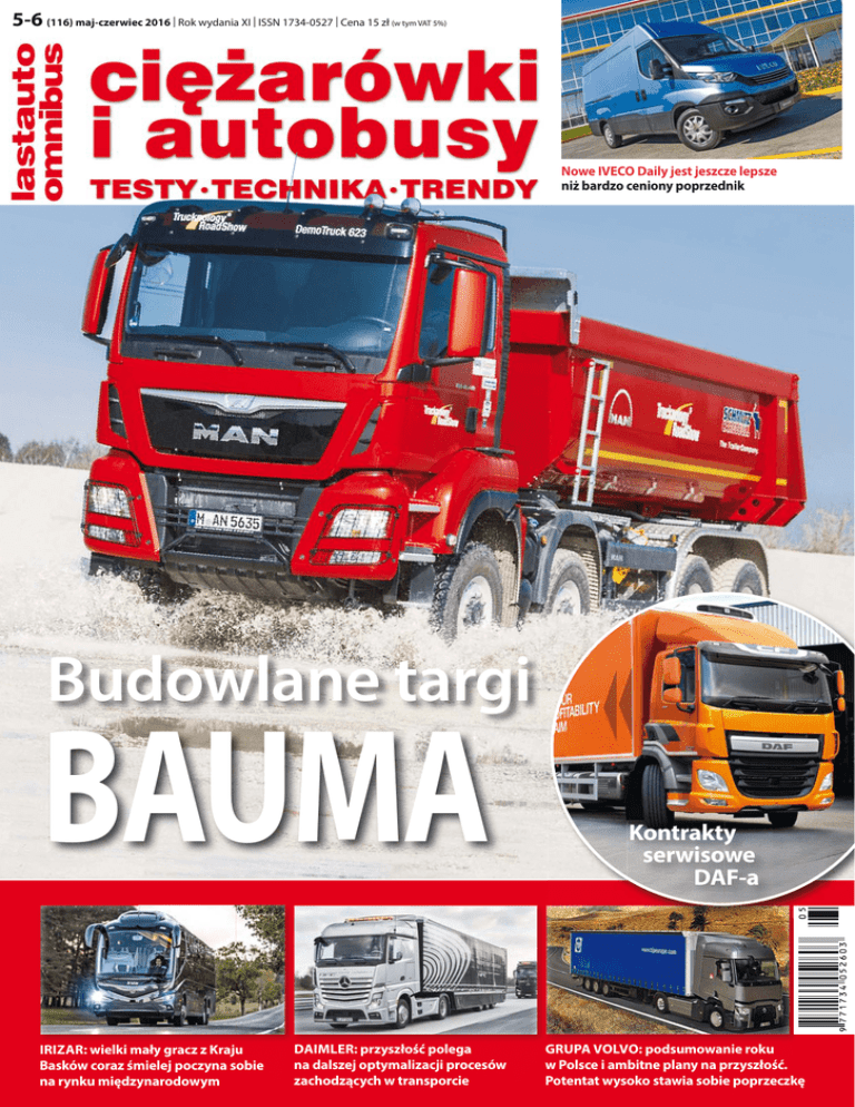 5-6 (116) maj-czerwiec 2016 | Rok wydania XI | ISSN 1734-0527 | Cena 15 zł (w tym VAT 5%) Nowe IVECO Daily jest jeszcze lepsze niż bardzo ceniony poprzednik Budowlane targi BAUMA IRIZAR: wielki mały gracz z Kraju Basków coraz śmielej poczyna sobie na rynku międzynarodowym DAIMLER: przyszłość polega na dalszej optymalizacji procesów zachodzących w transporcie Kontrakty serwisowe DAF-a GRUPA VOLVO: podsumowanie roku w Polsce i ambitne plany na przyszłość. Potentat wysoko stawia sobie poprzeczkę OD REDAKCJI [ 3 ] www.ciezarowkiautobusy.pl 3 4 12 Od redakcji 14 Bauma Największe na świecie targi budowlane ponownie dowiodły swojej przodującej pozycji w branży. 22 Okołoproduktowe wsparcie DAF-a Rozwój towarzyszących usług okołoproduktowych stanowi dzisiaj nieodłączny składnik transportowej rzeczywistości. 26 Przyszłość drogowego transportu towarowego zdaniem Mercedesa Nowe technologie, ukierunkowane na dalszą optymalizację procesu transportowego, zmierzają do wydatnego ograniczenia roli kierowcy. Panorama MAN Niemiecki koncern odniósł w ostatnim czasie kilka znaczących sukcesów w segmencie autobusów. 31 Irizar Producent z Kraju Basków ma coraz większe, internacjonalizacyjne zakusy. W Polsce za prowadzenie jego interesów odpowiada Grupa Wanicki. 39 Wczoraj, dziś i jutro Grupy Volvo Plany są ambitne zarówno w zakresie produktowym, jak i okołoproduktowym. 44 Ambrozja dla silnika Czystszy i sprawniejszy silnik, który zużywa mniej paliwa, to przywilej dostępny już dla każdego. 46 Karta paliwowa – wielka moc „plastiku” Funkcja karty paliwowej nie skupia się wyłącznie na zapewnieniu rabatu, który zresztą nie jest zbyt duży. 50 Scania gotowa do ciężkiej pracy Tuż przed wprowadzeniem nowego modelu szwedzki koncern czyści zapasy z obecnej serii. 52 KÄSSBOHRER w Monachium – Europejczyk pełną gębą W segmencie naczep w tej części odwiedzamy stoiska firm Kässbohrer, Goldhofer i Nooteboom. 59 Drogowy multiinstrumentalista z Kamaz Polska W ramach strategii poszerzania i pogłębiania oferty polski przedstawiciel stale rozszerza liczbę odmian dostępnych od razu z zabudowami i osprzętem. 62 Nowy IVECO Daily Euro 6 Nowe Daily jest lepsze od swojego niedawno wprowadzonego na rynek poprzednika. 64 Sztuka ewolucji Premierowy dostawczak Volkswagena powstał w wyniku ewolucji poprzedniej, sprawdzonej serii. 66 Stopka redakcyjna i kupon prenumeraty ciężarówki i autobusy 5-6/2016 Jarosław Brach Kierowca ciężarówki – zawód przeszłości? Pierwsza rewolucja w transporcie wiązała się z zastosowaniem koła. Druga z zastąpieniem – przynajmniej częściowym – pracy żywej ludzi i zwierząt pracą uprzedmiotowioną maszyn, na początku parowych. Na naszych oczach zachodzi natomiast trzecia rewolucja, dotycząca komercjalizacji tzw. autonomicznego prowadzenia, czyli zamiany ludzi – w tym przypadku kierowców – przez elektroniczno-mechaniczne układy wykonawcze. Oto bowiem niedawno odbył się Truck Platooning Challenge – pierwszy na świecie transgraniczny konwój inteligentnych ciężarówek. Przedsięwzięcie, zorganizowane z inicjatywy Holandii w ramach jej przewodnictwa w Radzie UE, służy promowaniu ogólnoeuropejskiej współpracy podmiotów związanych z branżą transportową, w tym producentów samochodów, przedsiębiorstw logistycznych, operatorów dróg, urzędów odpowiedzialnych za stan dróg i homologację pojazdów, instytutów badawczych oraz administracji i poszczególnych państw członkowskich. Cel tej współpracy polega na zaproponowaniu nowego, bezpieczniejszego, bardziej ekologicznego i efektywniejszego modelu transportu. Czy powyższe oznacza, że kierowcy ciężarówek przejdą do historii? Niestety, odpowiedź na to pytanie wydaje się być twierdząca. Oczywiście, nie nastąpi to dziś czy jutro, ale w perspektywie co najmniej kilkunastu lat, a najprawdopodobniej dwóch-trzech dekad. W efekcie nie będzie to przebiegać w sposób gwałtowny, lecz ewolucyjny. Najpierw od prowadzących, w ramach tzw. technologii półautonomicznych, będzie się coraz mniej wymagać na pokładzie, poniekąd udowadniając w ten sposób, że stają się oni zwyczajnie zbędni. Dlatego może da się z nich zrezygnować bez uszczerbku dla bezpieczeństwa i pewności samego przewozu. Chociaż z drugiej strony właśnie bezpieczeństwo i pewność mogą być istotnymi przeszkodami w bezproblemowym zachodzeniu tego procesu. Wszak elektronika wciąż, jaka dobra by nie była, może zawieść. Człowiek naturalnie też, lecz w tym przypadku skutki jego ewentualnych błędów mogą być o wiele mniejsze niż negatywne następstwa hakerskich ataków na systemy czy niedopracowania software’u. W takich realiach na początek omawiane zjawisko odnosić się będzie do przemieszczania ładunków w ruchu autostradowym (dalekobieżnym) oraz na terenach zamkniętych, jak kopalnie. Jednak, jeśli mimo wszystko nie pojawią się poważniejsze problemy, autonomiczne prowadzenie będzie przenoszone do innych typów przewozów towarowych. Powoli, niepostrzeżenie, by zbytnio nie drażnić zainteresowanych – samych kierowców. Dziś nikt przy zdrowych zmysłach w Europie nie pozwoli sobie mianowicie, by niemałą armię tych osób tak zwyczajnie wysłać na bruk (czytaj: bezrobocie). W pierwszej kolejności z zawodem musiałoby się pożegnać co najmniej kilkaset tysięcy ludzi, potem kolejne tysiące. Przy czym te tysiące – na swoje szczęście – oznaczają nawet nie tysiące słusznie niezadowolonych, a miliony utraconych potencjalnych wyborców, jeśli jeszcze wliczy się w to najbliższe rodziny. Na takie ryzyko nie zdecyduje się zaś żaden trzeźwo myślący polityk. Niemniej to, co przedwczoraj jawiło się jedynie jako wizja w rodzaju science fiction autorstwa garstki nawiedzonych wariatów, wczoraj znajdowało się na etapie prototypów, teraz stanowi technologię gotową do wprowadzenia. Dyskusja nie dotyczy zatem kwe