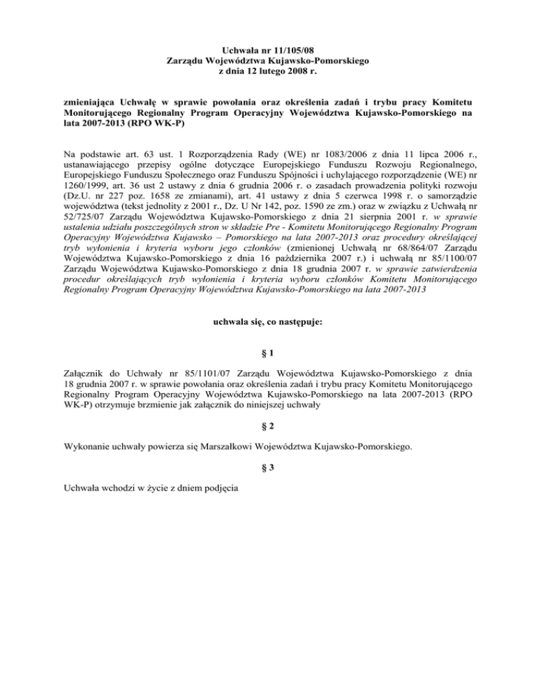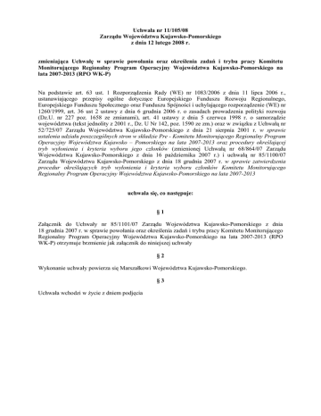 Uchwała nr 11/105/08 Zarządu Województwa Kujawsko-Pomorskiego z dnia 12 lutego 2008 r. zmieniająca Uchwałę w sprawie powołania oraz określenia zadań i trybu pracy Komitetu Monitorującego Regionalny Program Operacyjny Województwa Kujawsko-Pomorskiego na lata 2007-2013 (RPO WK-P) Na podstawie art. 63 ust. 1 Rozporządzenia Rady (WE) nr 1083/2006 z dnia 11 lipca 2006 r., ustanawiającego przepisy ogólne dotyczące Europejskiego Funduszu Rozwoju Regionalnego, Europejskiego Funduszu Społecznego oraz Funduszu Spójności i uchylającego rozporządzenie (WE) nr 1260/1999, art. 36 ust 2 ustawy z dnia 6 grudnia 2006 r. o zasadach prowadzenia polityki rozwoju (Dz.U. nr 227 poz. 1658 ze zmianami), art. 41 ustawy z dnia 5 czerwca 1998 r. o samorządzie województwa (tekst jednolity z 2001 r., Dz. U Nr 142, poz. 1590 ze zm.) oraz w związku z Uchwałą nr 52/725/07 Zarządu Województwa Kujawsko-Pomorskiego z dnia 21 sierpnia 2001 r. w sprawie ustalenia udziału poszczególnych stron w składzie Pre - Komitetu Monitorującego Regionalny Program Operacyjny Województwa Kujawsko – Pomorskiego na lata 2007-2013 oraz procedury określającej tryb wyłonienia i kryteria wyboru jego członków (zmienionej Uchwałą nr 68/864/07 Zarządu Województwa Kujawsko-Pomorskiego z dnia 16 października 2007 r.) i uchwałą nr 85/1100/07 Zarządu Województwa Kujawsko-Pomorskiego z dnia 18 grudnia 2007 r. w sprawie zatwierdzenia procedur określających tryb wyłonienia i kryteria wyboru członków Komitetu Monitorującego Regionalny Program Operacyjny Województwa Kujawsko-Pomorskiego na lata 2007-2013 uchwala się, co następuje: §1 Załącznik do Uchwały nr 85/1101/07 Zarządu Województwa Kujawsko-Pomorskiego z dnia 18 grudnia 2007 r. w sprawie powołania oraz określenia zadań i trybu pracy Komitetu Monitorującego Regionalny Program Operacyjny Województwa Kujawsko-Pomorskiego na lata 2007-2013 (RPO WK-P) otrzymuje brzmienie jak załącznik do niniejszej uchwały §2 Wykonanie uchwały powierza się Marszałkowi Województwa Kujawsko-Pomorskiego. §3 Uchwała wchodzi w Ŝycie z dniem podjęcia Uzasadnienie Zgodnie z art. 63 ust. 1 Rozporządzenia Rady (WE) nr 1083/2006 z dnia 11 lipca 2006, ustanawiającego przepisy ogólne dotyczące Europejskiego Funduszu Rozwoju Regionalnego, Europejskiego Funduszu Społecznego i Funduszu Spójności i uchylającego rozporządzenie (WE) nr 1260/1999 Rozporządzenie ogólne) oraz art. 36 ust 2 ustawy z dnia 6 grudnia 2006 o zasadach prowadzenia polityki rozwoju (ze zm.), Instytucja Zarządzająca Regionalnym Programem Operacyjnym dla Województwa Kujawsko-Pomorskiego na lata 2007-2013- Zarząd Województwa Kujawsko-Pomorskiego jest zobowiązany powołać Komitet Monitorujący. Zgodnie z art. 35 ust. 3 Ustawy z dnia 6 grudnia 2006, o zasadach prowadzenia polityki rozwoju (Dz. U. nr 227 poz. 1658), Ministerstwo Rozwoju Regionalnego opracowało wytyczne dotyczące powoływania Komitetów Monitorujących dla programów operacyjnych i regionalnych programów operacyjnych, ustalania jego składu, zadań oraz trybu działania. W dniu 18 grudnia 2007 r. Zarząd Województwa Kujawsko-Pomorskiego podjął Uchwałę w sprawie powołania i określenia zadań oraz trybu pracy Komitetu Monitorującego Regionalny Program Operacyjny Województwa Kujawsko-Pomorskiego na lata 2007-2013 (RPO WK-P). W związku z tym, iŜ w toku prac nad powołaniem Komitetu Monitorującego Wojewódzka Komisja Dialogu Społecznego nie wskazała przedstawicieli do prac w Komitecie, został on powołany bez ich udziału. Zgodnie z Wytycznymi nr 3 Ministra Rozwoju Regionalnego dotyczącymi komitetów monitorujących, udział przedstawicieli organizacji pracowników i pracodawców w komitecie monitorującym jest obligatoryjny, dlatego teŜ Instytucja Zarządzająca dokonała wyboru reprezentantów do pracy w Komitecie, kierując się kryterium reprezentatywności poszczególnych organizacji wchodzących w skład WKDS. Ponadto, w zapisach załącznika do uchwały dopisano stałych zastępców członków Komitetu Monitorującego oraz przedstawicieli Komisji Europejskiej. Dodatkowo, mając na uwadze obowiązki słuŜbowe, zarówno Marszałka Województwa Kujawsko-Pomorskiego jak i Wojewody Kujawsko-Pomorskiego, pełniących funkcje Przewodniczącego i Zastępcy Komitetu, wskazano ich stałych zastępców. Ze względu na pisemny wniosek przedstawicieli Europejskiego Centrum Współpracy MłodzieŜy, dotyczący zamiany funkcji pełnionych w Komitecie Monitorującym, przez osoby wskazane przez tę organizację, uwzględniono tę zmianę w Uchwale. Mając na uwadze powyŜsze, nastąpiła konieczność zmiany zapisów w załączniku do Uchwały nr 85/1101/07 z dnia 18 grudnia 2007 r.