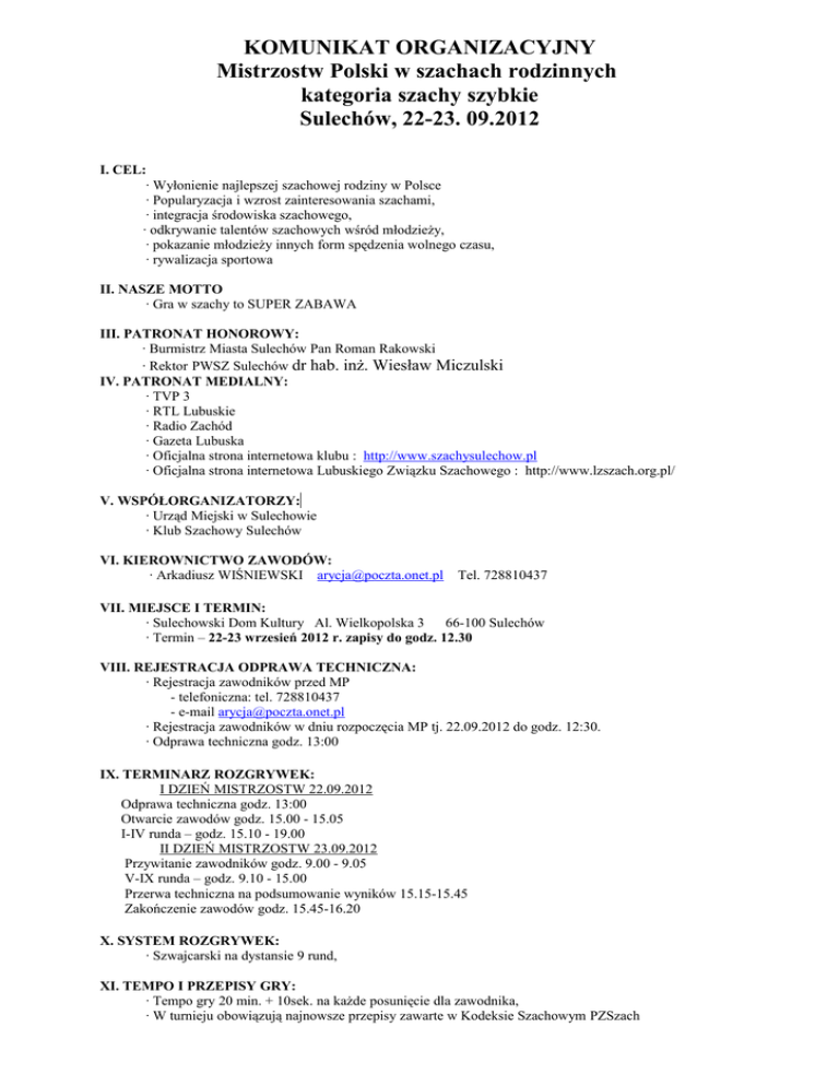 KOMUNIKAT ORGANIZACYJNY Mistrzostw Polski w szachach rodzinnych kategoria szachy szybkie Sulechów, 22-23. 09.2012 I. CEL: · Wyłonienie najlepszej szachowej rodziny w Polsce · Popularyzacja i wzrost zainteresowania szachami, · integracja środowiska szachowego, · odkrywanie talentów szachowych wśród młodzieży, · pokazanie młodzieży innych form spędzenia wolnego czasu, · rywalizacja sportowa II. NASZE MOTTO · Gra w szachy to SUPER ZABAWA III. PATRONAT HONOROWY: · Burmistrz Miasta Sulechów Pan Roman Rakowski · Rektor PWSZ Sulechów dr hab. inż. Wiesław Miczulski IV. PATRONAT MEDIALNY: · TVP 3 · RTL Lubuskie · Radio Zachód · Gazeta Lubuska · Oficjalna strona internetowa klubu : http://www.szachysulechow.pl · Oficjalna strona internetowa Lubuskiego Związku Szachowego : http://www.lzszach.org.pl/ V. WSPÓŁORGANIZATORZY: · Urząd Miejski w Sulechowie · Klub Szachowy Sulechów VI. KIEROWNICTWO ZAWODÓW: · Arkadiusz WIŚNIEWSKI [email protected] Tel. 728810437 VII. MIEJSCE I TERMIN: · Sulechowski Dom Kultury Al. Wielkopolska 3 66-100 Sulechów · Termin – 22-23 wrzesień 2012 r. zapisy do godz. 12.30 VIII. REJESTRACJA ODPRAWA TECHNICZNA: · Rejestracja zawodników przed MP - telefoniczna: tel. 728810437 - e-mail [email protected] · Rejestracja zawodników w dniu rozpoczęcia MP tj. 22.09.2012 do godz. 12:30. · Odprawa techniczna godz. 13:00 IX. TERMINARZ ROZGRYWEK: I DZIEŃ MISTRZOSTW 22.09.2012 Odprawa techniczna godz. 13:00 Otwarcie zawodów godz. 15.00 - 15.05 I-IV runda – godz. 15.10 - 19.00 II DZIEŃ MISTRZOSTW 23.09.2012 Przywitanie zawodników godz. 9.00 - 9.05 V-IX runda – godz. 9.10 - 15.00 Przerwa techniczna na podsumowanie wyników 15.15-15.45 Zakończenie zawodów godz. 15.45-16.20 X. SYSTEM ROZGRYWEK: · Szwajcarski na dystansie 9 rund, XI. TEMPO I PRZEPISY GRY: · Tempo gry 20 min. + 10sek. na każde posunięcie dla zawodnika, · W turnieju obowiązują najnowsze przepisy zawarte w Kodeksie Szachowym PZSzach XII. PUNKTACJA I OCENA WYNIKÓW: Kolejność miejsc w turnieju: · punkty duże (meczowe 2, 1, 0), · suma punktów zdobytych przez zawodników (wygrana – 1 pkt; remis - 0,5 pkt, przegrana – 0 pkt), · wynik bezpośredniego spotkania, · lepszy wynik na pierwszej, ewentualnie kolejnych szachownicach · dodatkowy mecz po wyczerpaniu w/w kryteriów, XIII. WARUNKI UCZESTNICTWA W TURNIEJU: · Składy drużyn 3-osobowe (dwoje rodziców + dziecko lub rodzic + dwoje dzieci; trójka rodzeństwa; w składzie mile widziani dziadkowie z wnuczkami itd.) Wpisowe: 100 zł od drużyny należy wpłacać na konto klubu tj: mBank 14 1140 2004 0000 3302 6392 9495 Zawodnicy zgłoszeni po 15 września 2012 płacą wpisowe podwyższone o 20zł XIV. ZAKWATEROWANIE I WYŻYWIENIE: Zakwaterowanie: Motel Alicja - 35 miejsc 1 osobowe 110 PLN za pokój 2 osobowe 140 PLN za pokój 3 osobowe 160 PLN za pokój Akademik PWSZ Sulechów - dowolna ilość miejsc 45-50 zł/osoba pokoje gościnne ścisłe centrum ul. Skłodowskiej liczba pokoi: 3 łazienka, toaleta, prysznic 8 miejsc 2 osobowe 50 PLN za pokój 3 osobowe 75 PLN za pokój 3 osobowe 75 PLN za pokój pokoje gościnne ul. Środkowa 8 3 osobowe 90 PLN za pokój 12 miejsc Pytania i rezerwacje zakwaterowania prosimy kierować na e-mail: [email protected] Rezerwacje miejsc noclegowych będą dokonywane dla osób, które przesłały zgłoszenie i ksero wpłaty wpisowego do 15 września 2012. Po przekroczeniu terminu rezerwacji organizator nie zapewnia zakwaterowania. Na miejscu nie ma możliwości wpłat gotówkowych za zakwaterowanie. Odległość do miejsca rozgrywek (Sulechowski Dom Kultury) • od dworca PKS - około 800 metrów, • od dworca PKP - około 1300 metrów Wyżywienie - we własnym zakresie restauracja „Delicjusz” oddalona o 100m od miejsca rozgrywek. Więcej informacji: Arkadiusz WIŚNIEWSKI - kontakt: 728810437 lub [email protected] XV. GWARANTOWANE NAGRODY I WYRÓŻNIENIA: Nagrody i wyróżnienia: Zwycięska drużyna otrzymuje tytuł Drużynowego Mistrza Polski w szachach rodzinnych dodatkowo. I miejsce II miejsce III miejsce IV miejsce V miejsce VI miejsce VII miejsce - 1200 zł + puchar, medale, dyplom, nagrody rzeczowe - 900 zł + puchar, medale, dyplom, nagrody rzeczowe - 600 zł + puchar, medale, dyplom, nagrody rzeczowe - 500 zł + dyplom, nagrody rzeczowe - 400 zł + dyplom, nagrody rzeczowe - 300 zł + dyplom, nagrody rzeczowe - 200 zł + dyplom, nagrody rzeczowe VIII miejsce IX miejsce X miejsce - 150 zł + dyplom, nagrody rzeczowe - 100 zł + dyplom, nagrody rzeczowe - 50 zł + dyplom, nagrody rzeczowe od miejsca XI dla wszystkich - dyplom XVI. SPRAWY WYCHOWAWCZE - Na sali gry obowiązują zasady dobrego zachowania umożliwiające zawodnikom bezproblemowe rozegranie partii, oraz kategoryczny zakaz picia alkoholu i palenia tytoniu. - Opiekę wychowawczą podczas zawodów sprawują SZKOLENIOWCY I OPIEKUNOWIE !!!, we współpracy z Organizatorem. Osoby niepełnoletnie zobowiązane są pozostawać pod opieką osób dorosłych. XVII. SPRAWY RÓŻNE - Nagrody należy odbierać osobiście na zakończeniu mistrzostw, w przeciwnym razie przepadają - Uczestnicy indywidualne ubezpieczają się od następstw nieszczęśliwych wypadków i biorą w zawodach udział na własną odpowiedzialność oraz odpowiadają za wyrządzone przez siebie szkody. - Organizatorzy zastrzegają sobie prawo do zmian w niniejszym regulaminie. Z szachowym pozdrowieniem Arkadiusz WIŚNIEWSKI