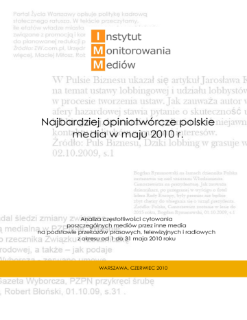 Najbardziej opiniotwórcze polskie media w maju 2010 r. Analiza częstotliwości cytowania poszczególnych mediów przez inne media na podstawie przekazów prasowych, telewizyjnych i radiowych z okresu od 1 do 31 maja 2010 roku WARSZAWA, CZERWIEC 2010 Najbardziej opiniotwórcze polskie media w maju 2010 r. Spis treści 1. ANALIZA ..................................................... 5 1.1. RANKING GŁÓWNY ..............................................5 1.2. RANKING TYTUŁÓW PRASOWYCH ...........................6 1.3. RANKING STACJI TELEWIZYJNYCH ...........................7 1.4. RANKING ROZGŁOŚNI RADIOWYCH .......................8 1.5. RANKING PORTALI INTERNETOWYCH .......................9 1.6. RANKING MEDIÓW BIZNESOWYCH .......................10 1.7. RANKING MEDIÓW OGÓLNOINFORMACYJNYCH ...11 1.8. RANKING PERIODYKÓW ......................................12 1.9. TEMATYKA PRZEKAZÓW .......................................13 1.10. RANKING PRASY REGIONALNEJ .........................14 1.11. RANKING ROZGŁOŚNI REGIONALNYCH ..............14 METODOLOGIA BADANIA........................... 15 Wstęp Badanie przeprowadzono na podstawie 5801 przekazów mediowych (wycinków prasowych, programów radiowych i telewizyjnych) z okresu 1 – 31 maja 2010 r. Dziennikarze odnosili się do wiadomości podawanych na łamach innych mediów 5861 razy (3629 razy w prasie, 1400 w telewizji i 832 w radiu). Analiza obejmuje tylko te przekazy, które nie są przeglądami mediów i przedrukami. Na jej podstawie wyciągnięto następujące wnioski: 1. Większość cytowanych przekazów to artykuły prasowe. Najwięcej publikacji pochodzi z dzienników (82 proc.) oraz tygodników (12 proc.). 2. W majowym rankingu najczęściej cytowanych mediów zwyciężyła Rzeczpospolita osiągając wynik 1135 powołań; na drugim miejscu znalazła się Gazeta Wyborcza, na którą powoływano się 586 razy. Trzecia lokata w maju należy do TVN24 (439), zaś czwartą pozycję zajął Dziennik Gazeta Prawna (401 powołań). Spośród rozgłośni radiowych najwyżej w rankingu znalazł się RMF FM. W zestawieniu portali internetowych prowadzi w maju tvn24.pl przed portalem onet.pl. 3. 97 proc. powołań dotyczyło mediów ogólnopolskich, a pozostałe 3 proc. – regionalnych. Najwięcej cytatów z mediów regionalnych w maju pochodziło z województwa mazowieckiego, gdzie liderem zostało Życie Warszawy. 4. Wśród gazet najczęściej powołujących się na doniesienia innych środków masowego przekazu pierwsze miejsce przypadło Gazecie Wyborczej, a drugie – Rzeczpospolitej. Najczęściej cytującymi rozgłośniami radiowymi były Radio Zet i TOK FM, a stacjami telewizyjnymi – Polsat News oraz TVN24. 2 Najbardziej opiniotwórcze polskie media w maju 2010 r. INFORMACJA MIESIĄCA Zaskakująca zmiana na podium – po raz pierwszy w historii przeprowadzania badania w pierwszej trójce znalazło się medium nie będące tytułem prasowym. Brązowym medalistą rankingu, po wielomiesięcznym pobycie w „poczekalni” została stacja TVN24 (439). O 38 punktów wyprzedziła Dziennik Gazeta Prawna, który spadł tym samym na czwartą pozycję (401). W maju 2010 roku media powoływały się na TVN24 głównie w odniesieniu do informacji związanych z katastrofą pod Smoleńskiem. Przede wszystkim cytowano uzyskane przez dziennikarzy TVN24 informacje dotyczące zapisu z czarnych skrzynek Tupolewa, potwierdzające obecność w kokpicie osoby nie należącej do ścisłej załogi samolotu. Za TVN24 podawano też bieżące ustalenia dotyczące terminu ogłoszenia rosyjskiego raportu z badania katastrofy oraz publikowano transkrypcję rozmów z ostatnich sekund lotu prezydenckiego samolotu. W mediach szeroko cytowana była również wypowiedź Edmunda Klicha dla TVN24, potwierdzającą obecność gen. Andrzeja Błasika w kokpicie w chwili wypadku. Przytaczano również informacje o nowych szczegółach katastrofy, złym zabezpieczeniu miejsca zderzenia oraz powoływano się na liczne wypowiedzi ekspertów w kontekście katastrofy, emitowane w TVN24. Jedna trzecia powołań dotyczyła kampanii prezydenckiej oraz rankingów i sondaży związanych z wyborami. Media chętnie publikowały za danymi TVN24 wyniki sondaży oraz… analizowały ich trafność i stopień rzeczywistego odzwierciedlenia preferencji wyborczych Polaków. ZWRÓĆ UWAGĘ W maju nie zmieniły się pozycje na dwóch pierwszych miejscach stawki. Tak jak w każdym kolejnym miesiącu począwszy od września 2009 pierwsze miejsce należy do Rzeczpospolitej (1135). Dziennik spektakularnie zdeklasował swojego głównego rywala – drugą w zestawieniu Gazetę Wyborczą (586) - o 549 punktów. Rzepa poprawiła jednocześnie swój kwietniowy wynik o 46 punktów. Media powoływały się na Rzeczpospolitą głównie w dwóch kontekstach: katastrofy pod Smoleńskiem oraz rankingów i sondaży. Media powoływały się na opublikowane w dzienniku doniesienia o możliwych przyczynach wypadku, w tym na tekst Michała Majewskiego i Pawła Reszki, która to publikacja zdaniem niektórych mediów „podważała kompetencje polskich pilotów”. Podobnie jak w kwietniu, dużym zainteresowaniem mediów cieszyły się rankingi publikowane przez Rzeczpospolitą, przede wszystkim Lista 500 największych przedsiębiorstw w Polsce oraz jedenasty ranking szkół wyższych przygotowanych wspólnie przez dziennik oraz miesięcznik Perspektywy. Szczególnie chętnie wyniki podawały media regionalne, podkreślając pozycje uzyskane w rankingach przez „swoje” firmy i uczelnie. Z treści publikacji jednoznacznie wynika, że uwzględnienie w wymienionych rankingach jest nobilitujące nie tylko dla firmy czy szkoły, ale przede wszystkim dla regionu. Rankingi prowadzone długofalowo przez Rzeczpospolitą stały się marką samą w sobie. Również w powołaniach na Gazetę Wyborczą dominowała tematyka katastrofy Tupolewa. Podawano za Gazetą Wyborczą dwa sensacyjne newsy: zeznania rzekomego 