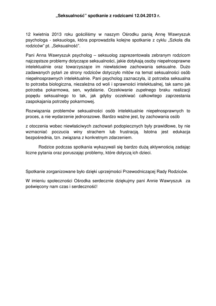 „Seksualność” spotkanie z rodzicami 12.04.2013 r. 12 kwietnia 2013 roku gościliśmy w naszym Ośrodku panią Annę Wawryszuk psychologa - seksuologa, która poprowadziła kolejne spotkanie z cyklu „Szkoła dla rodziców” pt. „Seksualność”. Pani Anna Wawryszuk psycholog – seksuolog zaprezentowała zebranym rodzicom najczęstsze problemy dotyczące seksualności, jakie dotykają osoby niepełnosprawne intelektualnie oraz towarzyszące im niewłaściwe zachowania seksualne. Dużo zadawanych pytań ze strony rodziców dotyczyło mitów na temat seksualności osób niepełnosprawnych intelektualnie. Pani psycholog zaznaczyła, iż potrzeba seksualna to potrzeba biologiczna, niezależna od woli i sprawności intelektualnej, tak samo jak potrzeba pokarmowa, sen, wydalanie. Oczekiwanie zupełnego braku realizacji popędu seksualnego to tak, jak gdyby oczekiwać całkowitego zaprzestania zaspokajania potrzeby pokarmowej. Rozwiązania problemów seksualności osób intelektualnie niepełnosprawnych to proces, a nie wydarzenie jednorazowe. Bardzo ważne jest, by zachowania osób z otoczenia wobec niewłaściwych zachowań podopiecznych były prawidłowe, by nie wzmacniać poczucia winy strachem lub frustracją. Istotna jest edukacja bezpośrednia, tzn. związana z konkretnym zdarzeniem. Rodzice podczas spotkania wykazywali się bardzo dużą aktywnością zadając liczne pytania oraz poruszając problemy, które dotyczą ich dzieci. Spotkanie zorganizowane było dzięki uprzejmości Przewodniczącej Rady Rodziców. W imieniu społeczności Ośrodka serdecznie dziękujmy pani Annie Wawryszuk za poświęcony nam czas i serdeczność!