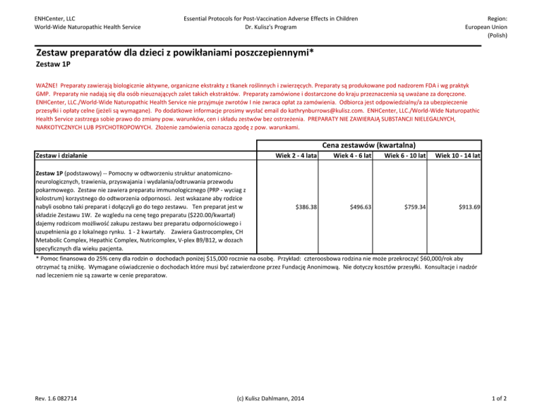 ENHCenter, LLC World-Wide Naturopathic Health Service Essential Protocols for Post-Vaccination Adverse Effects in Children Dr. Kulisz's Program Region: European Union (Polish) Zestaw preparatów dla dzieci z powikłaniami poszczepiennymi* Zestaw 1P WAŻNE! Preparaty zawierają biologicznie aktywne, organiczne ekstrakty z tkanek roślinnych i zwierzęcych. Preparaty są produkowane pod nadzorem FDA i wg praktyk GMP. Preparaty nie nadają się dla osób nieuznających zalet takich ekstraktów. Preparaty zamówione i dostarczone do kraju przeznaczenia są uważane za doręczone. ENHCenter, LLC./World-Wide Naturopathic Health Service nie przyjmuje zwrotów I nie zwraca opłat za zamówienia. Odbiorca jest odpowiedzialny/a za ubezpieczenie przesyłki i opłaty celne (jeżeli są wymagane). Po dodatkowe informacje prosimy wysłać email do [email protected]. ENHCenter, LLC./World-Wide Naturopathic Health Service zastrzega sobie prawo do zmiany pow. warunków, cen i składu zestwów bez ostrzeżenia. PREPARATY NIE ZAWIERAJĄ SUBSTANCJI NIELEGALNYCH, NARKOTYCZNYCH LUB PSYCHOTROPOWYCH. Złożenie zamówienia oznacza zgodę z pow. warunkami. Cena zestawów (kwartalna) Zestaw i działanie Zestaw 1P (podstawowy) -- Pomocny w odtworzeniu struktur anatomicznoneurologicznych, trawienia, przyswajania i wydalania/odtruwania przewodu pokarmowego. Zestaw nie zawiera preparatu immunologicznego (PRP - wyciag z kolostrum) korzystnego do odtworzenia odpornosci. Jest wskazane aby rodzice nabyli osobno taki preparat i dołączyli go do tego zestawu. Ten preparat jest w składzie Zestawu 1W. Ze wzgledu na cenę tego preparatu ($220.00/kwartał) dajemy rodzicom możliwość zakupu zestawu bez preparatu odpornościowego i uzupełnienia go z lokalnego rynku. 1 - 2 kwartały. Zawiera Gastrocomplex, CH Metabolic Complex, Hepathic Complex, Nutricomplex, V-plex B9/B12, w dozach specyficznych dla wieku pacjenta. Wiek 2 - 4 lata Wiek 4 - 6 lat Wiek 6 - 10 lat Wiek 10 - 14 lat $386.38 $496.63 $759.34 $913.69 * Pomoc finansowa do 25% ceny dla rodzin o dochodach poniżej $15,000 rocznie na osobę. Przykład: czteroosbowa rodzina nie może przekroczyć $60,000/rok aby otrzymać tą zniżkę. Wymagane oświadczenie o dochodach które musi być zatwierdzone przez Fundację Anonimową. Nie dotyczy kosztów przesyłki. Konsultacje i nadzór nad leczeniem nie są zawarte w cenie preparatow. Rev. 1.6 082714 (c) Kulisz Dahlmann, 2014 1 of 2 ENHCenter, LLC World-Wide Naturopathic Health Service Essential Protocols for Post-Vaccination Adverse Effects in Children Dr. Kulisz's Program Region: European Union (Polish) Zestaw preparatów dla dzieci z powikłaniami poszczepiennymi* Zestawy 1W, 2 i 3 WAŻNE! Preparaty zawierają biologicznie aktywne, organiczne ekstrakty z tkanek roślinnych i zwierzęcych. Preparaty są produkowane pod nadzorem FDA i wg praktyk GMP. Preparaty nie nadają się dla osób nieuznających zalet takich ekstraktów. Preparaty zamówione i dostarczone do kraju przeznaczenia są uważane za doręczone. ENHCenter, LLC./World-Wide Naturopathic Health Service nie przyjmuje zwrotów I nie zwraca opłat za zamówienia. Odbiorca jest odpowiedzialny/a za ubezpieczenie przesyłki i opłaty celne (jeżeli są wymagane). Po dodatkowe informacje prosimy wysłać email do [email protected]. ENHCenter, LLC./World-Wide Naturopathic Health Service zastrzega sobie prawo do zmiany pow. warunków, cen i składu zestwów bez ostrzeżenia. PREPARATY NIE ZAWIERAJĄ SUBSTANCJI NIELEGALNYCH, NARKOTYCZNYCH LUB PSYCHOTROPOWYCH. Złożenie zamówienia oznacza zgodę z pow. warunkami. Cena zestawów (kwartalna) Zestaw i działanie Zestaw 1W (wzbogacony) -- Pomocny w odtworzeniu struktur anatomicznoneurologicznych, trawienia, przyswajania i wydalania/odtruwania przewodu pokarmowego. 1 - 2 kwartały. Zawiera Gastrocomplex, CH Metabolic Complex, Hepathic Complex, Nutricomplex, V-plex B9/B12, Spray immunologiczny PRP w dozach specyficznych dla wieku pacjenta. Zestaw 2 -- Kontynuacja po zakończeniu Zestawu 1P lub 1W. Zestaw pomocny w początek odtwarzania struktur neurologicznych/mózgowych. Współpraca z terapeutami właściwych specjalności bardzo pożądana dla zwiększenia efektów leczenia. Zawiera wszystkie preparaty z zestawu 1W plus Neurocomplex I i Neurocomplex II w dozach specyficznych dla wieku pacjenta. Zestaw 3 -- Kontynuacja po zakończeniu Zestawu 2. Zestaw pomocny w stablizacji procesów metaboliczno-fizjologicznych, kontynuowanie współpracy z terapeutami właściwych specjalności bardzo pożądane dla zwiększenia efektów leczenia. Wprowadzenie dziecka do środowiska rówieśników. Zawiera wszystkie preparaty zestawu 2 plus Neurocomplex III. Dla dzieci w wieku 2 - 4 lat użyc zestaw 2 -- nie stosować Neurocomplex III Wiek 2 - 4 lata Wiek 4 - 6 lat Wiek 6 - 10 lat Wiek 10 - 14 lat $583.21 $685.59 $929.53 $1,001.49 $723.16 $817.66 $1,076.59 $1,207.00 $723.16 $1,013.68 $1,272.61 $1,599.04 * Pomoc finansowa do 25% ceny dla rodzin o dochodach poniżej $15,000 rocznie na osobę. Przykład: czteroosbowa rodzina nie może przekroczyć $60,000/rok aby otrzymać tą zniżkę. Wymagane oświadczenie o dochodach które musi być zatwierdzone przez Fundację Anonimową. Nie dotyczy kosztów przesyłki. Konsultacje i nadzór nad leczeniem nie są zawarte w cenie preparatów. Rev. 1.6 082714 (c) Kulisz Dahlmann, 2014 2 of 2