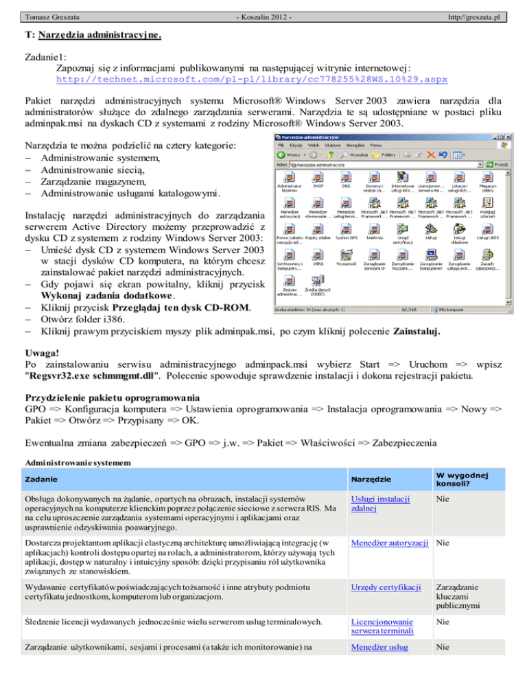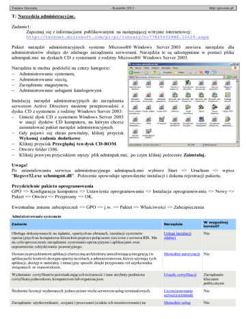 Tomasz Greszata - Koszalin 2012 - http://greszata.pl T: Narzędzia administracyjne. Zadanie1: Zapoznaj się z informacjami publikowanymi na następującej witrynie internetowej: http://technet.microsoft.com/pl-pl/library/cc778255%28WS.10%29.aspx Pakiet narzędzi administracyjnych systemu Microsoft® Windows Server 2003 zawiera narzędzia dla administratorów służące do zdalnego zarządzania serwerami. Narzędzia te są udostępniane w postaci pliku adminpak.msi na dyskach CD z systemami z rodziny Microsoft® Windows Server 2003. Narzędzia te można podzielić na cztery kategorie: Administrowanie systemem, Administrowanie siecią, Zarządzanie magazynem, Administrowanie usługami katalogowymi. Instalację narzędzi administracyjnych do zarządzania serwerem Active Directory możemy przeprowadzić z dysku CD z systemem z rodziny Windows Server 2003: Umieść dysk CD z systemem Windows Server 2003 w stacji dysków CD komputera, na którym chcesz zainstalować pakiet narzędzi administracyjnych. Gdy pojawi się ekran powitalny, kliknij przycisk Wykonaj zadania dodatkowe. Kliknij przycisk Przeglądaj ten dysk CD-ROM. Otwórz folder i386. Kliknij prawym przyciskiem myszy plik adminpak.msi, po czym kliknij polecenie Zainstaluj. Uwaga! Po zainstalowaniu serwisu administracyjnego adminpack.msi wybierz Start => Uruchom => wpisz "Regsvr32.exe schmmgmt.dll". Polecenie spowoduje sprawdzenie instalacji i dokona rejestracji pakietu. Przydzielenie pakietu oprogramowania GPO => Konfiguracja komputera => Ustawienia oprogramowania => Instalacja oprogramowania => Nowy => Pakiet => Otwórz => Przypisany => OK. Ewentualna zmiana zabezpieczeń => GPO => j.w. => Pakiet => Właściwości => Zabezpieczenia Administrowanie systemem W wygodnej konsoli? Zadanie Narzędzie Obsługa dokonywanych na żądanie, opartych na obrazach, instalacji systemów operacyjnych na komputerze klienckim poprzez połączenie sieciowe z serwera RIS. Ma na celu uproszczenie zarządzania systemami operacyjnymi i aplikacjami oraz usprawnienie odzyskiwania poawaryjnego. Usługi instalacji zdalnej Dostarcza projektantom aplikacji elastyczną architekturę umożliwiającą integrację (w aplikacjach) kontroli dostępu opartej na rolach, a administratorom, którzy używają tych aplikacji, dostęp w naturalny i intuicyjny sposób: dzięki przypisaniu ról użytkownika związanych ze stanowiskiem. Menedżer autoryzacji Nie Wydawanie certyfikatów poświadczających tożsamość i inne atrybuty podmiotu certyfikatu jednostkom, komputerom lub organizacjom. Urzędy certyfikacji Zarządzanie kluczami publicznymi Śledzenie licencji wydawanych jednocześnie wielu serwerom usług terminalowych. Licencjonowanie serwera terminali Nie Zarządzanie użytkownikami, sesjami i procesami (a także ich monitorowanie) na Menedżer usług Nie Nie Tomasz Greszata - Koszalin 2012 - http://greszata.pl W wygodnej konsoli? Zadanie Narzędzie dowolnym serwerze z uruchomionymi usługami terminalowymi w sieci. terminalowych Zarządzanie usługami sieci Web bezpośrednio poprzez opartą na standardach usługę XML sieci Web, przeznaczoną dla narzędzi programistycznych i aplikacji biznesowych. Omówienie Usług UDDI Nie Administrowanie siecią Zadanie Narzędzie W wygodnej konsoli? Definiowanie funkcji dla klientów dostępu zdalnego w celu zapewnienia klientom dostępu do usługi. Zestaw administracyjny Menedżera połączeń Nie Centralne zarządzanie adresami IP i innymi pokrewnymi szczegółami konfiguracji używanymi w sieci. Usługa DHCP Zarządzanie adresami IP Zarządzanie plikami rozproszonymi na wielu serwerach, aby Rozproszony system plików użytkownicy widzieli te pliki jako występujące w jednym miejscu w (Distributed File System, DFS) sieci. Nie Zarządzanie sieciami TCP/IP, takimi jak Internet, w celu lokalizacji komputerów i usług za pomocą nazw przyjaznych dla użytkownika. System DNS Zarządzanie usługą Active Directory i Zarządzanie adresami IP Zarządzanie wymianą przy użyciu przystawki usługi NNTP. Wybieranie składników do zainstalowania Usługa NNTP firmy Microsoft (wymaga uprzedniego zainstalowania usługi NNTP). Nie Zarządzanie telekomunikacją przy użyciu komputera, w celu Telefonia komunikowania się poprzez bezpośrednie połączenia z komputerami lokalnymi, liniami telefonicznymi, sieciami LAN i WAN oraz z Internetem. Nie Mapowanie nazw NetBIOS na adresy IP, szczególnie na potrzeby rozpoznawania nazw NetBIOS w sieciach trasowanych korzystających z usługi NetBT (system NetBIOS przez TCP/IP). Zarządzanie adresami IP Usługa WINS Zarządzanie magazynem W wygodnej konsoli? Narzędzie Zadanie Zarządzanie grupą niezależnych systemów komputerowych pracujących razem jak jeden Usługa klastrowania system, aby aplikacje i zasoby o podstawowym znaczeniu zawsze były dostępne dla systemu Windows klientów. Nie Zarządzanie z jednego komputera wszystkimi hostami klastra równoważenia obciążenia sieciowego. Klastry równoważenia obciążenia sieciowego Nie Zarządzanie woluminami dysków serwera i automatyczne kopiowanie rzadko używanych plików do biblioteki taśm lub dysków. Magazyn zdalny Nie Administrowanie usługami katalogowymi Zadanie Narzędzie W wygodnej konsoli? Zarządzanie relacjami zaufania między domenami. Usługa Active Directory Zarządzanie domenami Zarządzanie relacjami zaufania Zarządzanie lasami Zarządzanie usługą Active Directory Zarządzanie użytkownikami, komputerami, grupami zabezpieczeń i innymi obiektami w usłudze Active Directory. Usługa Active Directory Zarządzanie użytkownikami, grupami i komputerami Zasady grupy (wersja sprzed wprowadzenia konsoli zarządzania zasadami grupy) Zarządzanie usługą Active Directory Tomasz Greszata - Koszalin 2012 - http://greszata.pl Zadanie Narzędzie W wygodnej konsoli? Replikacja informacji usługi Active Directory. Usługa Active Directory Zarządzanie lokacjami Zarządzanie usługą Active Directory Zarządzanie, przy użyciu wiersza polecen