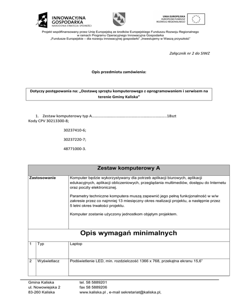 Projekt współfinansowany przez Unię Europejską ze środków Europejskiego Funduszu Rozwoju Regionalnego w ramach Programu Operacyjnego Innowacyjna Gospodarka „Fundusze Europejskie – dla rozwoju innowacyjnej gospodarki” „Inwestujemy w Waszą przyszłość” Załącznik nr 2 do SIWZ Opis przedmiotu zamówienia: Dotyczy postępowania na: „Dostawę sprzętu komputerowego z oprogramowaniem i serwisem na terenie Gminy Kaliska” 1. Zestaw komputerowy typ A………………………………………………………………..18szt Kody CPV 30213300-8; 30237410-6; 30237220-7; 48771000-3. Zestaw komputerowy A Zastosowanie Komputer będzie wykorzystywany dla potrzeb aplikacji biurowych, aplikacji edukacyjnych, aplikacji obliczeniowych, przeglądania multimediów, dostępu do Internetu oraz poczty elektronicznej. Parametry techniczne komputera muszą zapewnić jego pełną funkcjonalność w w/w zakresie przez co najmniej 13 miesięczny okres realizacji projektu, a następnie przez 5 letni okres trwałości projektu. Komputer zostanie użyczony jednostkom objętym projektem. Opis wymagań minimalnych 1 Typ Laptop 2 Wyświetlacz Podświetlenie LED, min. rozdzielczość 1366 x 768, przekątna ekranu 15,6” Gmina Kaliska ul. Nowowiejska 2 83-260 Kaliska tel. 58 5889201 fax 58 5889206 www.kaliska.pl , e-mail [email protected], Projekt współfinansowany przez Unię Europejską ze środków Europejskiego Funduszu Rozwoju Regionalnego w ramach Programu Operacyjnego Innowacyjna Gospodarka „Fundusze Europejskie – dla rozwoju innowacyjnej gospodarki” „Inwestujemy w Waszą przyszłość” 3 Procesor Procesor uzyskujący wynik co najmniej 4000 punktów w teście Passmark - CPU Mark według wyników procesorów publikowanych na stronie http://www.cpubenchmark.net/cpu_list.php (w ofercie podać model i nazwę producenta procesora) Zamawiający zastrzega sobie, iż w celu sprawdzenia poprawności przeprowadzenia testu Oferent musi dostarczyć Zamawiającemu licencjonowane oprogramowanie testujące, komputer do testu oraz dokładny opis metodyki przeprowadzonego testu wraz z wynikami w celu ich sprawdzenia w terminie nie dłuższym niż 3 dni od otrzymania zawiadomienia od Zamawiającego. 4 Pamięć RAM Min. 8 GB DDR3 1600Mhz 5 Dysk twardy min.500GB SATA 6 Napęd optyczny Napęd DVD+/-RW DL SATA wewnętrzna wraz z oprogramowaniem do nagrywania płyt 7 Karta dźwiękowa Zintegrowana 8 Karta sieciowa Port sieci LAN 10/100/1000 Ethernet RJ 45 zintegrowany z płytą główną Karta sieciowa bezprzewodowa Wi-Fi 802.11 b/g/n, anteny wbudowane w obudowę 9 Karta graficzna Zintegrowana min 128MB pamięci RAM wspierana technologią DirectX w wersji min 11 10 Czytnik kart wbudowany min. SD 11 Porty 1x czytnik kart pamięci 1x wejście mikrofonowe 1x wyjście słuchawkowe / audio 1x USB 2.0 2x USB 3.0 1x RJ45 (sieciowy) 1x HDMI 1x D-Sub (wyjście na monitor) 1x DC - in (gniazdo zasilania) Gmina Kaliska ul. Nowowiejska 2 83-260 Kaliska tel. 58 5889201 fax 58 5889206 www.kaliska.pl , e-mail [email protected], Projekt współfinansowany przez Unię Europejską ze środków Europejskiego Funduszu Rozwoju Regionalnego w ramach Programu Operacyjnego Innowacyjna Gospodarka „Fundusze Europejskie – dla rozwoju innowacyjnej gospodarki” „Inwestujemy w Waszą przyszłość” 12 Klawiatura Pełnowymiarowa, z wydzieloną klawiaturą numeryczną obsługującą standard polski programisty. 13 Dodatkowe wyposażenie Wbudowana/e: kamera, mikrofon, głośniki stereo. 14 Dodatkowe akcesoria Torba dostosowana do wymiarów komputera, zasilacz, port Kensington Lock wraz z linką zabezpieczającą 1,5 m, mysz optyczna USB z rolką (scroll). 15 System operacyjny patrz tabela system operacyjny 16 Bezpłatne Pakiet biurowy patrz tabela oprogramowanie biurowe oprogramowanie dodatkowe Zainstalowane oprogramowanie do otwierania dokumentów w formacie PDF, program do obsługi archiwum (co najmniej formaty .zip, .rar, .7z), nagrywania płyt CD/DVD 17 Ergonomia pracy Głośność przy maksymalnym obciążeniu nie powinna przekroczyć 40 dB 18 Bezpieczeństwo Możliwość ustawienia zależności pomiędzy hasłem administratora a hasłem systemowym tak, aby nie było możliwe wprowadzenie zmian w BIOS wyłącznie po podaniu hasła systemowego. Funkcja ta ma wymuszać podanie hasła administratora przy próbie zmiany ustawień BIOS w sytuacji, gdy zostało podane hasło systemowe. Możliwość ustawienia portów USB w trybie „no BOOT”, czyli podczas startu komputer nie wykrywa urządzeń bootujących typu USB, natomiast po uruchomieniu systemu operacyjnego porty USB są aktywne. Naklejka antykradzieżowa o wymiarach 28mm x 48mm z opisem „Zakup współfinansowany ze środków Europejskiego Funduszu Rozwoju Regionalnego w ramach Programu Operacyjnego Innowacyjna Gospodarka, projekt „Przeciwdziałanie wykluczeniu cyfrowemu mieszkańców Gminy Kaliska””, po usunięciu naklejki zostanie trwały napis: „Własność Gminy Kaliska, prośba o kontakt pod numerem telefonu Gmina Kaliska ul. Nowowiejska 2 83-260 Kaliska tel. 58 5889201 fax 58 5889206 www.kaliska.pl , e-mail [email protected], Projekt współfinansowany przez Unię Europejską ze środków Europejskiego Funduszu Rozwoju Regionalnego w ramach Programu Operacyjnego Innowacyjna Gospodarka „Fundusze Europejskie – dla rozwoju innowacyjnej gospodarki” „Inwestujemy w Waszą przyszłość” 58 58 89 201 lub 58 58 89 202”. 19 Gwarancja Gwarancja min. 48 miesięcy door to door Wymagane okno czasowe dla zgłaszania usterek min wszystkie dni robocze w godzinach od 8:00 do 16:00. Zgłoszenie serwisowe przyjmowane poprzez stronę www, , email lub telefoniczne. Musi być zapewniona możliwość telefonicznego sprawdzenia konfiguracji sprzętowej komputera oraz warunków gwarancji po podaniu numeru seryjnego bezpośrednio u producenta lub jego przedstawiciela. Dostęp do najnowszych sterowników i uaktualnień na stronie producenta zestawu realizowany poprze