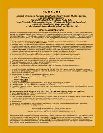 KONKURS Fundacji Wspierania Rozwoju Radiokomunikacji i Technik Multimedialnych pod patronatem medialnym Telewizji Polskiej S.A., Polskiego Radia S.A., oraz Przeglądu Telekomunikacyjnego i Wiadomości Telekomunikacyjnych o nagrodę za najlepszą pracę doktorską z dziedziny radiokomunikacji i technik multimedialnych REGULAMIN KONKURSU Fundacja Wspierania Rozwoju Radiokomunikacji i Technik Multimedialnych (WRRiTM), zgodnie ze swoimi celami statutowymi, kierując się potrzebą popierania badań naukowych rozwijających nowe techniki i technologie, ogłasza ogólnopolski konkurs na najlepszą pracę doktorską dotyczącą zagadnień radiokomunikacji bądź technik multimedialnych. Patronami medialnymi Konkursu są: Telewizja Polska S.A., Polskie Radio S.A. oraz Przegląd Telekomunikacyjny i Wiadomości Telekomunikacyjne. §1 1. Druga edycja Konkursu obejmuje prace doktorskie z dziedziny radiokomunikacji bądź technik multimedialnych, obronione od 1 września 2002 do 28 lutego 2004. 2. Fundator zwraca się za pośrednictwem patronów medialnych do doktorantów, rad wydziałów i rad instytutów wyższych uczelni oraz rad instytutów naukowo-badawczych, w których są prowadzone prace z zakresu radiokomunikacji lub technik multimedialnych, o zgłaszanie do Konkursu najlepszych prac z wymienionych dziedzin, obronionych w tych placówkach. 3. Wnioski o zgłoszenie do Konkursu mogą składać rady wydziałów i rady instytutów wyższych uczelni, rady instytutów naukowo-badawczych oraz autorzy prac po uzyskaniu rekomendacji promotora lub recenzenta. 4. Kandydat do nagrody w dniu obrony pracy doktorskiej nie może przekroczyć 35 roku życia. 5. Przyjmuje się zasadę, że do Konkursu mogą być zgłaszane tylko prace obronione z wyróżnieniem. §2 1. W skład Komisji Konkursowej wchodzi 5 profesorów z wyższych uczelni technicznych oraz instytutów naukowo-badawczych, 1 przedstawiciel Fundacji oraz przedstawiciele patronów medialnych. 2. Przewodniczącego wyłania ze swojego grona Komisja Konkursowa. 3. Kadencję Komisji Konkursowej określa się na jeden rok. 4. Fundator za pośrednictwem patronów medialnych poda wyniki Konkursu do publicznej wiadomości. §3 1. Komisja Konkursowa przyznaje corocznie trzy nagrody. Komisja może nie przyznać nagród w przypadku gdy uzna, że żadna ze zgłoszonych prac nie spełnia oczekiwań Fundatora nagrody. Może również w inny sposób rozdysponować kwoty przeznaczone na nagrody. 2. Wysokość nagród corocznie określa Zarząd Fundacji WRRiTM. W drugiej edycji Konkursu wysokość nagród wynosi: I miejsce – 10 000 PLN II miejsce – 8 000 PLN III miejsce – 5 000 PLN 3. Decyzja Komisji Konkursowej jest ostateczna. Od tej decyzji nie przysługuje odwołanie. 4. Laureaci zostaną poinformowani o przyznaniu nagród listownie. 5. Nagrody dla autorów zostaną wręczone w trakcie otwarcia Krajowej Konferencji Radiokomunikacji, Radiofonii i Telewizji 16 czerwca 2004 r. §4 Do wniosków składanych w terminie do 31 marca 2003 r. pod adresem Fundacji powinny być dołączone: 1) jeden egzemplarz pracy – w formie wydruku oraz w formie elektronicznej (.doc lub .pdf); 2) streszczenie pracy (maks. 6 stron); 3) dane o autorze (aktualny adres do korespondencji, miejsce pracy, tel., e-mail), o promotorze pracy (aktualny adres do korespondencji, tel., e-mail) oraz o wydziale/instytucie promującym pracę; 4) kopie dokumentów potwierdzających nadanie stopnia doktora oraz przyznanie wyróżnienia; 5) kopie recenzji; 6) ewentualnie inne, niezależne opinie (np. rady wydziału, rady instytutu, użytkownika urządzeń/oprogramowania). Prace nadesłane na Konkurs nie będą zwracane. §5 Sekretariat Konkursu mieści się w Biurze Zarządu Fundacji ul. Nowowiejska 15/19, 00-665 Warszawa tel: (22) 660-79-10 fax: (22) 825-65-55 e-mail: [email protected] §6 Organizatorzy Konkursu zastrzegają sobie prawo wykorzystania fragmentów prac oraz informacji o ich autorach (w tym publikacji nazwisk autorów i promotorów w czasopismach naukowo-technicznych, w audycjach radiowych i telewizyjnych, materiałach informacyjnych publikowanych przez Fundację WRRiTM oraz umieszczanych na stronach internetowych). We wszystkich szczegółowych kwestiach (jak również w wyjątkowych okolicznościach, nie objętych niniejszym regulaminem) decyzje będzie podejmowała Komisja Konkursowa.