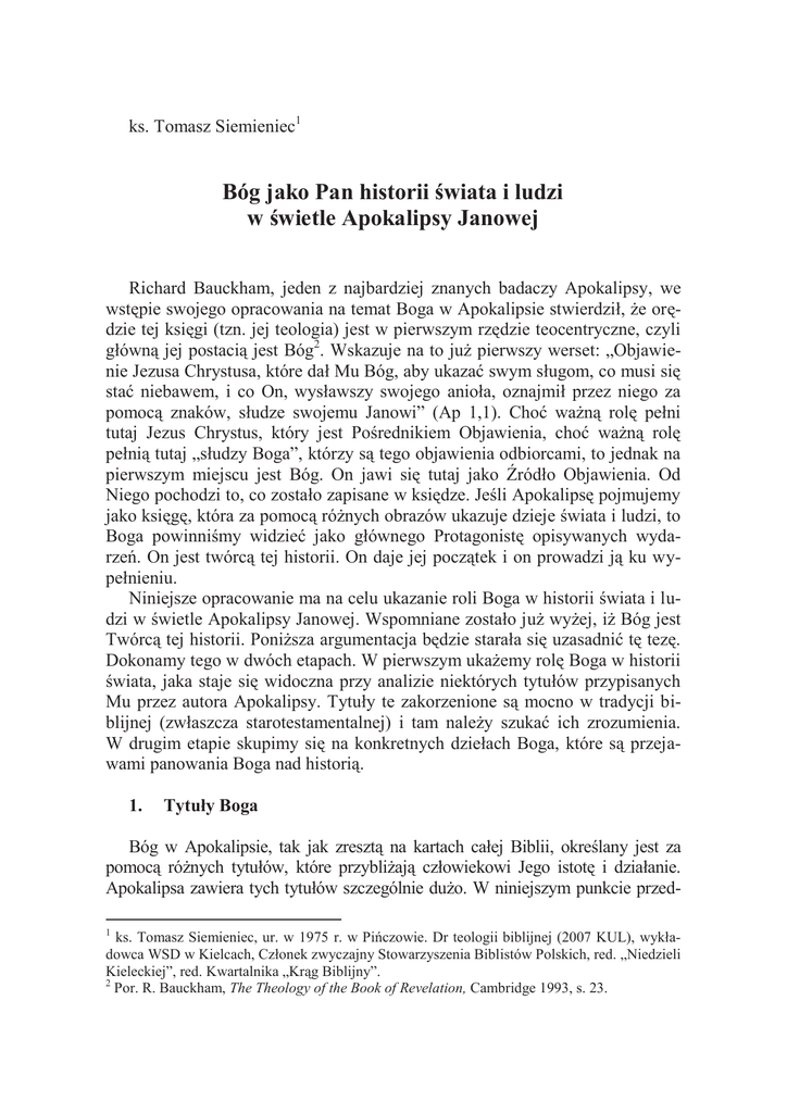 ks. Tomasz Siemieniec1 Bóg jako Pan historii świata i ludzi w świetle Apokalipsy Janowej Richard Bauckham, jeden z najbardziej znanych badaczy Apokalipsy, we wstępie swojego opracowania na temat Boga w Apokalipsie stwierdził, że orędzie tej księgi (tzn. jej teologia) jest w pierwszym rzędzie teocentryczne, czyli główną jej postacią jest Bóg2. Wskazuje na to już pierwszy werset: „Objawienie Jezusa Chrystusa, które dał Mu Bóg, aby ukazać swym sługom, co musi się stać niebawem, i co On, wysławszy swojego anioła, oznajmił przez niego za pomocą znaków, słudze swojemu Janowi” (Ap 1,1). Choć ważną rolę pełni tutaj Jezus Chrystus, który jest Pośrednikiem Objawienia, choć ważną rolę pełnią tutaj „słudzy Boga”, którzy są tego objawienia odbiorcami, to jednak na pierwszym miejscu jest Bóg. On jawi się tutaj jako Źródło Objawienia. Od Niego pochodzi to, co zostało zapisane w księdze. Jeśli Apokalipsę pojmujemy jako księgę, która za pomocą różnych obrazów ukazuje dzieje świata i ludzi, to Boga powinniśmy widzieć jako głównego Protagonistę opisywanych wydarzeń. On jest twórcą tej historii. On daje jej początek i on prowadzi ją ku wypełnieniu. Niniejsze opracowanie ma na celu ukazanie roli Boga w historii świata i ludzi w świetle Apokalipsy Janowej. Wspomniane zostało już wyżej, iż Bóg jest Twórcą tej historii. Poniższa argumentacja będzie starała się uzasadnić tę tezę. Dokonamy tego w dwóch etapach. W pierwszym ukażemy rolę Boga w historii świata, jaka staje się widoczna przy analizie niektórych tytułów przypisanych Mu przez autora Apokalipsy. Tytuły te zakorzenione są mocno w tradycji biblijnej (zwłaszcza starotestamentalnej) i tam należy szukać ich zrozumienia. W drugim etapie skupimy się na konkretnych dziełach Boga, które są przejawami panowania Boga nad historią. 1. Tytuły Boga Bóg w Apokalipsie, tak jak zresztą na kartach całej Biblii, określany jest za pomocą różnych tytułów, które przybliżają człowiekowi Jego istotę i działanie. Apokalipsa zawiera tych tytułów szczególnie dużo. W niniejszym punkcie przed1 ks. Tomasz Siemieniec, ur. w 1975 r. w Pińczowie. Dr teologii biblijnej (2007 KUL), wykładowca WSD w Kielcach, Członek zwyczajny Stowarzyszenia Biblistów Polskich, red. „Niedzieli Kieleckiej”, red. Kwartalnika „Krąg Biblijny”. 2 Por. R. Bauckham, The Theology of the Book of Revelation, Cambridge 1993, s. 23. 130 Bóg jako Pan historii świata i ludzi w świetle Apokalipsy Janowej stawimy te tytuły, które ukazują Boga działającego w historii świata i ludzi. Tytuły te swoje pełne znaczenie ujawnią, kiedy uwzględnimy ich starotestamentalne tło. 1.1. Ten, Który jest i Który był, i Który przychodzi Takie określenie Boga pojawia się w Apokalipsie pięć razy 1,4; 1,8; 4,8; 11,17; 16,5, z czego dwukrotnie przybiera ono formę krótszą, bez ostatniego elementu (11,17; 16,5). Określenie w formie dłuższej składa się z trzech elementów (każdy z nich poprzedzony rodzajnikiem rodzaju męskiego, odnoszącym się do Boga): „Ten, który jest” (gr. ho ōn); „Ten, który był” (gr. ho ēn) oraz „Ten, który przychodzi” (gr. ho erchomenos)3. Pierwsze ze wspomnianych wyrażeń było popularne wśród greckojęzycznych Żydów, którzy wywodzili je od frazy egō eimi ho ōn, stosowanej w Septuagincie dla oddania hebrajskiego wyrażenia ’ehjeh ’ăšer ’ehjeh (np. Wj 3,14). U Józefa Flawiusza wyrażenie ho ōn pojawia się także w ustach Eliasza w tekście 1 Krl 19,10 (za to nie ma go tam, gdzie Flawiusz nawiązuje do Wj 3,14). Filon Aleksandryjski także używa tego zwrotu, czasem dodając jeszcze rzeczownik theos (a więc całe wyrażenie brzmi ho ōn theos). Prawdopodobnie upodobanie do stosowania tej frazy przez zhellenizowanych Żydów było powodem, że kilka razy została ona umieszczona w Księdze Jeremiasza w wersji Septuaginty (1,6; 4,10; 14,13; 39,17)4. Późniejsza tradycja żydowska interpretowała wyrażenie zawarte w Wj 3,14 (w przekładzie greckim) jako stwierdzenie Bożej wieczności. Widoczne jest to np. u Filona z Aleksandrii (Mos. 1,74-75). Także greckie papirusy magiczne (które czasem wykazują wpływy żydowskie) wskazują na sporą częstotliwość zapożyczania od żydów imienia Bożego5. Warto w tym miejscu zwrócić uwagę na możliwy wpływ judaizmu rabinackiego na pojawiające się w Ap 1,4 potrójne określenie Boga. Teksty judaistyczne komentujące Wj 3,14 zauważają, że Imię Boże objawione Mojżeszowi na Synaju wyraża z jednej strony niezmienność Boga, z drugiej zaś Jego trwałą 3 Z trzech czasowników dwa skrajne są imiesłowami, a środkowy (ēn) ma formę imperfectum. Uczeni zastanawiają się, dlaczego autor zastosował takie formy. Jedno z wyjaśnień postuluje, że imperfectum pojawia się dlatego, że nie ma odpowiedniego imiesłowu dla wyrażenia trwania w przeszłości (czyli nie istnieje forma participium imperfecti), gdyby natomiast zastosować tu inny czasownik (także oddający sens hebrajskiego hājāh) – ginomai, to mógłby on nasuwać skojarzenia z jakąś zmiennością, która istnieje w Bogu, a Bóg jest niezmienny. Por. M. McNamara, The New Testament and the Palestinian Targum to the Pentateuch (Analecta Biblica 27), Roma 1978, s. 100. 4 Na marginesie można dodać, że samo wyrażenie nieobce było żydom mieszkającym w Azji Mniejszej, ponieważ na ołtarzu w Pergamonie była inskrypcja theos kyrios ho ōn eis aei („Bóg, Pan, który istnieje na zawsze”). Por. D.E. Aune, Revelation 1-5 (Word Biblical Commentary 52a), Dallas 1997, s. 30. 5 Np. papirus oznaczony symbolem PGM LXXI, w w. 3-4 wymienia trzy wyrażenia znane z Apokalipsy: ho ōn, kyrios i pantokratōr. Por. D.E. Aune, Revelation 1-5, dz. cyt., s.30; H.D. Betz, The Greek Magical Papyri in Translation including the Demotic Spells, Chicago – London 1986, s. 298. ks. Tomasz Siemieniec 131 opiekę n