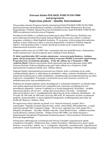 Patronat Klubu POLSKIE FORUM ISO 9000 nad programem Najwyższa jakość - Quality International Od początku istnienia Programu Quality International Klub POLSKIE FORUM ISO 9000 sprawuje patronat nad programem wspólnie z przedstawicielami Ministerstwa Rozwoju Regionalnego i Polskiej Agencji Rozwoju Przedsiębiorczości, Klub POLSKIE FORUM ISO 9000 jest partnerem merytorycznym Programu. Przedstawiciele Klubu, w osobach przewodniczącej sekcji MŚP Grażyny Żarlickiej oraz przewodniczącej Komisji Rewizyjnej Jadwigi Majcher biorą czynny udział w realizacji programu, wchodzą w skład Kapituły konkursu. W swej pracy wykorzystują doświadczenia zdobyte w pracy klubowej a także w pracach eksperckich w konkursie Polskiej Nagrody Jakości. Nasi przedstawiciele w istotny sposób przyczynili się do wypracowania jednoznacznych kryteriów oceny. Program realizowany jest od 2007 roku i systematycznie jest modyfikowany i doskonalony. Został zainicjowany i jest prowadzony przez redakcję Forum Biznesu. W dniu 6 października 2011 została zakończona - uroczystą galą finałową - kolejna, piata, edycja programu. Gala podczas której wręczono Medale Laureatów tegorocznego Programu oraz wyróżnienia specjalne – Perły QI. odbyła się w Poznaniu w IBB Andersia Hotel. Podczas uroczystości Klub reprezentowała przewodnicząca sekcji MŚP Grażyna Żarlicka. Podczas ubiegłorocznej gali, która odbyła się w Krakowie, Klub reprezentował wiceprezes Klubu, prof. Tadeusz Sikora. Nagroda Quality International przyznawana jest firmom, które wyróżniają się na rynku czytelną polityką jakości w odniesieniu do produktów, usług i systemu zarządzania a także, w ramach prowadzonej przez siebie działalności, charakteryzują się konkurencyjnością na rynku krajowym i europejskim. Przyznanie wyróżnienia ma na celu tworzenie wzorców do naśladowania przez inne przedsiębiorstwa. Podstawą do przeprowadzenia analiz decydujących o wyłonieniu finalistów są oficjalne dane oraz opinia organizacji biznesowych i gospodarczych, instytucji certyfikujących oraz powołanych ekspertów. Laureaci wyłaniani są w trzech kategoriach: QI product – produkt najwyższej jakości, QI services – usługi najwyższej jakości, QI order – zarządzanie najwyższej jakości oraz w 4 podkategoriach odnoszących się do wielkości zatrudnienia – do 10 osób, do 100 osób, do 500 osób i powyżej 500 osób. W zależności od ilości uzyskanych punktów, proporcjonalnie w poszczególnych kategoriach i podkategoriach przyznaje się Godła QI: Brązowe, Srebrne, Złote. Do tegorocznej edycji zgłosiło się ponad 3 tys. różnych instytucji, uczelni, firm i samorządów. Nagrody uzyskało (łącznie brąz, srebro, złoto) blisko 200 podmiotów, z czego najwięcej (ponad 100) w kategorii usługa – QI services, najmniej (nie wiele ponad 30) w kategorii zarządzanie – QI order. Medale wręczały: Anna Biszkowiecka – redaktor naczelna Forum Biznesu, Grażyna Żarlicka – Polskie Forum ISO 9000, oraz Marta Paciorek z Departamentu Zarządzania Programami Konkurencyjności i Innowacyjności Ministerstwa Rozwoju Regionalnego. Wśród gości odbierających wyróżnienia byli Prezesi Zarządów nagrodzonych spółek, Członkowie Zarządów i Właściciele firm, a także Prezydenci i Burmistrzowie miast i gmin. Podczas uroczystości odbyły się 4 wystąpienia eksperckie przedstawicieli nagrodzonych podmiotów: Jacek Grzybowski - Zastępca Dyrektora Regionalnego Oddziału Korporacyjnego PKO Banku Polskiego w Poznaniu; Lubomir Jurczak – Prezes Zarządu RTA Sp. z o.o., który mówił o własnym, autorskim systemie zarządzania jakością; Janina Liedtke-Jarema – Dyrektor Gdańskiego Miejskiego Ośrodka Pomocy Społecznej, która zabrała głos na temat „Innowacyjnych działań w systemie zarządzania pomocą społeczną”; oraz Lesław Wojtas – Prezes Zarządu Podkarpackiego Banku Spółdzielczego w Sanoku (pięciokrotny Laureat Programu QI), który jako Wicekanclerz Loży Business Center Club zabrał głos na temat „Postępu technologicznego, jako drogi do jakości – zastosowanie biometrii w Polsce i w Europie”. Podczas uroczystej Gali wręczono także Perły QI 2011, które odbierali przedstawiciele trzykrotnych Laureatów Programu Najwyższa Jakość: Banku BPH S.A., firmy EkoWodrol Sp. z o.o. Przedsiębiorstwo Inżynierii Środowiska, Jednostki Innowacyjno-Wdrożeniowej „INWEX” Sp. z o.o., Olimp Laboratories Sp. z o.o., przedsiębiorstwa Plum Sp. z o.o., Przedsiębiorstwa Gospodarki Komunalnej Sp. z o.o. w Słupsku, firmy SABEL - Biuro Wdrożeniowo-Projektowe Roman Sabat, PPUH Voigt Sp. z o.o., Young Digital Planet SA oraz „Zamku na Skale” (firma NEYA Sp. z o.o.).