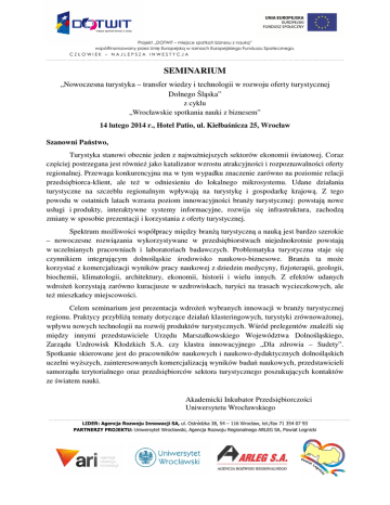Projekt „DOTWIT – miejsce spotkań biznesu z nauką” współfinansowany przez Unię Europejską w ramach Europejskiego Funduszu Społecznego. CZŁOWIEK – NAJLEPSZA INWESTYCJA SEMINARIUM „Nowoczesna turystyka – transfer wiedzy i technologii w rozwoju oferty turystycznej Dolnego Śląska” z cyklu „Wrocławskie spotkania nauki z biznesem” 14 lutego 2014 r., Hotel Patio, ul. Kiełbaśnicza 25, Wrocław Szanowni Państwo, Turystyka stanowi obecnie jeden z najważniejszych sektorów ekonomii światowej. Coraz częściej postrzegana jest również jako katalizator wzrostu atrakcyjności i rozpoznawalności oferty regionalnej. Przewaga konkurencyjna ma w tym wypadku znaczenie zarówno na poziomie relacji przedsiębiorca-klient, ale też w odniesieniu do lokalnego mikrosystemu. Udane działania turystyczne na szczeblu regionalnym wpływają na turystykę i gospodarkę krajową. Z tego powodu w ostatnich latach wzrasta poziom innowacyjności branży turystycznej: powstają nowe usługi i produkty, interaktywne systemy informacyjne, rozwija się infrastruktura, zachodzą zmiany w sposobie prezentacji i korzystania z oferty turystycznej. Spektrum możliwości współpracy między branżą turystyczną a nauką jest bardzo szerokie – nowoczesne rozwiązania wykorzystywane w przedsiębiorstwach niejednokrotnie powstają w uczelnianych pracowniach i laboratoriach badawczych. Problematyka turystyczna staje się czynnikiem integrującym dolnośląskie środowisko naukowo-biznesowe. Branża ta może korzystać z komercjalizacji wyników pracy naukowej z dziedzin medycyny, fizjoterapii, geologii, biochemii, klimatologii, architektury, ekonomii, historii i wielu innych. Z efektów udanych wdrożeń korzystają zarówno kuracjusze w uzdrowiskach, turyści na trasach wycieczkowych, ale też mieszkańcy miejscowości. Celem seminarium jest prezentacja wdrożeń wybranych innowacji w branży turystycznej regionu. Praktycy przybliżą tematy dotyczące działań klasteringowych, turystyki zrównoważonej, wpływu nowych technologii na rozwój produktów turystycznych. Wśród prelegentów znaleźli się między innymi przedstawiciele Urzędu Marszałkowskiego Województwa Dolnośląskiego, Zarządu Uzdrowisk Kłodzkich S.A. czy klastra innowacyjnego „Dla zdrowia – Sudety”. Spotkanie skierowane jest do pracowników naukowych i naukowo-dydaktycznych dolnośląskich uczelni wyższych, zainteresowanych komercjalizacją wyników badań naukowych, przedstawicieli samorządu terytorialnego oraz przedsiębiorców sektora turystycznego poszukujących kontaktów ze światem nauki. Akademicki Inkubator Przedsiębiorczości Uniwersytetu Wrocławskiego LIDER: Agencja Rozwoju Innowacji SA, ul. Ostródzka 38, 54 – 116 Wrocław, tel./fax 71 354 07 93 PARTNERZY PROJEKTU: Uniwersytet Wrocławski, Agencja Rozwoju Regionalnego ARLEG SA, Powiat Legnicki Projekt „DOTWIT – miejsce spotkań biznesu z nauką” współfinansowany przez Unię Europejską w ramach Europejskiego Funduszu Społecznego. CZŁOWIEK – NAJLEPSZA INWESTYCJA PLAN SEMINARIUM 8:30 Rejestracja uczestników 9:00 Mgr Tomasz Niciak – Dyrektor AIP UWr – Otwarcie seminarium 9:10 Zuzanna Szawuła – Projekt „DOTWIT – miejsce spotkań biznesu z nauką” 9:20 Wojciech Biliński, Dyrektor Wydziału Turystyki UMWD Branża turystyczna w działaniach województwa dolnośląskiego do roku 2020 – perspektywy, założenia, finansowanie 10:00 Dr Bogusław Bałuka, Przewodniczący Rady Programowej Klastra Innowacyjnego „Dla zdrowia – Sudety”, Dziekan Wydziału Nauk Społecznych i Zdrowia WWSZiP Potencjał Klastra Innowacyjnego „Dla zdrowia – Sudety” a rozwój turystyki Dolnego Śląska 10:40 Dominika Jaśkiewicz, Ansee Consulting Rozwój turystyki w zgodzie z przyrodą i dziedzictwem kulturowym na Dolnym Śląsku 11:20 Przerwa kawowa 12.00 Dr Robert Szmytkie, Instytut Geografii i Rozwoju Regionalnego, UWr Komercjalizacja wyników projektów naukowo-badawczych a rozwój turystyki Dolnego Śląska 12.40 Radek Miszczak, Joy Intermedia Sp. z o.o. Komercjalizacja wiedzy w projekcie aplikacji mobilnej Dolny Śląsk Guide LIDER: Agencja Rozwoju Innowacji SA, ul. Ostródzka 38, 54 – 116 Wrocław, tel./fax 71 354 07 93 PARTNERZY PROJEKTU: Uniwersytet Wrocławski, Agencja Rozwoju Regionalnego ARLEG SA, Powiat Legnicki Projekt „DOTWIT – miejsce spotkań biznesu z nauką” współfinansowany przez Unię Europejską w ramach Europejskiego Funduszu Społecznego. CZŁOWIEK – NAJLEPSZA INWESTYCJA 13:20 Renata Maślanka, prezes Zarządu Uzdrowisk Kłodzkich S.A. – Grupa PGU Innowacyjne aspekty funkcjonowania uzdrowisk dolnośląskich na przykładzie Uzdrowisk Kłodzkich S.A. 14:00 Lunch i networking R.S.V.P. do 13 lutego 2014 roku, przesyłając zgłoszenie (imię, nazwisko, stopień naukowy, reprezentowana uczelnia lub firma, telefon kontaktowy) na adres: [email protected]. Zgłoszenia telefoniczne pod numerem: 71 375 70 10 w godz. 8:00–10:00. Ilość miejsc jest ograniczona, decyduje kolejność zgłoszeń. Udział w seminarium jest bezpłatny. LIDER: Agencja Rozwoju Innowacji SA, ul. Ostródzka 38, 54 – 116 Wrocław, tel./fax 71 354 07 93 PARTNERZY PROJEKTU: Uniwersytet Wrocławski, Agencja Rozwoju Regionalnego ARLEG SA, Powiat Legnicki