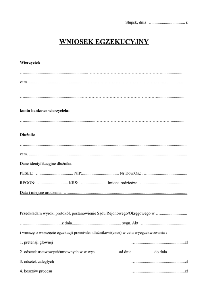 Słupsk, dnia …................................ r. WNIOSEK EGZEKUCYJNY Wierzyciel: …............................................................………………………………………………................... zam. .......................................................……………………………………………….................... ….......................................................……………………………………………….......................... konto bankowe wierzyciela: …....................................................................………………………………………………............. Dłużnik: …............................................................................................................................................................ zam. ....................................................................................................................................................... Dane identyfikacyjne dłużnika: PESEL: …................................. NIP:................................... Nr Dow.Os.: …....................................... REGON: ….......................... KRS: …...................... Imiona rodziców: …........................................... Data i miejsce urodzenia: ….................................................................................................................. Przedkładam wyrok, protokół, postanowienie Sądu Rejonowego/Okręgowego w ….......................... …....................................z dnia............................................... sygn. Akt ….......................................... i wnoszę o wszczęcie egzekucji przeciwko dłużnikowi(czce) w celu wyegzekwowania : 1. pretensji głównej 2. odsetek ustawowych/umownych w w wys. …......... …...............................................zł od dnia......................do dnia.................... 3. odsetek zaległych …...............................................zł 4. kosztów procesu …...............................................zł 5. kosztów klauzuli …...............................................zł 6. kosztów zastępstwa adwokackiego w procesie …...............................................zł 7. kosztów zastępstwa adwokackiego w egzekucji …...............................................zł 8. kosztów poprzedniej egzekucji …...............................................zł 9. kosztów innych …...............................................zł 10. kosztów egzekucyjnych, które powstaną w toku egzekucji Wnoszę o wszczęcie egzekucji z: ruchomości dłużnika: …..................................................................................................................... konta bankowego dłużnika: …............................................................................................................ wierzytelności dłużnika: …................................................................................................................. wynagrodzenia za pracę: …................................................................................................................ emerytury/renty: …............................................................................................................................. nieruchomości dłużnika: …................................................................................................................ innych praw majątkowych: …............................................................................................................ Wierzyciel oświadcza, że jeżeli dłużnik nie wskaże majątku w trybie art. 801 kpc wówczas Wierzyciel zleca poszukiwanie majątku dłużnika w trybie art. 801 ind 2 kpc. Wierzyciel oświadcza, że dokonuje wyboru Komornika na podstawie przepisuart. 8 ust.6 ustawy z dnia 15.05.2015r. o komornikach sądowych i egzekucji (tj. Dz.U. z 2015 r. Poz.790) . Załącznik: - oryginał tytułu wykonawczego ______________________ podpis wierzyciela