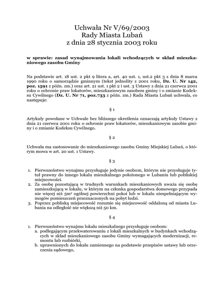Uchwała Nr V/69/2003 Rady Miasta Lubań z dnia 28 stycznia 2003 roku w sprawie: zasad wynajmowania lokali wchodzących w skład mieszkaniowego zasobu Gminy Na podstawie art. 18 ust. 2 pkt 9 litera a, art. 40 ust. 1, ust.2 pkt 3 z dnia 8 marca 1990 roku o samorządzie gminnym (tekst jednolity z 2001 roku, Dz. U. Nr 142, poz. 1591 z późn. zm.) oraz art. 21 ust. 1 pkt 2 i ust. 3 Ustawy z dnia 21 czerwca 2001 roku o ochronie praw lokatorów, mieszkaniowym zasobem gminy i o zmianie Kodeksu Cywilnego (Dz. U. Nr 71, poz.733 z późn. zm.) Rada Miasta Lubań uchwala, co następuje: §1 Artykuły powołane w Uchwale bez bliższego określenia oznaczają artykuły Ustawy z dnia 21 czerwca 2001 roku o ochronie praw lokatorów, mieszkaniowym zasobie gminy i o zmianie Kodeksu Cywilnego. §2 Uchwała ma zastosowanie do mieszkaniowego zasobu Gminy Miejskiej Lubań, o którym mowa w art. 20 ust. 1 Ustawy. §3 1. Pierwszeństwo wynajmu przysługuje jedynie osobom, którym nie przysługuje tytuł prawny do innego lokalu mieszkalnego położonego w Lubaniu lub pobliskiej miejscowości. 2. Za osobę pozostającą w trudnych warunkach mieszkaniowych uważa się osobę zamieszkującą w lokalu, w którym na członka gospodarstwa domowego przypada nie więcej niż 5m2 ogólnej powierzchni pokoi lub w lokalu niespełniającym wymogów pomieszczeń przeznaczonych na pobyt ludzi. 3. Poprzez pobliską miejscowość rozumie się miejscowość oddaloną od miasta Lubania na odległość nie większą niż 50 km. §4 1. Pierwszeństwo wynajmu lokalu mieszkalnego przysługuje osobom: a. podlegającym przekwaterowaniu z lokali mieszkalnych w budynkach wchodzących w skład mieszkaniowego zasobu Gminy wymagających modernizacji, remontu lub rozbiórki, b. uprawnionych do lokalu zamiennego na podstawie przepisów ustawy lub orzeczenia sądowego, c. które uzyskały w trybie odrębnych przepisów pozwolenie na nadbudowę rozbudowę lub przebudowę pomieszczeń niemieszkalnych na cele mieszkalne w budynkach stanowiących zasób mieszkaniowy Gminy. 2. Lokale mieszkalne mogą być również wynajmowane osobom pozostającym w trudnych warunkach mieszkaniowych i osiągającym średni miesięczny dochód na jednego członka gospodarstwa domowego w okresie trzech miesięcy poprzedzających datę wskazania lokalu nieprzekraczający 150% najniższej emerytury w gospodarstwie jednoosobowym i 100% w gospodarstwie wieloosobowym o ile mieszkają i są zameldowani w Lubaniu na pobyt stały nie krócej niż 5 lat od daty złożenia wniosku. §5 1. Lokale mieszkalne mogą być wynajmowane jako lokale socjalne, jeżeli odpowiadają warunkom określonym w art. 2 ust. 1 pkt 5 Ustawy. 2. Umowę najmu lokalu socjalnego zawiera się na okres 2 lat. 3. Administracje Budynków Komunalnych proponują z mieszkaniowego zasobu Gminy lokale, które po opróżnieniu będą oddawane w najem jako lokale socjalne. §6 Pierwszeństwo wynajmu lokalu socjalnego przysługuje osobom, które: 1. nabyły prawo do takiego lokalu na podstawie orzeczenia sądowego, 2. opuściły dom dziecka w związku z uzyskaniem pełnoletności, o ile wywodzą się z Lubania, 3. utraciły mieszkanie na terenie miasta Lubania w skutek klęski żywiołowej, katastrofy lub pożaru, 4. opuściły zakład karny, a nie posiadają prawa powrotu do poprzedniego miejsca zamieszkania, o ile znajduje się ono w mieście Lubaniu, 5. osiągają średni miesięczny dochód na jednego członka gospodarstwa domowego miesięcy okresie trzech miesięcy poprzedzających datę wskazania lokalu, nie przekraczający 6. 75 % najniższej emerytury w gospodarstwie jednoosobowym i 50 % w gospodarstwie wieloosobowym. §7 Lokale mieszkalne, w których powierzchnia użytkowa przekracza 80 m2 oddawane są w najem za zapłatę czynszu wolnego, ustalonego w trybie przetargu nieograniczonego. §8 Osobom, które pozostały w lokalu opuszczonym przez najemcę lub w lokalu, w którego najem nie wstąpiły po śmierci najemcy na podstawie art. 691 kodeksu cywilnego mogą być one oddane w najem, jeżeli są pełnoletni oraz spełniają warunki wymienione w § 3 ust. 1 oraz § 4 ust. 2. §9 Osoby ubiegające się o wynajem lokalu mieszkalnego lub socjalnego z zasobu mieszkaniowego Gminy składają w tym celu wniosek, o najem, w Urzędzie Miasta. Strona 2 Wzór wniosku określa Burmistrz Miasta Lubań. § 10 1. W celu zapewnienia kontroli społecznej załatwiania wniosków o najem lokali w mieście działa Zespół Opiniodawczy ds. przydziału mieszkań powoływany przez Burmistrza. 2. W skład Zespołu Opiniodawczego powołanego przez Burmistrza nie mogą wchodzić osoby będące pracownikami samorządowymi. § 11 Do zadań Zespołu Opiniodawczego należy: 1. ustalanie propozycji listy osób spełniających warunki do umieszczenia ich na wykazie osób zakwalifikowanych do podpisania umów najmu, 2. proponowanie Burmistrzowi kolejności zawierania umów najmu z osobami umieszczonymi w wykazie, 3. opiniowanie propozycji zamian lokali, 4. opiniowanie projektów rozstrzygnięć burmistrza w sprawach wniosków lokatorów o podnajem w przypadkach nie wyrażenia zgody przez administratora mieszkań komunalnych. § 12 Rozstrzygnięcia zapadają zwykłą większością głosów przy obecności przynajmniej połowy członków Zespołu Opiniodawczego. § 13 1. Zakwalifikowania wniosków w oparciu o zasady określone w Uchwale dokonuje Zespół Opiniodawczy. 2. Osoby zakwalifikowane umieszcza się w wykazie osób zakwalifikowanych do podpisania umów najmu (zwanych dalej wykazem) z podziałem na typy mieszkań, prowadzonych w formie odrębnych list § 14 1. Wskazania osoby do podpisania umowy dokonuje Burmistrz spośród osób umieszczonych w wykazie po uzyskaniu pozytywnej opinii Zespołu Opiniodawczego. 2. Wskazanie następuje w formie pisemnej i jest poleceniem dla Administracji Budynków Komunalnych do podpisania stosownej umowy najmu. 3. Wskazanie podpisuje Burmistrz Miasta. § 15 1. Najemcy lokali mieszkalnych mogą do