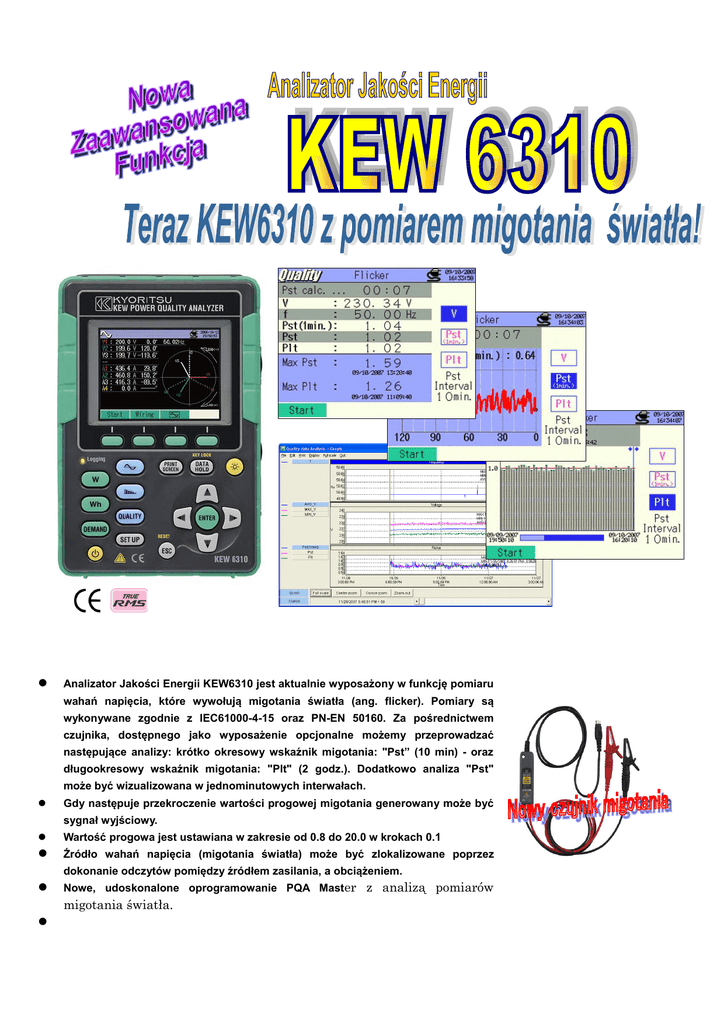 Analizator Jakości Energii KEW6310 jest aktualnie wyposażony w funkcję pomiaru wahań napięcia, które wywołują migotania światła (ang. flicker). Pomiary są wykonywane zgodnie z IEC61000-4-15 oraz PN-EN 50160. Za pośrednictwem czujnika, dostępnego jako wyposażenie opcjonalne możemy przeprowadzać następujące analizy: krótko okresowy wskaźnik migotania: "Pst” (10 min) - oraz długookresowy wskaźnik migotania: "Plt" (2 godz.). Dodatkowo analiza "Pst" może być wizualizowana w jednominutowych interwałach. Gdy następuje przekroczenie wartości progowej migotania generowany może być sygnał wyjściowy. Wartość progowa jest ustawiana w zakresie od 0.8 do 20.0 w krokach 0.1 Źródło wahań napięcia (migotania światła) może być zlokalizowane poprzez dokonanie odczytów pomiędzy źródłem zasilania, a obciążeniem. Nowe, udoskonalone oprogramowanie PQA Master z analizą pomiarów migotania światła. Złącze wyj.DIN terminal Wyposażenie opcjonalne Czujnik migotania KEW8325F KEW8325F Specyfikacja Max napięcie wejściowe Napięcie wyjściowe Zakres pomiarowy Dokładność (zakr.częstot.) Warunki eksploatacji Impedancja wej. Impedancja wyj. Warunki środowiskowe Zgodność z normami Wytrzymałość elektryczna Wymiary i waga Długość przewowdów Złącze wyj. Akcesoria Zakres napięcia Filtracja Pom iary Wyj.wartość progowa Czujnik Końcówki pomiarowe AC 600V rms, 848.8V peak AC 0~600V (wyj./wej. : mV/V) 6~600V ±0.5% odcz.±0.1mV (50/60Hz) 0~40°C, RH<85%, bez kondensacji ok. 3.2MΩ ok. 1kΩ wys. <2000m n.p.m. IEC/EN 61010-1:2001 , Pom. KAT III 600V. stopień zanieczyszczenia 2 IEC/EN 61010-031:2002 EN 61326:2001 AC 5350V przez 5sek. 87x26x17 mm/ 135g 2m MINI DIN 6PIN krokodylki 7197 150 / 300 / 600V 100 / 120 / 230V (dla napięć znamionow ych ośw ietlenia) Pst (1min) / Pst / Plt 0.8~20.0 IEC61000-4-15: 1997+A1: 2003, PN-EN 50160:1999-11+ EC:2004-09 Metoda pom iaru Pst(1min) : Zliczanie dla pomiaru 1min. Pst : Zliczanie dla pomiarów dla cyklu Pst. Plt :Zliczanie dla pomiarów dla cyklu Plt.. Dokładność pom iaru Pst=1 Dokładność mniejsza niż±5% (efektyw nie pomiędzy 50~100% każdego zakresu napięciow ego) (1)V : Czas zliczania Pst, Napięcie, Częstotl., Pst, Plt, Pst Max oraz Plt Max (przyw ołanie daty i godz.) Spos ób wizualizacji (2)Pst(1min) : Wykres zmian dla w artości Pst (1min) przez ostatnie 120 minut. (3)Plt :Wykres zamian w artości Plt ※ Pozostała specyfikacja w instrukcji KEW6310. Uwagi dla klientów: Pomiar migotania jest możliwy w miernikach KEW6310 z: firmware V.2.01, oprogramowaniem PQA Master v.2.01 oraz opcjonalnym czujnikiem OPROGRAMOWANIA) KEW8325F (MOŻLIWA AKTUALIZACJA POPRZEDNICH WERSJI Czym jest migotanie? Migotaniem światła nazywamy wrażenie niestabilności postrzegania wzrokowego spowodowane przez bodziec świetlny, którego luminacja lub rozkład spektralny zmienia się w czasie. Jest to uzależnione od częstotliwości, natężenia zmian oświetlenia oraz od obserwatora. Powyżej pewnej granicy migotanie staje się uciążliwe. Uciążliwość rośnie bardzo szybko wraz z wzrostem amplitudy wahań. Migotanie jest spowodowane poprzez okresowe wahania napięcia, a także przez przepięcia i zapady. Pochodzenie zjawiska migotania Urządzenia takie jak: piece łukowe, urządzenia spawające, windy, dźwigi są źródłem wahań napięcia, którego następstwem jest zjawisko migotania światła. Wpływ zjawiska migotania na urzadzenia Wahania jasności żarówek, lamp rtęciowych, monitorów komputerowych, telewizorów itp. Możliwe zmniejszenie momentu obrotowego silników elektrycznych. Możliwość utraty danych z komputerów. Przeciwdziałanie zjawisku migotania Zwiększenie mocy zwarciowej. Wdrożenie systemów kompensacji: Meraserw-5 s.c. 70-312 Szczecin , ul.Gen.Józefa Bema 5 tel.091 484-21-55 fax 091 484-09-86 e-mail:[email protected] www.meraserw.szczecin.pl
