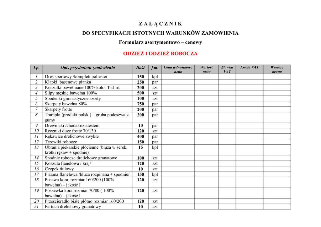 ZAŁĄCZNIK DO SPECYFIKACJI ISTOTNYCH WARUNKÓW ZAMÓWIENIA Formularz asortymentowo – cenowy ODZIEŻ I ODZIEŻ ROBOCZA Lp. Opis przedmiotu zamówienia Ilość j.m. 1 2 3 4 5 6 7 8 Dres sportowy /komplet/ poliester Klapki basenowe pianka Koszulki bawełniane 100% kolor T-shirt Slipy męskie bawełna 100% Spodenki gimnastyczne szorty Skarpety bawełna 80% Skarpety frotte Trampki (produkt polski) – gruba podeszwa z gumy Drewniaki /chodaki/z atestem Ręczniki duże frotte 70/130 Rękawice drelichowe zwykłe Trzewiki robocze Ubrania piekarskie płócienne (bluza w serek, krótki rękaw + spodnie) Spodnie robocze drelichowe granatowe Koszula flanelowa / kraj/ Czepek tiulowy Piżama flanelowa /bluza rozpinana + spodnie/ Poszwa kora rozmiar 160/200 (100% bawełna) – jakość I Poszewka kora rozmiar 70/80 ( 100% bawełna) – jakość I Prześcieradło białe płótno rozmiar 160/200 Fartuch drelichowy granatowy 150 250 200 500 100 750 200 200 kpl par szt szt szt par par par 10 120 400 150 15 par szt par par kpl 100 120 10 150 120 szt szt szt kpl szt 120 szt 120 10 szt szt 9 10 11 12 13 14 15 16 17 18 19 20 21 Cena jednostkowa netto Wartość netto Stawka VAT Kwota VAT Wartość brutto 22 23 24 25 26 27 Fartuch biały płócienne Klapki białe (podgumowane) z atestem, pełne - damskie Klapki białe (podgumowane) z atestem, pełne - męskie Plecak szkolny koszulka polo Buty sportowe – halowe o parametrach i jakości nie gorszej niż ATLETICO 20 10 szt par 20 par 100 50 280 szt szt par Razem Razem Uwaga: przed złożeniem oferty należy zapoznać się ze wzorami odzieży dostępnymi w siedzibie zamawiającego