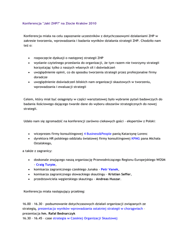 Konferencja "Jaki ZHP?" na Zlocie Kraków 2010 Konferencja miała na celu zapoznanie uczestników z dotychczasowymi działaniami ZHP w zakresie tworzenia, wprowadzania i badania wyników działania strategii ZHP. Chodziło nam też o: rozpoczęcie dyskusji o następnej strategii ZHP wysłanie czytelnego przesłania do organizacji, że tym razem nie tworzymy strategii korzystając tylko z naszych własnych sił i doświadczeń uwzględnienie opinii, co do sposobu tworzenia strategii przez profesjonalne firmy doradcze uwzględnienie doświadczeń bliskich nam organizacji skautowych w tworzeniu, wprowadzania i ewaluacji strategii Celem, który miał być osiągnięty w części warsztatowej było wybranie pytań badawczych do badania ilościowego dającego twarde dane do wyboru obszarów strategicznych do nowej strategii. Udało nam się zgromadzić na konferencji zarówno ciekawych gości - ekspertów z Polski: wiceprezes firmy konsultingowej 4 Business&People panią Katarzynę Lorenc dyrektora HR polskiego oddziału światowej firmy konsultingowej KPMG pana Michała Ostalskiego, a także z zagranicy: doskonale znającego naszą organizację Przewodniczącego Regionu Europejskiego WOSM - Craig Turpie, komisarza zagranicznego czeskiego Junaka - Petr Vanek, komisarza zagranicznego słowackiego skautingu - Kristian Seffer, przedstawiciela węgierskiego skautingu - Andreas Huszar. Konferencja miała następujący przebieg: 16.00 – 16.30 – podsumowanie dotychczasowych działań organizacji związanych ze strategią, prezentacja wyników wprowadzania ostatniej strategii w chorągwiach – prezentacja hm. Rafał Bednarczyk 16.30 – 16.45 – case strategia w Czeskiej Organizacji Skautowej 16.45 – 17.00 – case strategia w Słowackiej Organizacji Skautowej 17.00 – 17.15 – case strategia w Węgierskiej Organizacji Skautowej 17.15 – 17.30 – strategia realizowana przez Region Europejski WOSM i cele strategiczne WOSM na poziomie światowym – przewodniczący Europejskiego Regionu WOSM 17.30 – 17.45 – pytania do wszystkich prezentacji 17.45 – 17.50 – wytłumaczenie zadania i metodologii do pracy w grupach (3 grupy analizujące sytuację ZHP używając modelu 5 sił Portera dla ZHP, analizy rynku + klientów + konkurencji + marketing mix ZHP i SWOT ZHP) 17.50 – 18.00 – przerwa kawowa i zapisy do grup 18.00 – 18.15 – panel z przedstawicielami firm 4 Business&People i KPMG - jak ich zdaniem ZHP powinno stworzyć, wdrożyć i podsumować swoją strategię 18.15 – 18.20 – podział na grupy i przejście do miejsc pracy grup 18.20 – 19.15 – praca w grupach 19.15 – 19.30 – prezentacja wyników prac 3 grup (po 5 minut) 19.30 – podsumowanie i zakończenie konferencji