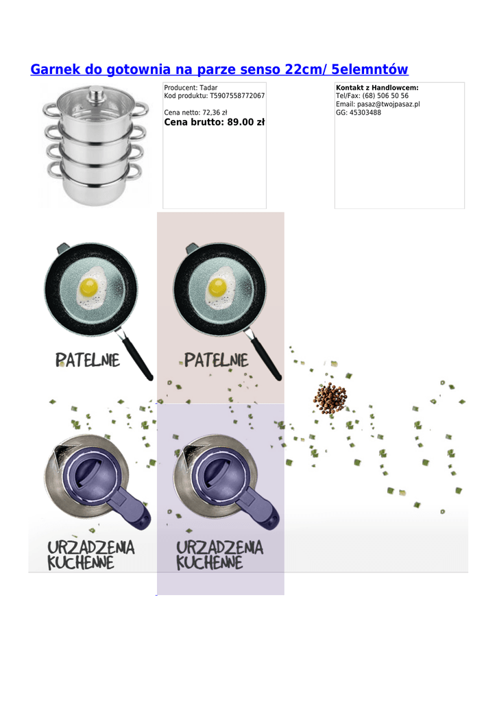 Garnek do gotownia na parze senso 22cm/ 5elemntów Producent: Tadar Kod produktu: T5907558772067 Cena netto: 72,36 zł Cena brutto: 89.00 zł Kontakt z Handlowcem: Tel/Fax: (68) 506 50 56 Email: [email protected] GG: 45303488 Garnek do gotownia na parze SENSO 22cm/ 5elemntów - Tadar Kod produktu: T5907558772067 GARNEK DO GOTOWANIA NA PARZE SENSO 22CM/ 5ELEM. Idealny garnek do gotowania na parze. Pozwoli gotowanym potrawom zachować naturalny smak, witaminy oraz pełnię wartości odżywczych. Naczynie dodatkowo zostało wyposażone w dwa wkłady do gotowania na parze oraz szklaną, żaroodporną pokrywkę. Trójwarstwowe dno produktu umożliwia dłuższą ciepłotę przygotowywanego posiłku oraz oszczędza czas użytkowania kuchenki. Informacja dodatkowa: ● ● ● ● ● ● ● ● ● ● ● ● ● Zachowanie naturalnego smaku, witamin oraz pełni wartości odżywczych przygotowywanych potraw Przygotowywanie posiłków odbywa się bez użycia tłuszczu Okrągłe brzegi naczyń umożliwiają łatwe przelewanie zawartości bez rozpryskiwania Trójwarstwowe dno termiczne naczyń Garnek - średnica: 22 cm Wkłady do gotowania na parze - średnica: 22 cm Zestaw wykonany ze stali nierdzewnej Ilość elementów w zestawie: 5 elem. (garnek, 3 wkłady do gotowania na parze, szklana pokrywka) Wykończenie zew: połysk Wykończenie wew: połysk Stalowe uchwyty Szklana żaroodporna pokrywa ze stalową obręczą Opakowanie: kolorowy karton Użytkowanie: ● ● ● ● ● Kuchenka gazowa Kuchenka elektryczna Kuchenka indukcyjna Kuchenka ceramiczna Energooszczędna ● ● Lodówka Kontakt z żywnością Kod produktu:T5907558772067 ID produktu:166675 Granos Group sp. z o.o. ul. Sulechowska 4a budynek 45 65-001 Zielona Góra