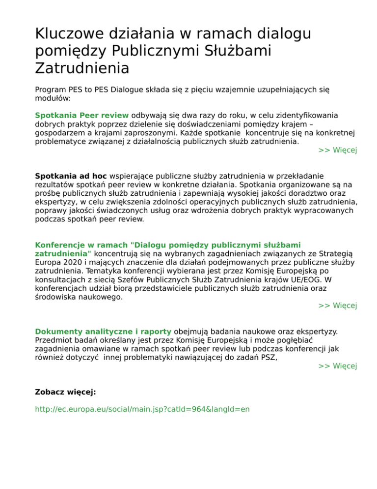 Kluczowe działania w ramach dialogu pomiędzy Publicznymi Służbami Zatrudnienia Program PES to PES Dialogue składa się z pięciu wzajemnie uzupełniających się modułów: Spotkania Peer review odbywają się dwa razy do roku, w celu zidentyfikowania dobrych praktyk poprzez dzielenie się doświadczeniami pomiędzy krajem – gospodarzem a krajami zaproszonymi. Każde spotkanie koncentruje się na konkretnej problematyce związanej z działalnością publicznych służb zatrudnienia. >> Więcej Spotkania ad hoc wspierające publiczne służby zatrudnienia w przekładanie rezultatów spotkań peer review w konkretne działania. Spotkania organizowane są na prośbę publicznych służb zatrudnienia i zapewniają wysokiej jakości doradztwo oraz ekspertyzy, w celu zwiększenia zdolności operacyjnych publicznych służb zatrudnienia, poprawy jakości świadczonych usług oraz wdrożenia dobrych praktyk wypracowanych podczas spotkań peer review. Konferencje w ramach "Dialogu pomiędzy publicznymi służbami zatrudnienia" koncentrują się na wybranych zagadnieniach związanych ze Strategią Europa 2020 i mających znaczenie dla działań podejmowanych przez publiczne służby zatrudnienia. Tematyka konferencji wybierana jest przez Komisję Europejską po konsultacjach z siecią Szefów Publicznych Służb Zatrudnienia krajów UE/EOG. W konferencjach udział biorą przedstawiciele publicznych służb zatrudnienia oraz środowiska naukowego. >> Więcej Dokumenty analityczne i raporty obejmują badania naukowe oraz ekspertyzy. Przedmiot badań określany jest przez Komisję Europejską i może pogłębiać zagadnienia omawiane w ramach spotkań peer review lub podczas konferencji jak również dotyczyć innej problematyki nawiązującej do zadań PSZ, >> Więcej Zobacz więcej: http://ec.europa.eu/social/main.jsp?catId=964&langId=en