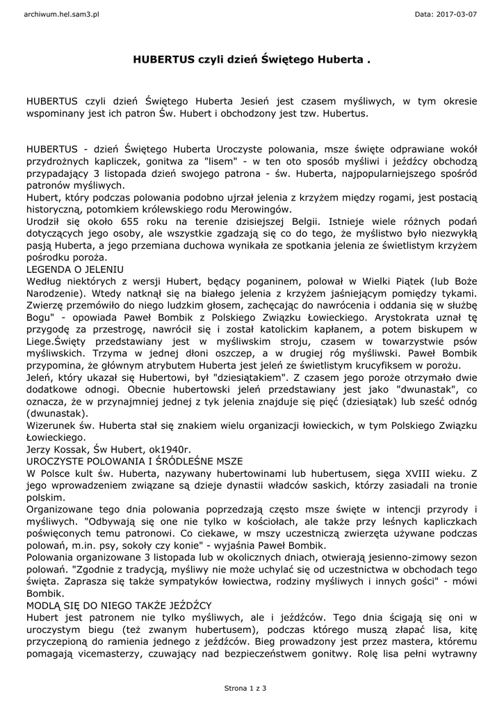 archiwum.hel.sam3.pl Data: 2017-03-07 HUBERTUS czyli dzień Świętego Huberta . HUBERTUS czyli dzień Świętego Huberta Jesień jest czasem myśliwych, w tym okresie wspominany jest ich patron Św. Hubert i obchodzony jest tzw. Hubertus. HUBERTUS - dzień Świętego Huberta Uroczyste polowania, msze święte odprawiane wokół przydrożnych kapliczek, gonitwa za "lisem" - w ten oto sposób myśliwi i jeźdźcy obchodzą przypadający 3 listopada dzień swojego patrona - św. Huberta, najpopularniejszego spośród patronów myśliwych. Hubert, który podczas polowania podobno ujrzał jelenia z krzyżem między rogami, jest postacią historyczną, potomkiem królewskiego rodu Merowingów. Urodził się około 655 roku na terenie dzisiejszej Belgii. Istnieje wiele różnych podań dotyczących jego osoby, ale wszystkie zgadzają się co do tego, że myślistwo było niezwykłą pasją Huberta, a jego przemiana duchowa wynikała ze spotkania jelenia ze świetlistym krzyżem pośrodku poroża. LEGENDA O JELENIU Według niektórych z wersji Hubert, będący poganinem, polował w Wielki Piątek (lub Boże Narodzenie). Wtedy natknął się na białego jelenia z krzyżem jaśniejącym pomiędzy tykami. Zwierzę przemówiło do niego ludzkim głosem, zachęcając do nawrócenia i oddania się w służbę Bogu" - opowiada Paweł Bombik z Polskiego Związku Łowieckiego. Arystokrata uznał tę przygodę za przestrogę, nawrócił się i został katolickim kapłanem, a potem biskupem w Liege.Święty przedstawiany jest w myśliwskim stroju, czasem w towarzystwie psów myśliwskich. Trzyma w jednej dłoni oszczep, a w drugiej róg myśliwski. Paweł Bombik przypomina, że głównym atrybutem Huberta jest jeleń ze świetlistym krucyfiksem w porożu. Jeleń, który ukazał się Hubertowi, był "dziesiątakiem". Z czasem jego poroże otrzymało dwie dodatkowe odnogi. Obecnie hubertowski jeleń przedstawiany jest jako "dwunastak", co oznacza, że w przynajmniej jednej z tyk jelenia znajduje się pięć (dziesiątak) lub sześć odnóg (dwunastak). Wizerunek św. Huberta stał się znakiem wielu organizacji łowieckich, w tym Polskiego Związku Łowieckiego. Jerzy Kossak, Św Hubert, ok1940r. UROCZYSTE POLOWANIA I ŚRÓDLEŚNE MSZE W Polsce kult św. Huberta, nazywany hubertowinami lub hubertusem, sięga XVIII wieku. Z jego wprowadzeniem związane są dzieje dynastii władców saskich, którzy zasiadali na tronie polskim. Organizowane tego dnia polowania poprzedzają często msze święte w intencji przyrody i myśliwych. "Odbywają się one nie tylko w kościołach, ale także przy leśnych kapliczkach poświęconych temu patronowi. Co ciekawe, w mszy uczestniczą zwierzęta używane podczas polowań, m.in. psy, sokoły czy konie" - wyjaśnia Paweł Bombik. Polowania organizowane 3 listopada lub w okolicznych dniach, otwierają jesienno-zimowy sezon polowań. "Zgodnie z tradycją, myśliwy nie może uchylać się od uczestnictwa w obchodach tego święta. Zaprasza się także sympatyków łowiectwa, rodziny myśliwych i innych gości" - mówi Bombik. MODLĄ SIĘ DO NIEGO TAKŻE JEŹDŹCY Hubert jest patronem nie tylko myśliwych, ale i jeźdźców. Tego dnia ścigają się oni w uroczystym biegu (też zwanym hubertusem), podczas którego muszą złapać lisa, kitę przyczepioną do ramienia jednego z jeźdźców. Bieg prowadzony jest przez mastera, któremu pomagają vicemasterzy, czuwający nad bezpieczeństwem gonitwy. Rolę lisa pełni wytrawny Strona 1 z 3 archiwum.hel.sam3.pl Data: 2017-03-07 HUBERTUS czyli dzień Świętego Huberta . jeździec, który do lewego ramienia ma przymocowaną autentyczną lisią kitę. "Dawniej były to prawdziwe polowania, typu par force - na lisa lub jelenia, a konnym myśliwym towarzyszyły psy" - mówi Paweł Bombik. Oznaczało to, że myśliwi ścigali zwierzynę do momentu, gdy padła. Oczywiście obecnie już się ich nie praktykuje. Uczestników gonitwy obowiązuje uroczysty strój: czerwony żakiet, biała koszula, biały żabot lub krawat, białe bryczesy, czarne buty i rękawiczki lub, jak zaznacza Bombik, marynarka w pepitkę, bryczesy, czarne buty, biała koszula i ciemny krawat. Tekst: Łukasz RazowskiŹródło: Strona 2 z 3 archiwum.hel.sam3.pl Data: 2017-03-07 HUBERTUS czyli dzień Świętego Huberta . http://nowepodhale.pl/publicystyka/felieton/3920-hubertus-czyli-dzien-swietego-hubertahttp://aktyw 03 - 11 - 2010 Strona 3 z 3
