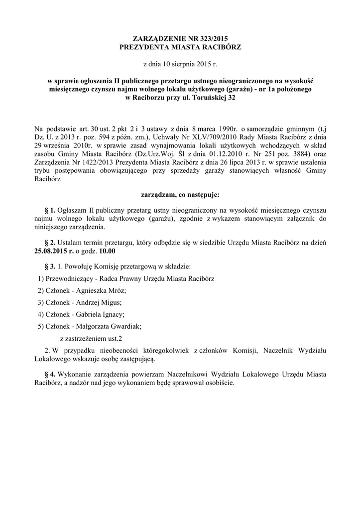 ZARZĄDZENIE NR 323/2015 PREZYDENTA MIASTA RACIBÓRZ z dnia 10 sierpnia 2015 r. w sprawie ogłoszenia II publicznego przetargu ustnego nieograniczonego na wysokość miesięcznego czynszu najmu wolnego lokalu użytkowego (garażu) - nr 1a położonego w Raciborzu przy ul. Toruńskiej 32 Na podstawie art. 30 ust. 2 pkt 2 i 3 ustawy z dnia 8 marca 1990r. o samorządzie gminnym (t.j Dz. U. z 2013 r. poz. 594 z późn. zm.), Uchwały Nr XLV/709/2010 Rady Miasta Racibórz z dnia 29 września 2010r. w sprawie zasad wynajmowania lokali użytkowych wchodzących w skład zasobu Gminy Miasta Racibórz (Dz.Urz.Woj. Śl z dnia 01.12.2010 r. Nr 251 poz. 3884) oraz Zarządzenia Nr 1422/2013 Prezydenta Miasta Racibórz z dnia 26 lipca 2013 r. w sprawie ustalenia trybu postępowania obowiązującego przy sprzedaży garaży stanowiących własność Gminy Racibórz zarządzam, co następuje: § 1. Ogłaszam II publiczny przetarg ustny nieograniczony na wysokość miesięcznego czynszu najmu wolnego lokalu użytkowego (garażu), zgodnie z wykazem stanowiącym załącznik do niniejszego zarządzenia. § 2. Ustalam termin przetargu, który odbędzie się w siedzibie Urzędu Miasta Racibórz na dzień 25.08.2015 r. o godz. 10.00 § 3. 1. Powołuję Komisję przetargową w składzie: 1) Przewodniczący - Radca Prawny Urzędu Miasta Racibórz 2) Członek - Agnieszka Mróz; 3) Członek - Andrzej Migus; 4) Członek - Gabriela Ignacy; 5) Członek - Małgorzata Gwardiak; z zastrzeżeniem ust.2 2. W przypadku nieobecności któregokolwiek z członków Komisji, Naczelnik Wydziału Lokalowego wskazuje osobę zastępującą. § 4. Wykonanie zarządzenia powierzam Naczelnikowi Wydziału Lokalowego Urzędu Miasta Racibórz, a nadzór nad jego wykonaniem będę sprawował osobiście. § 5. Zarządzenie wchodzi w życie z dniem podpisania. Prezydent Miasta Mirosław Lenk Załącznik do Zarządzenia Nr 323/2015 Prezydenta Miasta Racibórz z dnia 10 sierpnia 2015 r. WYKAZ wolnych lokali użytkowych (garaży) podlegających oddaniu w najem w drodze II publicznego przetargu ustnego nieograniczonego na wysokość miesięcznego czynszu najmu: 1) ul. Toruńska 32/1a – lokal użytkowy (garaż) składa się z jednego pomieszczenia o powierzchni użytkowej 13,32 m². Garaż znajduje się w przyziemiu budynku. W przedmiotowym lokalu użytkowym (garażu) brak jest instalacji. Lokal wymaga remontu zgodnie z niżej podanymi warunkami. CENA WYWOŁAWCZA – 58,00 zł WADIUM – 116,00 zł Uczestnik przetargu winien wnieść wadium na rachunek bankowy nr 97 1050 1070 1000 0004 0003 3544 prowadzony przez ING Bank Śląski S.A., z zastrzeżeniem, iż wpłata winna być uznana na rachunku Gminy Miasta Racibórz najpóźniej w dniu 19.08.2015 r. lub wpłacić wadium w kasie Urzędu Miasta Racibórz najpóźniej w dniu 25.08.2015 r. przed wyznaczoną godziną rozpoczęcia przetargu. I. ZAKRES PRAC REMONTOWYCH Zakres prac remontowych przewidzianych do wykonania w lokalu użytkowym (garażu) obejmuje: 1. Zdemontowanie pozostałości po starej instalacji (gniazdko szt. 1 + wyłącznik szt. 1) z uwagi na brak przyłącza instalacji elektrycznej 2. Uzupełnienie ubytków + wylanie warstwy wyrównawczej 13,32 m². 3. Naprawę, doprasowanie i konserwację bramy garażowej dwuskrzydłowej drewnianej oraz odnowienie powłok malarskich. 4. Drobne naprawy ubytków i pęknięć. 5. Odnowienie powłok malarskich ~ 44,17 m². II. TERMIN WYKONANIA REMONTU Termin wykonania remontu ustala się na okres jednego miesiąca. III. WARUNKI FINANSOWE 1. 2. Uczestnik wykona remont lokalu (garażu) we własnym zakresie i na własny koszt. W okresie wykonywania remontu Uczestnik, z którym zostanie zawarta umowa ponosi wyłącznie opłaty niezależne od wynajmującego. 3. Wpłacone wadium zostanie zaliczone w poczet czynszu najmu po podpisaniu umowy. 4. W razie rezygnacji z lokalu (garażu) w czasie wykonywania remontu, lub po jego zakończeniu, a także po zakończeniu umowy najmu, Najemca nie ma prawa żądać zwrotu kosztów przeprowadzonego remontu. 5. Uczestnikowi przetargu, który wygra przetarg i odstąpi od zawarcia umowy najmu lokalu (garażu), wpłaconego wadium nie zwraca się. 6. Poza czynszem najmu, najemca będzie zobowiązany do uiszczania opłat niezależnych od wynajmującego, przez które rozumie się opłaty za dostawę do lokalu energii, gazu, wody oraz odbioru ścieków, odpadów i nieczystości ciekłych. 7. W przypadku gdy ustalona na przetargu wysokość czynszu najmu będzie niższa niż wysokość wynikająca ze stawek czynszu za 1m2 powierzchni, ustalonych zarządzeniem Prezydenta Miasta, najemca będzie płacił czynsz według tych stawek IV. PODSTAWA WYKONANIA REMONTU 1. Podstawą wykonania robót będzie umowa najmu lokalu (garażu). 2. Przekazanie lokalu (garażu) do remontu nastąpi protokolarnie. 3. Warunki wykonania i odbioru robót, terminu ich rozpoczęcia zakończenia, jak również opłaty obowiązujące w okresie remontu określone zostaną w umowie najmu. V. WARUNKI TECHNICZNE WYKONANIA REMONTU 1. Całość prac nadzorować będzie wyznaczony przez Miejski Zarząd Budynków inspektor nadzoru. 2. Uczestnik zobowiązany jest do wykonania robót remontowo-budowlanych zgodnie z warunkami technicznymi, jakim powinny odpowiadać budynki i ich usytuowanie określone Rozporządzeniem Ministra Infrastruktury z dnia 12 kwietnia 2002 r. w sprawie warunków technicznych, jakim powinny odpowiadać budynki i ich usytuowanie (Dz. U. z 2002 Nr 75, poz. 690 z późn zm). 3. Wynajmujący zastrzega sobie, aby specjalistyczne roboty remontowe wykonywały podmioty posiadające wymagane uprawnienia. 4. Wszelkie ulepszenia w lokalu (garażu) mogą być wprowadzone tylko za zgodą Wynajmującego. 5. Wszelkie prace dotyczące podłączeń przewodów spalinowych i wentylacyjnych wymagają uzgodnień z Mistrzem Kominiarskim. PREZYDENT MIASTA Mirosław Lenk Uzasadnienie Wolny lokal użytkowy (garaż) - nr 1a położony w Raciborzu przy ul. Toruńskiej 32 w