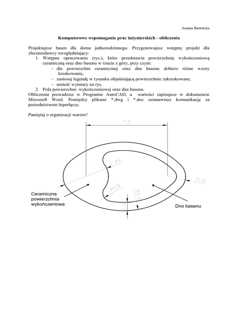 Joanna Bartnicka Komputerowe wspomaganie prac inżynierskich - obliczenia Projektujesz basen dla domu jednorodzinnego. Przygotowujesz wstępny projekt dla zleceniodawcy uwzględniający: 1. Wstępne opracowanie (rys.), które przedstawia powierzchnię wykończeniową ceramiczną oraz dno basenu w rzucie z góry, przy czym: dla powierzchni ceramicznej oraz dna basenu dobierz różne wzory kreskowania, zastosuj legendę w rysunku objaśniającą powierzchnie zakreskowane, umieść wymiary na rys. 2. Pola powierzchni: wykończeniowej oraz dna basenu. Obliczenia prowadzisz w Programie AutoCAD, a wartości zapisujesz w dokumencie Microsoft Word. Pomiędzy plikami *.dwg i *.doc ustanawiasz komunikację za pośrednictwem hiperłączy. Pamiętaj o organizacji warstw! Ceramiczna powierzchnia wykończeniowa Dno basenu