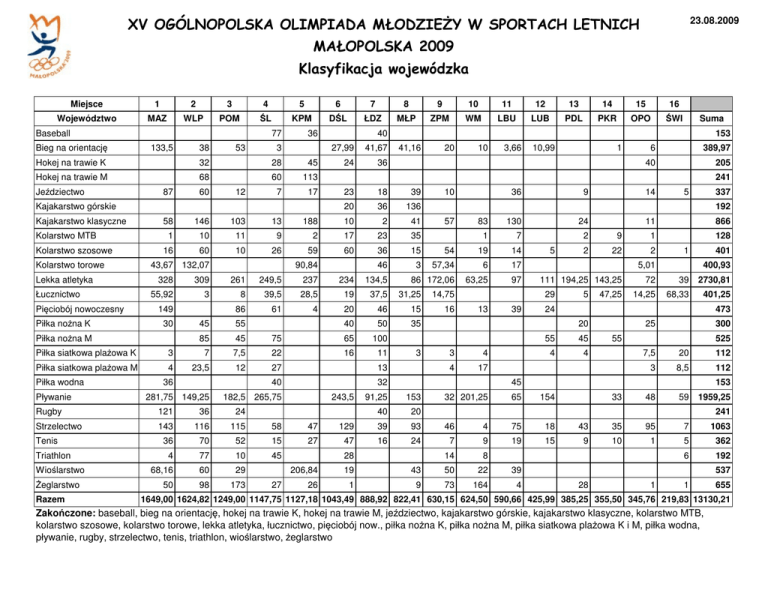 23.08.2009 XV OGÓLNOPOLSKA OLIMPIADA MŁODZIEŻY W SPORTACH LETNICH MAŁOPOLSKA 2009 Klasyfikacja wojewódzka Miejsce 1 2 3 4 5 6 7 8 9 10 11 12 13 14 15 16 Województwo MAZ WLP POM ŚL KPM DŚL ŁDZ MŁP ZPM WM LBU LUB PDL PKR OPO ŚWI 27,99 41,67 24 36 Baseball Bieg na orientację 77 133,5 38 53 36 3 Hokej na trawie K 32 28 45 Hokej na trawie M 68 60 113 Jeździectwo 87 60 12 7 17 Kajakarstwo klasyczne 58 146 103 13 188 Kolarstwo MTB 1 10 11 9 Kolarstwo szosowe 16 60 10 26 Kolarstwo torowe Lekka atletyka Łucznictwo Pięciobój nowoczesny Piłka nożna K 43,67 132,07 20 18 39 20 36 136 10 2 41 2 17 23 35 59 60 36 15 54 3 90,84 46 10 205 866 1 7 2 9 1 128 19 14 2 22 2 57,34 6 17 86 172,06 63,25 97 8 39,5 28,5 19 37,5 31,25 14,75 86 61 4 20 46 15 16 40 50 35 85 45 75 65 100 7 7,5 22 16 11 Piłka siatkowa plażowa M 4 23,5 12 27 13 40 32 243,5 3 5 192 3 3 337 11 55,92 182,5 265,75 40 24 134,5 281,75 149,25 389,97 130 234 36 6 83 57 237 55 1 14 249,5 45 10,99 9 261 30 3,66 36 309 149 10 241 Piłka siatkowa plażowa K Pływanie 41,16 328 Piłka nożna M Piłka wodna 153 40 23 Kajakarstwo górskie Suma 5 39 5 47,25 4 4 17 72 39 2730,81 14,25 68,33 401,25 400,93 473 24 20 3 401 5,01 111 194,25 143,25 29 13 1 55 45 4 4 300 25 525 55 7,5 20 112 3 8,5 112 153 45 91,25 153 32 201,25 65 154 33 48 59 1959,25 241 Rugby 121 36 24 40 20 Strzelectwo 143 116 115 58 47 129 39 93 46 4 75 18 43 35 95 7 1063 36 70 52 15 27 47 16 24 7 9 19 15 9 10 1 5 362 4 77 10 45 14 8 6 192 Tenis Triathlon Wioślarstwo Żeglarstwo Razem 68,16 60 29 50 98 173 27 28 206,84 19 43 50 22 39 26 1 9 73 164 4 537 28 1 1 655 1649,00 1624,82 1249,00 1147,75 1127,18 1043,49 888,92 822,41 630,15 624,50 590,66 425,99 385,25 355,50 345,76 219,83 13130,21 Zakończone: baseball, bieg na orientację, hokej na trawie K, hokej na trawie M, jeździectwo, kajakarstwo górskie, kajakarstwo klasyczne, kolarstwo MTB, kolarstwo szosowe, kolarstwo torowe, lekka atletyka, łucznictwo, pięciobój now., piłka nożna K, piłka nożna M, piłka siatkowa plażowa K i M, piłka wodna, pływanie, rugby, strzelectwo, tenis, triathlon, wioślarstwo, żeglarstwo