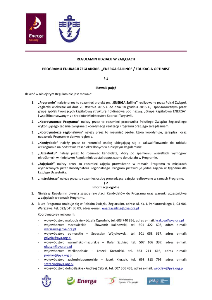 REGULAMIN UDZIAŁU W ZAJĘCIACH PROGRAMU EDUKACJI ŻEGLARSKIEJ „ENERGA SAILING” / EDUKACJA OPTIMIST §1 Słownik pojęd Ilekrod w niniejszym Regulaminie jest mowa o: 1. „Programie” należy przez to rozumied projekt pn. „ENERGA Sailing” realizowany przez Polski Związek Żeglarski w okresie od dnia 20 stycznia 2015 r. do dnia 18 grudnia 2015 r., sponsorowanym przez grupę spółek tworzących kapitałową strukturę holdingową pod nazwą: „Grupa Kapitałowa ENERGA” i współfinansowanym ze środków Ministerstwa Sportu i Turystyki. 2. „Koordynatorze Programu” należy przez to rozumied pracownika Polskiego Związku Żeglarskiego wykonującego zadania związane z koordynacją realizacji Programu oraz jego zarządzaniem. 3. „Koordynatorze regionalnym” należy przez to rozumied osobę, która koordynuje, zarządza oraz nadzoruje Program w danym regionie. 4. „Kandydacie” należy przez to rozumied osobę ubiegającą się o zakwalifikowanie do udziału w Programie na podstawie zasad określonych w niniejszym Regulaminie. 5. „Uczestniku” należy przez to rozumied kandydata, który po spełnieniu wszystkich wymogów określonych w niniejszym Regulaminie został dopuszczony do udziału w Programie. 6. „Zajęciach” należy przez to rozumied zajęcia prowadzone w ramach Programu w miejscach wyznaczonych przez Koordynatora Regionalnego. Program przewiduje jedne zajęcia w tygodniu dla każdego Uczestnika. 7. „Instruktorze” należy przez to rozumied osobę prowadzącą zajęcia realizowane w ramach Programu. §2 Informacje ogólne 1. Niniejszy Regulamin określa zasady rekrutacji Kandydatów do Programu oraz warunki uczestnictwa w zajęciach w ramach Programu. 2. Biuro Programu znajduje się w Polskim Związku Żeglarskim, adres: Al. Ks. J. Poniatowskiego 1, 03-901 Warszawa, tel. 022/541 63 63, adres e-mail: [email protected] Koordynatorzy regionalni: - województwo małopolskie – Józefa Ogrodnik, tel. 603 740 356, adres e-mail: [email protected] województwo mazowieckie – Sławomir Kalinowski, tel. 601 422 608, adres e-mail: [email protected] województwo pomorskie – Sebastian Wójcikowski, tel. 501 058 617, adres e-mail: [email protected] województwo warmiosko-mazurskie – Rafał Szukiel, tel. 507 106 337, adres e-mail: [email protected] województwo wielkopolskie – Leszek Kostaoski, tel. 663 211 616, adres e-mail: [email protected] województwo zachodniopomorskie – Jacek Kierzek, tel. 698 813 795, adres e-mail: [email protected] województwo dolnośląskie - Andrzej Cebrat, tel. 607 306 433, adres e-mail: [email protected] 3. Udział w Programie jest bezpłatny. 4. Uczestnikami programu mogą byd wyłącznie dzieci, które nie brały wcześniej udziału w zorganizowanym szkoleniu żeglarskim oraz w dniu rejestracji do programu nie są członkami sekcji żeglarskich. Osoby biorące udział w Programie w latach poprzednich nie mogą ponownie uczestniczyd. 5. Koszt uczestnictwa w Programie ponosi Polski Związek Żeglarski ze środków otrzymanych na jego realizację od Grupy ENERGA oraz innych Partnerów Programu. 6. Celem Programu jest przeprowadzenie zajęd edukacji żeglarskiej dla dzieci i zaszczepienie pasji do żeglarstwa, kształtowanie pozytywnych postaw oraz zachęcenie do rozpoczęcia żeglarskiej przygody i kontynuowania jej po zakooczeniu Programu w istniejących szkołach i klubach żeglarskich. 7. Zajęcia odbywające się poza Programem w szkołach i klubach żeglarskich mogą byd odpłatne. 8. W ramach Programu organizowane są zajęcia, od marca do grudnia: - zajęcia teoretyczne w formie spotkao moderowanych, warsztatów, gier terenowych, itp.; cykl zajęd edukacyjnych i ogólnorozwojowych na lądzie w miesiącach marzec – kwiecieo oraz listopad - grudzieo; cyklu zajęd praktyczne na wodzie, w formie nauki żeglarstwa, w miesiącach maj – czerwiec/lipiec oraz wrzesieo - październik; regionalne regaty dla uczestników Programu; półkolonia żeglarska dla najzdolniejszych uczestników Programu w miesiącu czerwiec/ lipiec, Zasady kwalifikacji na półkolonie określa oddzielny regulamin. 9. 10. 11. 12. 13. 14. Rekrutacja do Programu rozpoczyna się od dnia 26 stycznia 2015 r. i jest otwarta do dnia 22 lutego 2015 r. lub do wyczerpania miejsc. Data rozpoczęcia została wyznaczona na 2 marca 2015 r. Przewidywana łączna liczba Uczestników w roku 2015 wynosi 100 osób w każdym regionie. Koordynator regionalny może zdecydowad o przyjęciu większej liczby Uczestników. Zajęcia będą prowadzone przez Koordynatora regionalnego oraz wyznaczonych przez niego Instruktorów. Każdy Koordynator regionalny i Instruktor zobowiązany jest do prowadzenia zajęd zgodnie z „Ramowym zakresem szkolenia projektu Energa Sailing” opartym na materiałach dostarczonych przez Polski Związek Żeglarski. Harmonogram zajęd ustalany jest przez Koordynatora regionalnego i zostanie podany ostatecznie do wiadomości zakwalifikowanych uczestników w przed rozpoczęciem zajęd. Polski Związek Żeglarski posiada ubezpieczenie OC w ramach swojej działalności statutowej. §3 Zasady i przebieg rekrutacji 1. Od dnia 26 stycznia 2015 r. Koordynator regionalny przeprowadza rekrutację Uczestników do udziału w zajęciach Programu. 2. Za zorganizowanie i sprawny przebieg procesu rekrutacji odpowiada Koordynator regionalny. 3. Rekrutacja odbywa się w dwojaki sposób: a. 50% Uczestników (50 osób w regionie) pochodzi z naboru przeprowadzanego przez wybrane w drodze konkursu szkoły podstawowe. b. Podstawą udziału w konkursie jest wysłanie na adres Koordynatora regionalnego do dnia 21 lutego listu motywacyjnego pt: „Dlaczego dzieci z mojej szkoły chcą uprawiad żeglarstwo z Energa Sailing” W dniu 22 lutego kapituła konkursowa wybierze najlepsze prace – szkół, które zostaną zaproszone do wyznaczenia Uczestników do Programu. Każda z wybranych szkół będzie mogła wytypowad jednego nauczyciela, który zostanie zaproszony na bezpłatny