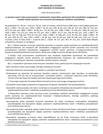 UCHWAŁA NR V/37/2011 RADY MIEJSKIEJ W KOSZALINIE z dnia 20 stycznia 2011 r. w sprawie zasad i trybu przyznawania i pozbawiania stypendiów sportowych dla zawodników osiągających wysokie wyniki sportowe oraz trenerów prowadzących szkolenie zawodników. Na podstawie art. 40 ust. 1 oraz art. 18 ust. 2 pkt 15 ustawy z dnia 8 marca 1990 roku o samorządzie gminnym (Dz.U. z 2001 r. Nr 142, poz. 1591; z 2002 r. Nr 23, poz. 220; Nr 62, poz. 558; Nr 113, poz. 984; Nr 153, poz. 1271; Nr 214, poz. 1806, z 2003 r. Nr 80, poz. 717; Nr 162, poz. 1568, z 2004 r. Nr 102, poz. 1055; Nr 116, poz. 1203, z 2005 r. Nr 172, poz. 1441; Nr 175, poz. 1457, z 2006 r. Nr 17, poz. 128; Nr 181, poz. 1337, z 2007 r. Nr 48, poz. 327; Nr 138, poz. 974; Nr 173, poz. 1218, z 2008 r. Nr 180, poz. 1111; Nr 223, poz. 1458, z 2009 r. Nr 52, poz. 420; Nr 157, poz. 1241, z 2010 r. Nr 28, poz. 142; Nr 28, poz. 146; Nr 106, poz. 675) i art. 31 ust. 3 ustawy z dnia 15 lipca 2010 r. o sporcie (Dz.U. z 2010r. Nr 127, poz. 857; Nr 151, poz. 1014) Rada Miejska w Koszalinie uchwala, co następuje: § 1. 1. Miasto Koszalin przyznaje stypendia sportowe za wysokie wyniki sportowe we współzawodnictwie międzynarodowym lub krajowym dla zawodników osiągających wysokie wyniki sportowe oraz trenerów prowadzących szkolenie zawodników osiągających wysokie wyniki sportowe w międzynarodowym lub krajowym współzawodnictwie sportowym, biorąc pod uwagę znaczenie danego sportu dla Miasta. 2. Zasady i tryb przyznawania i pozbawiania oraz wysokość stypendiów sportowych dla zawodników osiągających wysokie wyniki sportowe we współzawodnictwie krajowym lub międzynarodowym oraz trenerów prowadzących szkolenie zawodników określa niniejsza uchwała. § 2. 1. Stypendium sportowe może otrzymać zawodnik, który spełnia łącznie następujące warunki: 1)jest członkiem klubu sportowego, którego siedzibą jest Koszalin, 2)posiada dokument uprawniający do udziału w zawodach sportowych, 3)zobowiązał się pisemnie do promocji Koszalina poprzez umieszczenie logo Koszalina na garderobie sportowej, o ile nie stoi to w sprzeczności z umowami cywilno – prawnymi zawartymi przez zawodnika, trenera, klub sportowy lub związek sportowy dysponujący jego wizerunkiem, 2. Przyznając stypendia Prezydent Miasta Koszalina bierze pod uwagę następujące kryteria: 1)zawodnik został objęty programem przygotowań do igrzysk olimpijskich lub paraolimpijskich, 2)zawodnik został powołany do kadry narodowej w dyscyplinie olimpijskiej lub dyscyplinie objętej systemem współzawodnictwa dzieci i młodzieży prowadzonym przez Ministerstwo Sportu. 3. Stypendium sportowe może otrzymać trener prowadzący szkolenie zawodników osiągających wysokie wyniki sportowe we współzawodnictwie krajowym i międzynarodowym, którego zawodnicy spełniają przynajmniej jeden z warunków: 1)przynajmniej jeden zawodnik otrzymał powołanie do kadry narodowej w dyscyplinie olimpijskiej, paraolimpijskiej lub dyscyplinie objętej systemem współzawodnictwa dzieci i młodzieży prowadzonym przez Ministerstwo Sportu, 2)przynajmniej jeden zawodnik zdobył medal Pucharu Polski lub Mistrzostw Polski w dyscyplinie olimpijskiej, paraolimpijskiej lub dyscyplinie objętej systemem współzawodnictwa dzieci i młodzieży prowadzonym przez Ministerstwo Sportu, 3)zawodnicy występują w zespole, który zakwalifikował się do finału mistrzostw Polski w dyscyplinie olimpijskiej lub dyscyplinie objętej systemem współzawodnictwa dzieci i młodzieży prowadzonym przez Ministerstwo Sportu. Id: XXMVM-BZOAH-QAJCH-NZSUB-BNUTA. Podpisany Strona 1 4)zawodnicy występują w zespole rozgrywającym mecze w najwyższej klasie rozgrywkowej w dyscyplinie olimpijskiej. § 3. 1. Wniosek o przyznanie stypendium składa związek lub klub sportowy, zrzeszający zawodnika lub trenera, mający siedzibę w Koszalinie, w terminie do dnia 30 października roku poprzedzającego rok kalendarzowy, w którym stypendium będzie wypłacane. 2. Wniosek powinien zawierać: 1)imię i nazwisko zawodnika lub trenera, 2)dokument potwierdzający przynależność zawodnika lub trenera do klubu sportowego, 3)opis osiągnięć sportowych zawodnika lub trenera, 4)zobowiązanie wnioskodawcy do informowania uzasadniających pozbawienie stypendium, Prezydenta Miasta Koszalina o okolicznościach 5)potwierdzenie przynależności do kadry narodowej w danej dyscyplinie sportu przez polski związek sportowy. § 4. Stypendia przyznaje i może pozbawić Prezydent Miasta Koszalina na wniosek związku sportowego lub klubu sportowego, którego członkiem jest zawodnik lub trener po zasięgnięciu opinii Komisji Stypendialnej powołanej przez Prezydenta Miasta Koszalina, w skład której wchodzą: 1)przedstawiciel Wydziału Urzędu Miejskiego merytorycznie odpowiedzialnego za kulturę fizyczną, 2)przedstawiciel Komisji Rady Miejskiej właściwej dla kultury fizycznej, 3)trzech przedstawicieli Rady Sportu, w przypadku braku tego ciała, trzech przedstawicieli środowiska sportowego. § 5. 1. Stypendium przyznaje się na okres roku kalendarzowego. 2. Przyznane stypendia nie podlegają waloryzacji i wypłacane są z góry w miesięcznych transzach do dnia 10 – go każdego miesiąca na wskazany przez zawodnika lub trenera indywidualny rachunek bankowy. 3. Wysokość stypendium będzie określana każdego roku po uchwaleniu budżetu. 4. Wysokość miesięcznego stypendium określa Prezydent Miasta Koszalina w następujących granicach: a) dla zawodnika od 150 zł do 2000 zł, b) dla trenera od 1000 zł do 2000 zł. § 6. 1. Zawodnika pozbawia się stypendium na wniosek władz związku lub klubu sportowego, który reprezentuje dana osoba, jeżeli w okresie jego pobierania: 1)nie realizuje on programu szkoleniowego, 2)została nałożona na niego kara dyscyplinarna przewidziana w statucie danego związku sportowego, 3)zmienił przynależność klubową stając się członkiem klubu sportowego mającego siedzibę poza Koszal