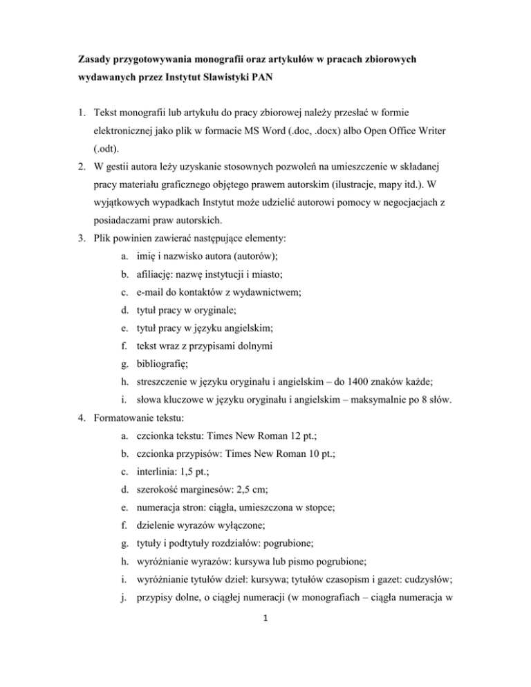 Zasady przygotowywania monografii oraz artykułów w pracach zbiorowych wydawanych przez Instytut Slawistyki PAN 1. Tekst monografii lub artykułu do pracy zbiorowej należy przesłać w formie elektronicznej jako plik w formacie MS Word (.doc, .docx) albo Open Office Writer (.odt). 2. W gestii autora leży uzyskanie stosownych pozwoleń na umieszczenie w składanej pracy materiału graficznego objętego prawem autorskim (ilustracje, mapy itd.). W wyjątkowych wypadkach Instytut może udzielić autorowi pomocy w negocjacjach z posiadaczami praw autorskich. 3. Plik powinien zawierać następujące elementy: a. imię i nazwisko autora (autorów); b. afiliację: nazwę instytucji i miasto; c. e-mail do kontaktów z wydawnictwem; d. tytuł pracy w oryginale; e. tytuł pracy w języku angielskim; f. tekst wraz z przypisami dolnymi g. bibliografię; h. streszczenie w języku oryginału i angielskim – do 1400 znaków każde; i. słowa kluczowe w języku oryginału i angielskim – maksymalnie po 8 słów. 4. Formatowanie tekstu: a. czcionka tekstu: Times New Roman 12 pt.; b. czcionka przypisów: Times New Roman 10 pt.; c. interlinia: 1,5 pt.; d. szerokość marginesów: 2,5 cm; e. numeracja stron: ciągła, umieszczona w stopce; f. dzielenie wyrazów wyłączone; g. tytuły i podtytuły rozdziałów: pogrubione; h. wyróżnianie wyrazów: kursywa lub pismo pogrubione; i. wyróżnianie tytułów dzieł: kursywa; tytułów czasopism i gazet: cudzysłów; j. przypisy dolne, o ciągłej numeracji (w monografiach – ciągła numeracja w 1 ramach rozdziałów). 5. Cytaty: a. cytaty w tekście wyróżnione są cudzysłowem; b. cytaty liczące ponad 40 słów tworzą oddzielne akapity; c. cytaty powinny być opatrzone odnośnikiem do cytowanego miejsca w formie nawiasu [nazwisko autora rok wydania: nr strony], np. [Wilson 1899: 7]; por. niżej. 6. Odnośniki do literatury: a. odnośniki do cytowanej literatury w tekście są zgodne z tzw. systemem oksfordzkim b. nazwiska autorów z rokiem wydania pracy oraz numerami stron umieszczone są w nawiasach kwadratowych w następujących wariantach: [Douglas 1996a: 181], [Douglas 1996a; 1998], [Douglas 1998; Wilson 1899; Trybuś 2000], [Wilson 1899: 134-135; Douglas 1998: 160]; [Nieznańska, Trybuś 2000], [Kowalska (red.) 2005]; przy większej liczbie autorów niż trzech: [Trybuś i in. 1989]; 7. Bibliografia: a. układ alfabetyczny według nazwisk autorów lub redaktorów prac zbiorowych; b. jeśli w bibliografii występuje kilka prac tego samego autora, winny być uporządkowane według roku publikacji; c. jeśli występuje kilka prac jednego autora wydanych w tym samym roku, należy za rokiem dodać literę: a, b, c itd., np. 1920a; d. każdy opis bibliograficzny powinien składać się z następujących elementów: nazwisko autora, pełne imię, rok wydania, tytuł pracy kursywą, ewentualnie imię i nazwisko tłumacza, miejsce wydania: wydawnictwo, np. Bourdieu Pierre, 2005, Dystynkcja. Społeczna krytyka władzy sądzenia, tłum. Piotr Biłos, Warszawa: Wydawnictwo Naukowe Scholar e. prace zbiorowe winny być umieszczone pod nazwiskiem redaktora, np. Mikołajczak Aleksander, Szulc Witold, Zieliński Bogusław (red.), 2004, Idee wspólnotowe Słowiańszczyzny, Poznań: Wydawnictwo Naukowe 2 UAM f. w przypadku artykułów z czasopism należy podać nazwę czasopisma w cudzysłowie, numer tomu oraz numery stron dla całości artykułu, np. Goszczyńska Joanna, 1996a, Zielona woda, „Polska Sztuka Ludowa. Konteksty”, nr 3-4, s. 177-183 Dziemidok Bohdan, 2013, Teoretyczne i praktyczne kłopoty z tożsamością narodową, „Sprawy Narodowościowe” 41, s. 23-53 g. w przypadku artykułów z prac zbiorowych należy stosować zapis: Nowakowska Anna, 1995, Tożsamość, w: Wschodnie pogranicze w perspektywie socjologicznej, red. Andrzej Sadowski, Białystok: Fundacja Ekonomistów Środowiska i Zasobów Naturalnych, s. 155-186. 8. Ilustracje, mapy, wykresy, rysunki, tabele. a. ilustracje, mapy i grafikę należy zamieszczać bezpośrednio w pliku; b. wymagana rozdzielczość: 300 ppi; c. podpisy: bezpośrednio pod ilustracjami i innymi wstawionymi elementami; w przypadku ilustracji i wszelkiego typu materiału graficznego konieczne jest podanie źródła w brzmieniu uzgodnionym z właścicielem autorskich praw majątkowych; d. ilustracje i wykresy czarno-białe; w uzasadnionych wypadkach dopuszczalne są materiały graficzne w kolorze; e. tabele w pionie lub poziomie nie powinny wykraczać poza kolumnę tekstu; winny być opatrzone podpisem; f. wykresy i rysunki z Excela lub innych programów należy wkleić do pliku jako rysunek, dzięki czemu nie ulegną zmianie przy składzie tekstu. 9. Jeżeli tekst zawiera nietypowe czcionki, należy do pliku z pracą dołączyć odpowiednie fonty; czcionki należy umieścić w tekście za pomocą funkcji „Osadzanie czcionek TrueType”. 3