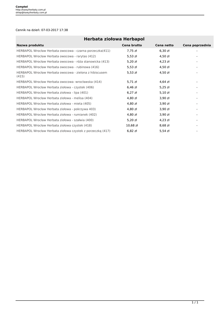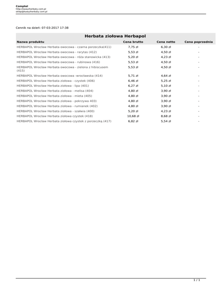 Comptel http://kawyiherbaty.com.pl [email protected] Cennik na dzień: 07-03-2017 17:38 Herbata ziołowa Herbapol Nazwa produktu Cena brutto Cena netto Cena poprzednia HERBAPOL Wrocław Herbata owocowa - czarna porzeczka(411) 7,75 zł 6,30 zł - HERBAPOL Wrocław Herbata owocowa - rarytas (412) 5,53 zł 4,50 zł - HERBAPOL Wrocław Herbata owocowa - róża stanowicka (413) 5,20 zł 4,23 zł - HERBAPOL Wrocław Herbata owocowa - rubinowa (416) 5,53 zł 4,50 zł - HERBAPOL Wrocław Herbata owocowa - zielona z hibiscusem (415) 5,53 zł 4,50 zł - HERBAPOL Wrocław Herbata owocowa -wrocławska (414) 5,71 zł 4,64 zł - HERBAPOL Wrocław Herbata ziołowa - czystek (406) 6,46 zł 5,25 zł - HERBAPOL Wrocław Herbata ziołowa - lipa (401) 6,27 zł 5,10 zł - HERBAPOL Wrocław Herbata ziołowa - melisa (404) 4,80 zł 3,90 zł - HERBAPOL Wrocław Herbata ziołowa - mieta (405) 4,80 zł 3,90 zł - HERBAPOL Wrocław Herbata ziołowa - pokrzywa 403) 4,80 zł 3,90 zł - HERBAPOL Wrocław Herbata ziołowa - rumianek (402) 4,80 zł 3,90 zł - HERBAPOL Wrocław Herbata ziołowa - szałwia (400) 5,20 zł 4,23 zł - HERBAPOL Wrocław Herbata ziołowa czystek (418) 10,68 zł 8,68 zł - 6,82 zł 5,54 zł - HERBAPOL Wrocław Herbata ziołowa czystek z porzeczką (417) 1/1 Powered by TCPDF (www.tcpdf.org)