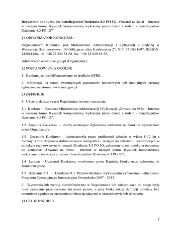 Regulamin konkursu dla beneficjentów Działania 8.3 PO IG „Otwarci na świat – Internet w naszym domu. Rysunek komputerowy wykonany przez dzieci z rodzin - beneficjentów Działania 8.3 PO IG” §1 ORGANIZATOR KONKURSU Organizatorem Konkursu jest Ministerstwo Administracji i Cyfryzacji z siedzibą w Warszawie (kod pocztowy: 00-060), przy ulicy Królewskiej 27, NIP: 5213621697, REGON: 145881488, tel. +48 22 245 54 50, fax. +48 22 829 48 52, Adres www: www.mac.gov.pl (Organizator). §2 POSTANOWIENIA OGÓLNE 1. Konkurs jest współfinansowany ze środków EFRR. 2. Informacje na temat ewentualnych patronatów honorowych lub medialnych zostaną ogłoszone na stronie www.mac.gov.pl. §3 DEFINICJE 1. Użyte w dalszej części Regulaminu terminy oznaczają: 1.1 Konkurs - Konkurs Ministerstwa Administracji i Cyfryzacji „Otwarci na świat – Internet w naszym domu. Rysunek komputerowy wykonany przez dzieci z rodzin - beneficjentów Działania 8.3 PO IG”, 1.2 Kapituła Konkursu – osoby oceniające Zgłoszenia nadesłane na Konkurs wyznaczone przez Organizatora. 1.3 Uczestnik Konkursu – (autor/autorka pracy graficznej) dziecko w wieku 8-12 lat z rodziny, która otrzymała dofinansowanie komputera i dostępu do Internetu, uczestniczące w projekcie realizowanym w ramach Działania 8.3 PO IG, zgłoszone przez opiekuna prawnego do konkursu: „Otwarci na świat – Internet w naszym domu. Rysunek komputerowy wykonany przez dzieci z rodzin - beneficjentów Działania 8.3 PO IG”, 1.4 Laureat - Uczestnik Konkursu, wyróżniony przez Kapitułę Konkursu za zgłoszoną do Konkursu pracę. 1.5 Działanie 8.3 – Działanie 8.3: Przeciwdziałanie wykluczeniu cyfrowemu - eInclusion, Programu Operacyjnego Innowacyjna Gospodarka 2007 - 2013. 2. Wyrażenia lub zwroty niezdefiniowane w Regulaminie lub załącznikach do niego będą mieć znaczenie przypisywane im przez prawo, a przy braku takiej definicji powinny być rozumiane zgodnie ze znaczeniami obowiązującymi w orzecznictwie lub doktrynie. §4 CEL KONKURSU 1 Konkurs ma na celu promocję Działania 8.3 PO IG poprzez uhonorowanie najciekawszych prac graficznych wykonanych przez dzieci z rodzin uczestniczących w projektach w ramach w/w działania. §5 UCZESTNICY KONKURSU 1. W konkursie „Otwarci na świat – Internet w naszym domu. Rysunek komputerowy wykonany przez dzieci z rodzin - beneficjentów Działania 8.3 PO IG” mogą wziąć udział dzieci w wieku 8 – 12 lat z rodzin, które otrzymały dofinansowanie do komputera i dostępu do Internetu, uczestniczące w projekcie realizowanym w ramach Działania 8.3 PO IG, zgłoszone do konkursu przez opiekuna prawnego. §6 WARUNKI UDZIAŁU W KONKURSIE 1. Konkurs jest jednoetapowy. 2. Warunkiem udziału w Konkursie „Otwarci na świat – Internet w naszym domu. Rysunek komputerowy wykonany przez dzieci z rodzin - beneficjentów Działania 8.3 PO IG” jest przesłanie drogą elektroniczną przez Uczestnika Konkursu Zgłoszenia Konkursowego stanowiącego Załącznik nr 1 oraz pliku graficznego w formacie .jpg, .ttf, .bmp, .dib, .gif, .png nie większym niż 2,5 MB, związanego tematycznie z treścią konkursu, w terminie do dnia 1 grudnia 2014 roku na adres e-mail: [email protected] lub [email protected]. W konkursie „Otwarci na świat – Internet w naszym domu. Rysunek komputerowy wykonany przez dzieci z rodzin - beneficjentów Działania 8.3 PO IG” osoby reprezentujące autorów nadesłanych prac powinni również przesłać drogą elektroniczną oświadczenie o uczestnictwie w projekcie w ramach Działania 8.3 PO IG (załącznik nr 1) oraz oświadczenia na potrzeby praw autorskich (załącznik nr 2). W przypadku braku wypełnionego załącznika nr 1 lub 2 osoby reprezentujące autorów nadesłanych prac zostaną przez Organizatora wezwane do jego wypełnienia przed przyznaniem nagród. Brak wypełnionych załączników pomimo wezwania przez Organizatora do ich uzupełnienia uniemożliwia ostateczne zakwalifikowanie pracy do konkursu. 3. Zgłoszenie Konkursowe należy przesłać za pomocą poczty elektronicznej na adres: [email protected] lub przemysł[email protected], wpisując w temacie wiadomości e-mail: „Otwarci na świat” lub „Internet w naszym domu”. 4. Zgłoszenie Konkursowe należy przygotować w języku polskim. 5. Jeden Uczestnik Konkursu może przygotować tylko jedno Zgłoszenie Konkursowe. W przypadku przesłania przez Uczestnika Konkursu kilku Zgłoszeń Konkursowych – żadne z nich nie zostanie przyjęte do Konkursu. 6. Zgłoszenia Konkursowe nadesłane po terminie nie będą rozpatrywane. §7 ZASADY WYBORU LAUREATÓW KONKURSU 2 1. Spośród prac zgłoszonych do udziału w konkursie „Otwarci na świat – Internet w naszym domu. Rysunek komputerowy wykonany przez dzieci z rodzin - beneficjentów Działania 8.3 PO IG” Kapituła Konkursu wybierze 12 prac, wskazując jednocześnie Laureatów konkursu. §8 KAPITUŁA KONKURSU 1. Zgłoszenia Konkursowe będą oceniane przez Kapitułę Konkursu wybraną przez Organizatora. Kapituła składa się z co najmniej trzech osób. 2. Sekretariat Konkursu – pan Mariusz Dąbrowski, e-mail: [email protected] 3. Kapituła Konkursu przyzna 12 równorzędnych nagród. 4. Organizator oraz Kapituła mogą wykluczyć Uczestnika Konkursu z udziału w Konkursie w przypadku naruszenia postanowień niniejszego Regulaminu. 5. Organizator zastrzega sobie prawo dokonywania zmian w niniejszym Regulaminie oraz zawieszenia lub zakończenia Konkursu bez rozstrzygnięcia, w przypadku gdy Zgłoszenia konkursowe nie będą spełniały wymogów założonych przez Organizatora lub z innych przyczyn. 6. Wynik Konkursu jest ostateczny i nie podlega zaskarżeniu do sądu powszechnego. §9 NAGRODY W KONKURSIE 1. Każdy Laureat Konkursu otrzyma jedną nagrodę-niespodziankę ufundowaną przez Organizatora. 2. Kapituła Konkursu może zadecydować o przyznaniu dodatkowych nagród i wyróżnień. §10 INFORMOWANIE LAUREATA O PRZYZNANIU IM NAGRÓD I