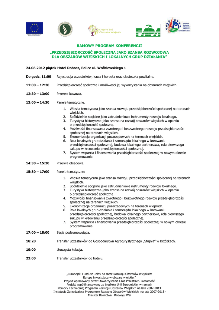 RAMOWY PROGRAM KONFERENCJI „PRZEDSIĘBIORCZOŚĆ SPOŁECZNA JAKO SZANSA ROZWOJOWA DLA OBSZARÓW WIEJSKICH I LOKALNYCH GRUP DZIAŁANIA” 24.08.2012 piątek Hotel Dobosz, Police ul. Wróblewskiego 1 Do godz. 11:00 Rejestracja uczestników, kawa i herbata oraz ciasteczka powitalne. 11:00 – 12:30 Przedsiębiorczość społeczna i możliwości jej wykorzystania na obszarach wiejskich. 12:30 – 13:00 Przerwa kawowa. 13:00 – 14:30 Panele tematyczne: 1. 2. 3. 4. 5. 6. 7. Wioska tematyczna jako szansa rozwoju przedsiębiorczości społecznej na terenach wiejskich. Spółdzielnie socjalne jako zatrudnieniowe instrumenty rozwoju lokalnego. Turystyka historyczna-jako szansa na rozwój obszarów wiejskich w oparciu o przedsiębiorczość społeczną. Możliwości finansowania zwrotnego i bezzwrotnego rozwoju przedsiębiorczości społecznej na terenach wiejskich. Ekonomizacja organizacji pozarządowych na terenach wiejskich. Rola lokalnych grup działania i samorządu lokalnego w kreowaniu przedsiębiorczości społecznej, budowa lokalnego partnerstwa, rola pierwszego zakupu w kreowaniu przedsiębiorczości społecznej. System wsparcia i finansowania przedsiębiorczości społecznej w nowym okresie programowania. 14:30 – 15:30 Przerwa obiadowa. 15:30 – 17:00 Panele tematyczne: 1. 2. 3. 4. 5. 6. 7. Wioska tematyczna jako szansa rozwoju przedsiębiorczości społecznej na terenach wiejskich. Spółdzielnie socjalne jako zatrudnieniowe instrumenty rozwoju lokalnego. Turystyka historyczna-jako szansa na rozwój obszarów wiejskich w oparciu o przedsiębiorczość społeczną. Możliwości finansowania zwrotnego i bezzwrotnego rozwoju przedsiębiorczości społecznej na terenach wiejskich. Ekonomizacja organizacji pozarządowych na terenach wiejskich. Rola lokalnych grup działania i samorządu lokalnego w kreowaniu przedsiębiorczości społecznej, budowa lokalnego partnerstwa, rola pierwszego zakupu w kreowaniu przedsiębiorczości społecznej. System wsparcia i finansowania przedsiębiorczości społecznej w nowym okresie programowania. 17:00 – 18:00 Sesja podsumowująca. 18:20 Transfer uczestników do Gospodarstwa Agroturystycznego „Stajnia” w Brzózkach. 19:00 Uroczysta kolacja. 23:00 Transfer uczestników do hotelu. „Europejski Fundusz Rolny na rzecz Rozwoju Obszarów Wiejskich: Europa inwestująca w obszary wiejskie.” Projekt opracowany przez Stowarzyszenie Czas Przestrzeń Tożsamość Projekt współfinansowany ze środków Unii Europejskiej w ramach Pomocy Technicznej Programu Rozwoju Obszarów Wiejskich na lata 2007-2013 Instytucja Zarządzająca Programem Rozwoju Obszarów Wiejskich na lata 2007-2013 Minister Rolnictwa i Rozwoju Wsi 25.08.2012 sobota, Nowe Warpno 8:20 Transfer uczestników z hotelu do miejsca realizacji konferencji oraz Targów. 9:00 – 9:10 Przed sesją kawa, herbata, poczęstunek. 9:10 – 9:20 Rozpoczęcie spotkania, przywitanie zaproszonych gości i prelegentów. Prezentacja koncepcji Krajowego Programu Wsparcia Ekonomii Społecznej ze szczególnym uwzględnieniem możliwości przyszłego okresu programowania i rozwoju obszarów wiejskich. Ekonomia społeczna dziś-możliwości, wyzwania oraz perspektywy rozwoju w regionie zachodniopomorskim w kontekście rozwoju obszarów wiejskich. 9:20 – 9:50 9:50 – 10:20 10:20 – 10:40 Finansowanie zwrotne rozwoju przedsiębiorstw społecznych i ich otoczenia. 10:40 – 11:00 Przerwa kawowa. 11:00 – 11:35 Mapa ekonomii społecznej. Prezentacja kondycji podmiotów ekonomii społecznej w województwie wraz z infrastrukturą wsparcia oraz otoczeniem instytucjonalnym i finansowym. 11:35 – 11:50 System wsparcia ekonomii społecznej w województwie zachodniopomorskim. 11:50 – 12:00 Podsumowanie spotkania. 12:00 – 13:00 Obiad. Zakwaterowanie uczestników: Hotel Dobosz ul. Wróblewskiego 1 72-010 Police WWW.hoteldobosz.pl Biuro konferencji: Rekrutacja na Konferencję: Katarzyna Jaroszewicz tel. kom. 508623296, e-mail: [email protected] Iwona Giers tel. kom. 508623294, e-mail: [email protected] Biuro Konferencji: 72-010 Police, ul. Szkolna 2 tel. +48 91 852 22 59, fax. +48 91 852 20 38 e-mail: [email protected] „Europejski Fundusz Rolny na rzecz Rozwoju Obszarów Wiejskich: Europa inwestująca w obszary wiejskie.” Projekt opracowany przez Stowarzyszenie Czas Przestrzeń Tożsamość Projekt współfinansowany ze środków Unii Europejskiej w ramach Pomocy Technicznej Programu Rozwoju Obszarów Wiejskich na lata 2007-2013 Instytucja Zarządzająca Programem Rozwoju Obszarów Wiejskich na lata 2007-2013 Minister Rolnictwa i Rozwoju Wsi