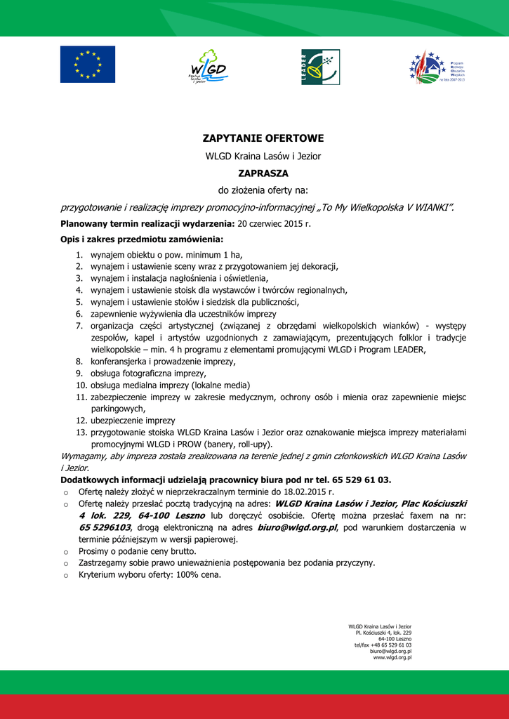 ZAPYTANIE OFERTOWE WLGD Kraina Lasów i Jezior ZAPRASZA do złożenia oferty na: przygotowanie i realizację imprezy promocyjno-informacyjnej „To My Wielkopolska V WIANKI”. Planowany termin realizacji wydarzenia: 20 czerwiec 2015 r. Opis i zakres przedmiotu zamówienia: 1. 2. 3. 4. 5. 6. 7. 8. 9. 10. 11. 12. 13. wynajem obiektu o pow. minimum 1 ha, wynajem i ustawienie sceny wraz z przygotowaniem jej dekoracji, wynajem i instalacja nagłośnienia i oświetlenia, wynajem i ustawienie stoisk dla wystawców i twórców regionalnych, wynajem i ustawienie stołów i siedzisk dla publiczności, zapewnienie wyżywienia dla uczestników imprezy organizacja części artystycznej (związanej z obrzędami wielkopolskich wianków) - występy zespołów, kapel i artystów uzgodnionych z zamawiającym, prezentujących folklor i tradycje wielkopolskie – min. 4 h programu z elementami promującymi WLGD i Program LEADER, konferansjerka i prowadzenie imprezy, obsługa fotograficzna imprezy, obsługa medialna imprezy (lokalne media) zabezpieczenie imprezy w zakresie medycznym, ochrony osób i mienia oraz zapewnienie miejsc parkingowych, ubezpieczenie imprezy przygotowanie stoiska WLGD Kraina Lasów i Jezior oraz oznakowanie miejsca imprezy materiałami promocyjnymi WLGD i PROW (banery, roll-upy). Wymagamy, aby impreza została zrealizowana na terenie jednej z gmin członkowskich WLGD Kraina Lasów i Jezior. Dodatkowych informacji udzielają pracownicy biura pod nr tel. 65 529 61 03. o Ofertę należy złożyć w nieprzekraczalnym terminie do 18.02.2015 r. o Ofertę należy przesłać pocztą tradycyjną na adres: WLGD Kraina Lasów i Jezior, Plac Kościuszki 4 lok. 229, 64-100 Leszno lub doręczyć osobiście. Ofertę można przesłać faxem na nr: 65 5296103, drogą elektroniczną na adres [email protected], pod warunkiem dostarczenia w terminie późniejszym w wersji papierowej. o Prosimy o podanie ceny brutto. o Zastrzegamy sobie prawo unieważnienia postępowania bez podania przyczyny. o Kryterium wyboru oferty: 100% cena. WLGD Kraina Lasów i Jezior Pl. Kościuszki 4, lok. 229 64-100 Leszno tel/fax +48 65 529 61 03 [email protected] www.wlgd.org.pl