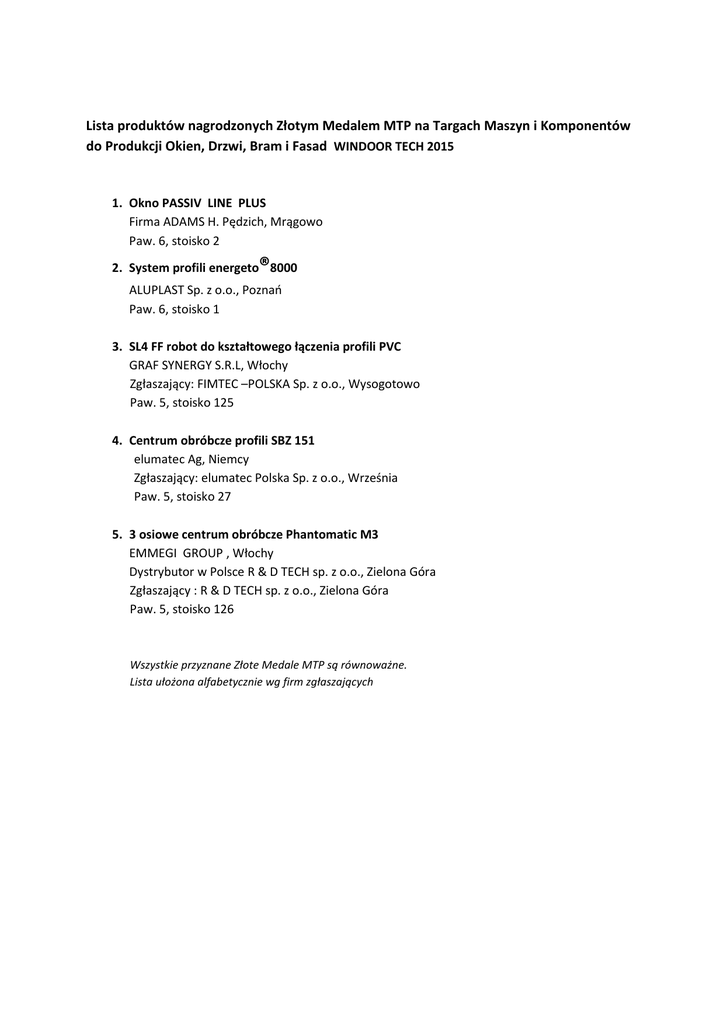 Lista produktów nagrodzonych Złotym Medalem MTP na Targach Maszyn i Komponentów do Produkcji Okien, Drzwi, Bram i Fasad WINDOOR TECH 2015 1. Okno PASSIV LINE PLUS Firma ADAMS H. Pędzich, Mrągowo Paw. 6, stoisko 2 ® 2. System profili energeto 8000 ALUPLAST Sp. z o.o., Poznań Paw. 6, stoisko 1 3. SL4 FF robot do kształtowego łączenia profili PVC GRAF SYNERGY S.R.L, Włochy Zgłaszający: FIMTEC –POLSKA Sp. z o.o., Wysogotowo Paw. 5, stoisko 125 4. Centrum obróbcze profili SBZ 151 elumatec Ag, Niemcy Zgłaszający: elumatec Polska Sp. z o.o., Września Paw. 5, stoisko 27 5. 3 osiowe centrum obróbcze Phantomatic M3 EMMEGI GROUP , Włochy Dystrybutor w Polsce R & D TECH sp. z o.o., Zielona Góra Zgłaszający : R & D TECH sp. z o.o., Zielona Góra Paw. 5, stoisko 126 Wszystkie przyznane Złote Medale MTP są równoważne. Lista ułożona alfabetycznie wg firm zgłaszających