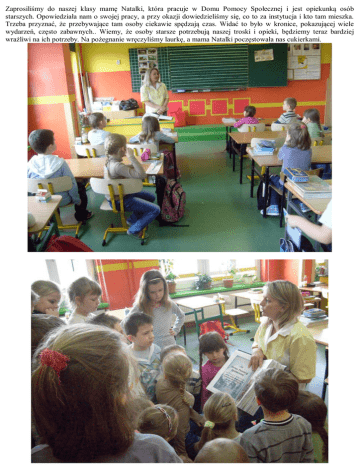Zaprosiliśmy do naszej klasy mamę Natalki, która pracuje w Domu Pomocy Społecznej i jest opiekunką osób starszych. Opowiedziała nam o swojej pracy, a przy okazji dowiedzieliśmy się, co to za instytucja i kto tam mieszka. Trzeba przyznać, że przebywające tam osoby ciekawie spędzają czas. Widać to było w kronice, pokazującej wiele wydarzeń, często zabawnych.. Wiemy, że osoby starsze potrzebują naszej troski i opieki, będziemy teraz bardziej wrażliwi na ich potrzeby. Na pożegnanie wręczyliśmy laurkę, a mama Natalki poczęstowała nas cukierkami.
