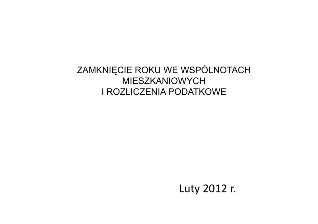 ZAMKNIĘCIE ROKU WE WSPÓLNOTACH MIESZKANIOWYCH I ROZLICZENIA PODATKOWE Luty 2012 r. ZAMKNIĘCIE ROKU WE WSPÓLNOTACH MIESZKANIOWYCH I ROZLICZENIA PODATKOWE • Ewidencja księgowa typowych zdarzeń gospodarczych • Ustalenie wyniku finansowego we wspólnocie mieszkaniowej • Przygotowanie zeznania o wysokości osiągniętych przychodów i poniesionych kosztów • Wspólnota mieszkaniowa w świetle ustawy o podatku od towarów i usług Ewidencja księgowa typowych zdarzeń gospodarczych Sposób prowadzenia ewidencji księgowej • art. 9 ust. 1 ustawy o pdop stanowi, że podatnicy są zobowiązani do prowadzenia ewidencji rachunkowej, zgodnie z odrębnymi przepisami, w sposób zapewniający określenie wysokości dochodu (straty), podstawy opodatkowania i wysokości należnego podatku za rok podatkowy • art. 2 ust. 1 pkt 5 ustawy z dnia 29 września 1994 r. o rachunkowości (Dz.U. nr 121, poz. 591 ze zm.) stanowi, że przepisy ustawy stosuje się do jednostek organizacyjnych niemających osobowości prawnej z wyjątkiem spółek osobowych • rozporządzenie ministra finansów z 15 listopada 2001 r. w sprawie szczególnych zasad rachunkowości niektórych jednostek niebędących spółkami handlowymi, nieprowadzących działalności gospodarczej (Dz.U. nr 137, poz. 1539 ze zm.) nie odnosi się wprost do wspólnot mieszkaniowych Ewidencja księgowa typowych zdarzeń gospodarczych Sposób prowadzenia ewidencji księgowej • art. 29 ust. 1 u.w.l. stanowi, iż zarząd lub zarządca, któremu zarząd nieruchomością wspólną powierzono, jest obowiązany prowadzić dla każdej nieruchomości wspólnej określoną przez wspólnotę mieszkaniową ewidencję pozaksięgową kosztów zarządu nieruchomością wspólną oraz zaliczek uiszczanych na pokrycie tych kosztów, a także rozliczeń z innych tytułów na rzecz nieruchomości wspólnej • art. 22 ust. 3 pkt 10 u.w.l. stanowi, iż zakres i sposób prowadzenia ewidencji dokumentującej uzyskiwane przychody i ponoszone koszty zależy wyłącznie od uchwały podjętej przez członków wspólnoty mieszkaniowej Ewidencja księgowa typowych zdarzeń gospodarczych Sposób prowadzenia ewidencji księgowej • Ustawa o własności lokali zwalnia wspólnoty mieszkaniowe z prowadzenia ewidencji według zasad określonych w ustawie o rachunkowości • Nie oznacza to wprowadzenia zakazu stosowania przez wspólnotę mieszkaniową zasad określonych w ustawie o rachunkowości lub rozporządzeniu ministra finansów z 15 listopada 2001 r. Ewidencja księgowa typowych zdarzeń gospodarczych Plan kont wspólnoty mieszkaniowej • • • • • • • • Konto 13 „Rachunek bankowy” Konto 20 „Rozrachunki z właścicielami lokali” Konto 21 „Rozrachunki z dostawcami” Konto 22 „Rozrachunki publicznoprawne” Konto 24 „Pozostałe rozrachunki” Konto 40 „Koszty” Konto 70 „Przychody” Konto 80 „Wynik finansowy i jego rozliczenie” Ewidencja księgowa typowych zdarzeń gospodarczych Dowody księgowe (art. 20 ustawy o rachunkowości) • Zewnętrzne obce – otrzymane od kontrahentów • Zewnętrzne własne – przekazywane w oryginale kontrahentom • Wewnętrzne – dotyczące operacji wewnątrz jednostki Ewidencja księgowa typowych zdarzeń gospodarczych Dowody księgowe (art. 20 ustawy o rachunkowości) • Zbiorcze – służące do dokonania łącznych zapisów zbioru dowodów źródłowych, które muszą być w dowodzie zbiorczym pojedynczo wymienione • Korygujące poprzednie zapisy • Zastępcze – wystawione do czasu otrzymania zewnętrznego obcego dowodu źródłowego • Rozliczeniowe – ujmujące już dokonane zapisy według nowych kryteriów klasyfikacyjnych Ewidencja księgowa typowych zdarzeń gospodarczych Dowody księgowe (art. 21 ustawy o rachunkowości) Dowód księgowy powinien zawierać co najmniej: • Określenie rodzaju dowodu i jego numeru identyfikacyjnego • Określenie stron (nazwy, adresy) dokonujących operacji gospod. • Opis operacji oraz jej wartość, jeżeli to możliwe, określoną także w jednostkach naturalnych • Datę dokonania operacji, a gdy dowód został sporządzony pod inną datą – także datę sporządzenia dowodu • Podpisy wystawcy dowodu oraz osoby, której wydano lub od której przyjęto składniki aktywów • Stwierdzenie sprawdzenia i zakwalifikowania dowodu do ujęcia w księgach rachunkowych przez wskazanie miejsca i sposobu ujęcia Wynik finansowy wspólnoty mieszkaniowej Przychody wspólnoty mieszkaniowej • Zaliczki wnoszone przez członków wspólnoty • Przychody z najmu wspólnych części nieruchomości • Przychody z tytułu odsetek od środków na rachunku bankowym • Przychody ze sprzedaży składników majątkowych wspólnoty • Opłaty za zamieszczenie reklam na budynku wspólnoty • Odszkodowania z tytułu ubezpieczeń majątkowych Wynik finansowy wspólnoty mieszkaniowej Koszty wspólnoty mieszkaniowej • Wydatki na remonty i bieżącą konserwację • Opłaty za dostawę energii elektrycznej i cieplnej, gazu i wody, w części dotyczącej nieruchomości wspólnej, oraz opłaty za antenę zbiorczą i windę • Ubezpieczenia, podatki i inne opłaty publicznoprawne, chyba że są pokrywane bezpośrednio przez właścicieli poszczególnych lokali • Wydatki na utrzymanie porządku i czystości • Wynagrodzenie członków zarządu lub zarządcy • Koszty sądowe związane z dochodzeniem należności czynszowych od najemców Przygotowanie zeznania o wysokości osiągniętych przychodów i kosztów • Art. 17 ust. 1 pkt 44 ustawy o pdop stanowi, iż wolne od podatku są dochody spółdzielni mieszkaniowej, wspólnot mieszkaniowych, towarzystw budownictwa społecznego oraz samorządowych jednostek organizacyjnych prowadzących działalność w zakresie gospodarki mieszkaniowej uzyskane z gospodarki zasobami mieszkaniowymi – w części przeznaczonej na cele związane z utrzymaniem tych zasobów, z wyłączeniem dochodów uzyskanych z innej 