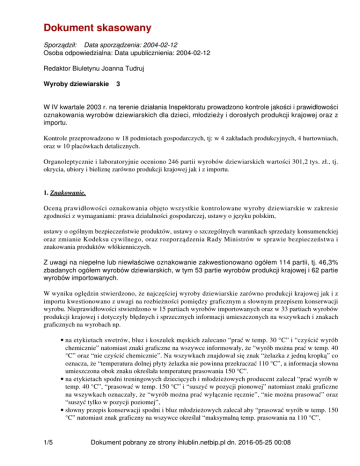 Dokument skasowany Sporządził: Data sporządzenia: 2004-02-12 Osoba odpowiedzialna: Data upublicznienia: 2004-02-12 Redaktor Biuletynu Joanna Tudruj Wyroby dziewiarskie 3 W IV kwartale 2003 r. na terenie działania Inspektoratu prowadzono kontrole jakości i prawidłowości oznakowania wyrobów dziewiarskich dla dzieci, młodzieży i dorosłych produkcji krajowej oraz z importu. Kontrole przeprowadzono w 18 podmiotach gospodarczych, tj: w 4 zakładach produkcyjnych, 4 hurtowniach, oraz w 10 placówkach detalicznych. Organoleptycznie i laboratoryjnie oceniono 246 partii wyrobów dziewiarskich wartości 301,2 tys. zł., tj. okrycia, ubiory i bieliznę zarówno produkcji krajowej jak i z importu. 1. Znakowanie. Oceną prawidłowości oznakowania objęto wszystkie kontrolowane wyroby dziewiarskie w zakresie zgodności z wymaganiami: prawa działalności gospodarczej, ustawy o języku polskim, ustawy o ogólnym bezpieczeństwie produktów, ustawy o szczególnych warunkach sprzedaży konsumenckiej oraz zmianie Kodeksu cywilnego, oraz rozporządzenia Rady Ministrów w sprawie bezpieczeństwa i znakowania produktów włókienniczych. Z uwagi na niepełne lub niewłaściwe oznakowanie zakwestionowano ogółem 114 partii, tj. 46,3% zbadanych ogółem wyrobów dziewiarskich, w tym 53 partie wyrobów produkcji krajowej i 62 partie wyrobów importowanych. W wyniku oględzin stwierdzono, że najczęściej wyroby dziewiarskie zarówno produkcji krajowej jak i z importu kwestionowano z uwagi na rozbieżności pomiędzy graficznym a słownym przepisem konserwacji wyrobu. Nieprawidłowości stwierdzono w 15 partiach wyrobów importowanych oraz w 33 partiach wyrobów produkcji krajowej i dotyczyły błędnych i sprzecznych informacji umieszczonych na wszywkach i znakach graficznych na wyrobach np. • na etykietach swetrów, bluz i koszulek męskich zalecano “prać w temp. 30 °C” i “czyścić wyrób chemicznie” natomiast znaki graficzne na wszywce informowały, że “wyrób można prać w temp. 40 °C” oraz “nie czyścić chemicznie”. Na wszywkach znajdował się znak “żelazka z jedną kropką” co oznacza, że “temperatura dolnej płyty żelazka nie powinna przekraczać 110 °C”, a informacja słowna umieszczona obok znaku określała temperaturę prasowania 150 °C”. • na etykietach spodni treningowych dziecięcych i młodzieżowych producent zalecał “prać wyrób w temp. 40 °C”, “prasować w temp. 150 °C” i “suszyć w pozycji pionowej” natomiast znaki graficzne na wszywkach oznaczały, że “wyrób można prać wyłącznie ręcznie”, “nie można prasować” oraz “suszyć tylko w pozycji poziomej”, • słowny przepis konserwacji spodni i bluz młodzieżowych zalecał aby “prasować wyrób w temp. 150 °C” natomiast znak graficzny na wszywce określał “maksymalną temp. prasowania na 110 °C”, 1/5 Dokument pobrany ze strony ihlublin.netbip.pl dn. 2016-05-25 00:08 • na etykietach spodni treningowych dla dorosłych słowny przepis konserwacji zalecał “czyścić wyrób chemicznie” a znak graficzny na wszywce “nie czyścić wyrobu chemicznie”. • na etykietach spodni i bluz dziecięcych oraz podkoszulek męskich słowny przepis konserwacji określał, że “wyrób można prać mechanicznie w temp. 40 °C. Oddziaływanie mechaniczne, płukanie i wirowanie odpowiadające procesowi OCHRONNEMU” natomiast znak graficzny na wszywce zalecał, że “wyrób można prać mechanicznie w temp. 40°C. Oddziaływanie mechaniczne, płukanie i wirowanie odpowiadające procesowi NORMALNEMU”. • producent na etykietach jednostkowych bluz i bezrękawników młodzieżowych zalecał “nie czyścić chemicznie wyrobu” natomiast znak graficzny na wszywce zalecał, że “wyrób można czyścić chemicznie”. • na etykietach swetrów, golfów i półgolfów męskich umieścił przepis konserwacji: “prać wyrób wyłącznie ręcznie przez wygniatanie w temp. 40 °C” i “nie prasować !” natomiast znaki graficzne na wszywce informowały, że wyrób można prać mechanicznie” oraz “prasować w temp. 110 °C”, • na etykietach swetrów męskich podano przepis konserwacji, który zalecał “prać wyrób tylko ręcznie w temp. 30 °C, nie prać mechanicznie, obchodzić się ostrożnie z wyrobem przy praniu” oraz “nie czyścić wyrobu chemicznie” natomiast znaki graficzne na wszywce oznaczały, że “wyrób można prać mechanicznie” i “czyścić chemicznie”. • na etykietach bluzek damskich producent, umieścił przepis konserwacji, który zalecał “prać wyrób w max. temp. 30 °C” natomiast znak graficzny określał “temp. prania na 40 °C”, • przepis konserwacji na etykietach bluzek damskich określał, że “wyrób należy suszyć w pozycji pionowej na wieszaku” a znak graficzny na wszywce: “wyrób suszyć tylko w pozycji poziomej”, • na etykietach swetrów i bluzek damskich producent, umieścił przepis konserwacji: “prasować wyrób w temp. 110 °C”, “nie czyścić chemicznie” oraz “suszyć w pozycji pionowej” natomiast znaki graficzne na wszywce oznaczały, że “wyrób nie może być prasowany”, “nie może być czyszczony chemicznie” oraz “suszony tylko w pozycji poziomej”, • na etykietach swetrów damskich przepis konserwacji określał, że “wyrób można prać tylko ręcznie w temp. 40 °C” i “nie prasować” natomiast znaki graficzne na wszywce informowały, że “wyrób można prać mechanicznie w temp. nie przekraczającej 30 °C” oraz “prasować wyrób a temp. dolnej płyty żelazka nie powinna przekraczać 110 °C”. Brak nazwy i adresu producenta stwierdzono w 18 partiach wyrobów dziewiarskich, tj: w golfach dziewczęcych, w bluzach dziecięcych i damskich, kamizelkach, spódnicach i sukienkach dziewczęcych Brak nazwy i adresu importera, kraju pochodzenia produktu oraz nazwy wyrobu stwierdzono w 47 partiach wyrobów tj. w getrach i figach dziecię